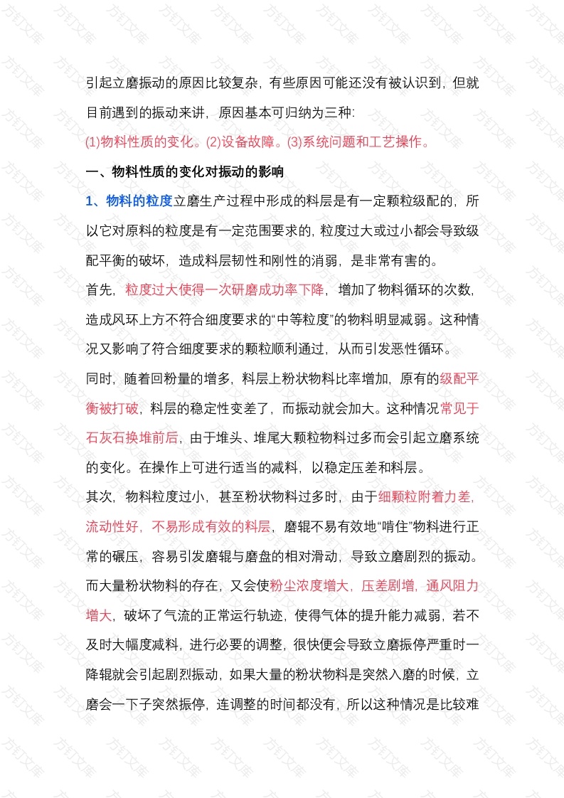 引起立磨振动的原因比较复杂,有些原因可能还没有被认识到,但就目前遇到的振动来讲,原因基本可归纳为三种:(1)物料性质的变化。(2)设备故障。3)系统问题和工艺操作一、物料性质的变化对振动的影响1、物料的粒度立磨生产过程中形成的料层是有一定颗粒级配的,所以它对原料的粒度是有一定范围要求的,粒度过大或过小都会导致级配平衡的破坏,造成料层韧性和刚性的消弱,是非常有害的。首先,粒度过大使得一次研磨成功率下降,增加了物料循环的次数造成风环上方不符合细度要求的中等粒度"的物料明显减弱。这种情况又影响了符合细度要求的颗粒顺利通过,从而引发恶性循环。同时,随着回粉量的增多,料层上粉状物料比率增加,原有的级配平衡被打破,料层的稳定性变差了,而振动就会加大。这种情况常见于石灰石换堆前后,由于堆头、堆尾大颗粒物料过多而会引起立磨系统的变化。在操作上可进行适当的减料,以稳定压差和料层。其次,物料粒度过小,甚至粉状物料过多时,由于细颗粒附着力差流动性好,不易形成有效的料层,磨辊不易有效地“啃住"物料进行正常的碾压,容易引发磨辊与磨盘的相对滑动,导致立磨剧烈的振动。而大量粉状物料的存在,又会使粉尘浓度增大,压差剧增,通风阻力增大,破坏了气流的正常运行轨迹,使得气体的提升能力减弱,若不及时大幅度减料,进行必要的调整,很快便会导致立磨振停严重时一降辊就会引起剧烈振动,如果大量的粉状物料是突然入磨的时候,立磨会一下子突然振停,连调整的时间都没有,所以这种情况是比较难以控制的当发现物料过细时,尤其是压差已明显上升时,应及时大幅减料,降研磨压力,降低出口湿度,加大喷水量,适当降低选粉机转速,操作时以保证料层的稳定和压差的稳定为中心,当有一定料层后再逐步加大研磨压力。另外,在均匀的颗粒中夹杂有大块物料时,也会引发磨辊的起伏跳动。2、物料的易磨性其实,在立磨的选型设计中就已经考虑到物料的易磨性了,一般情况下物料的易磨性差,立磨的能力就会减小,只能被迫减料运行,否则就会引起立磨的振动,造成运行的不稳定。所以说,物料易磨性的变化对于立磨运行和考核是非常重要的指标。物料的易磨性变差时,立磨对物料的粉磨次数会明显增多,磨盘上回粉量大幅上升,尤其是压差会变得很大,通风不畅,物料基本上悬浮在磨体内,料层极其不稳定,选粉机负荷变大,生料细度变粗,磨机负荷也会变大,倘若不及时减料,立磨的振动会十分剧烈。一般情况下,应该对物料的易磨性进行定期的检测,为立磨的运转和供料部门的采购、开采提供一定的依据。物料性质的变化对立磨的影响远不止这些,物料性质的变化会引起衬板的过度磨损,加快衬板的磨损进度,为保证产量被迫加大研磨压力,会对衬板产生更大的冲击和损坏:衬板的过度磨损反过来又会引起磨机的振动,所以物料供应部门对物料性质的变更应考虑到对立磨的影响。成本的控制应该综合考虑。设备故障对振动的影响1、新换衬板由于新换的磨辊、磨盘衬板比较平,不易稳定和“吸住”物料,会导致定的振动在操作中可适当提高料层厚度,加大喷水,另外可加高挡料圈。当衬板表面经过一段时间运转后,就会逐渐适应物料的性质,平稳运行了。2.衬板的过度磨损由于磨盘的离心力作用,使得磨盘上的大块物料集中在磨盘外沿区域,使得在运转过程中,磨辊和磨盘衬板外侧磨损比内侧要大。这种不平衡的磨损在料层波动大或料层薄时,可能引起磨辊衬板内侧和磨盘衬板内侧的硬冲击,造成振动。3、钮矩杆和“牛筋”的损坏钮矩杆和“牛筋"的作用是防止磨辊在磨盘上径向的移位,当它们损坏后,导致磨辊的径向摆动过大,破坏正常的吸料“角度,严重时可引起磨辊与磨盘的相对滑动,引起振动。同时,由于它们的损坏,可能导致中心三角架的偏心,使上面2中所述的振动加剧。4、液压系统有故障液压系统是立磨中最为重要的设备系统之一,磨辊对物料所施加的巨大的研磨力就是由它提供的。但是由于液压系统故障所引起的拉伸杆动作不一致,降辊和升辊时三个辊不同步等都可能引起磨机振动。5回粉重锤阀故障文