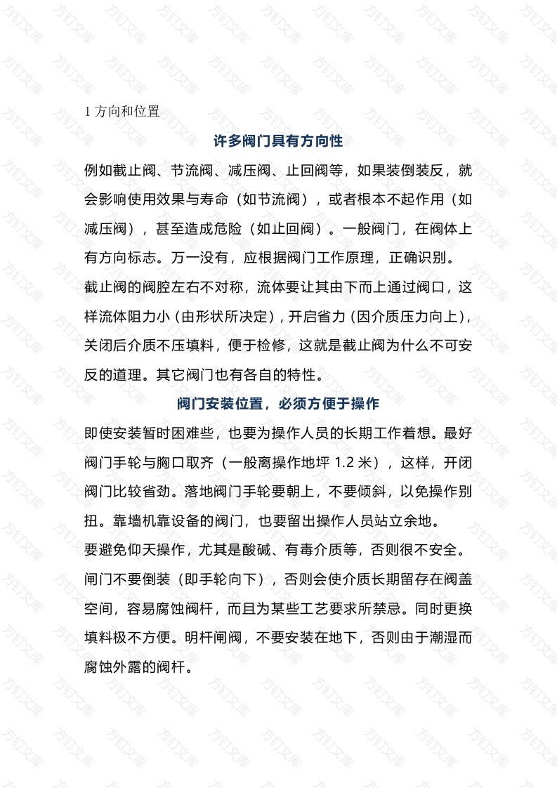 1方向和位置许多阀门具有方向性例如截止阀、节流阀、减压阀、止回阀等,如果装倒装反,就会影响使用效果与寿命(如节流阀),或者根本不起作用(如减压阀),甚至造成危险(如止回阀)。一般阀门,在阀体上有方向标志。万一没有,应根据阀门工作原理,正确识别。截止阀的阀腔左右不对称,流体要让其由下而上通过阀口,这样流体阻力小(由形状所决定),开启省力(因介质压力向上),关闭后介质不压填料,便于检修,这就是截止阀为什么不可安反的道理。其它阀门也有各自的特性。阀门安装位置,必须方便于操作即使安装暂时困难些,也要为操作人员的长期工作着想。最好阀门手轮与胸口取齐(一般离操作地坪1.2米),这样,开闭阀门比较省劲。落地阀门手轮要朝上,不要倾斜,以免操作别扭。靠墙机靠设备的阀门,也要留出操作人员站立余地。要避免仰天操作,尤其是酸碱、有毒介质等,否则很不安全。闸门不要倒装(即手轮向下),否则会使介质长期留存在阀盖空间,容易腐蚀阀杆,而且为某些工艺要求所禁忌。同时更换填料极不方便。明杆闸阀,不要安装在地下,否则由于潮湿而腐蚀外露的阀杆。升降式止回阀,安装时要保证其阀瓣垂直,以便升降灵活。旋启式止回阀,安装时要保证其销轴水平,以便旋启灵活。减压阀要直立安装在水平管道上,各个方向都不要倾斜。2施工作业安装施工必须小心,切忌撞击脆性材料制作的阀门。安装前文①应仔细核对所有阀门的型号与规格是否符合设计要求。(根据阀门型号和出厂说明书,检查它们是否可以在所要求的条件下应用,必要时作水压或气压试验。)②此外,还应检查填料是否完好,压盖螺栓有否足够的调节余量,并要检查阀杆和阀盘是否灵话,有无卡住和歪斜现象。(阀盘密封面必须关闭严密,对螺纹连接的阀门,应检查螺纹质量。不合格的阀门不能进行安装,并应另行堆放或做好标记。)③清除阀内的杂物。文安装过程①阀门起吊时,绳子不要系在手轮或阀杆上,以免损坏这些部件,应该系在法兰上。②对于阀门所连接的管路,一定要清扫干净。可用压缩空气吹去氧化铁屑、泥砂、焊渣和其他杂物。这些杂物,不但容易擦伤阀门的密封面,其中大颗粒杂物(如焊渣)还能堵死小阀门,使其失效。安装螺口阀门时,应将密封填料(线麻加铝油或聚四氟乙烯生料带),包在管子螺纹上,不要弄到阀门里,以免阀内存积影响介质流通。安装法兰阀门时,要注意对称均匀地把紧螺栓。阀门法兰与管子法兰必须平行,间隙合理,以免阀门产生过大压力,甚至开裂。对于脆性材料和强度不高的阀门,尤其要注意。须与管子焊接的阀门,应先点焊,再将关闭件全开,然后焊死。3保护措施有些阀门还须有外部保护,这就是保温和保冷。保温层内有时还要加拌热蒸汽管线。什么样的阀门应该保温或保冷,要根据生产要求而定。原则地说,凡阀内介质降低温度过多,会影响生产效率或冻坏阀门,就需要保温,甚至拌热;凡阀门裸露,对生产不利或引起结霜等不良现象时,就需要保冷。保温材料有石棉,矿渣棉玻璃棉、珍珠岩,硅藻土、蛭石等;保冷材料有软木、珍珠岩泡沫、塑料等。4旁路和仪表有的阀门,除了必要的保护设施外,还要有旁路和仪表。安装了旁路。便于疏水阀检修。其他阀门,也有安装旁路的。是否安装旁路,要看阀门状况,重要性和生产上的要求而定。5填料更换文万文万