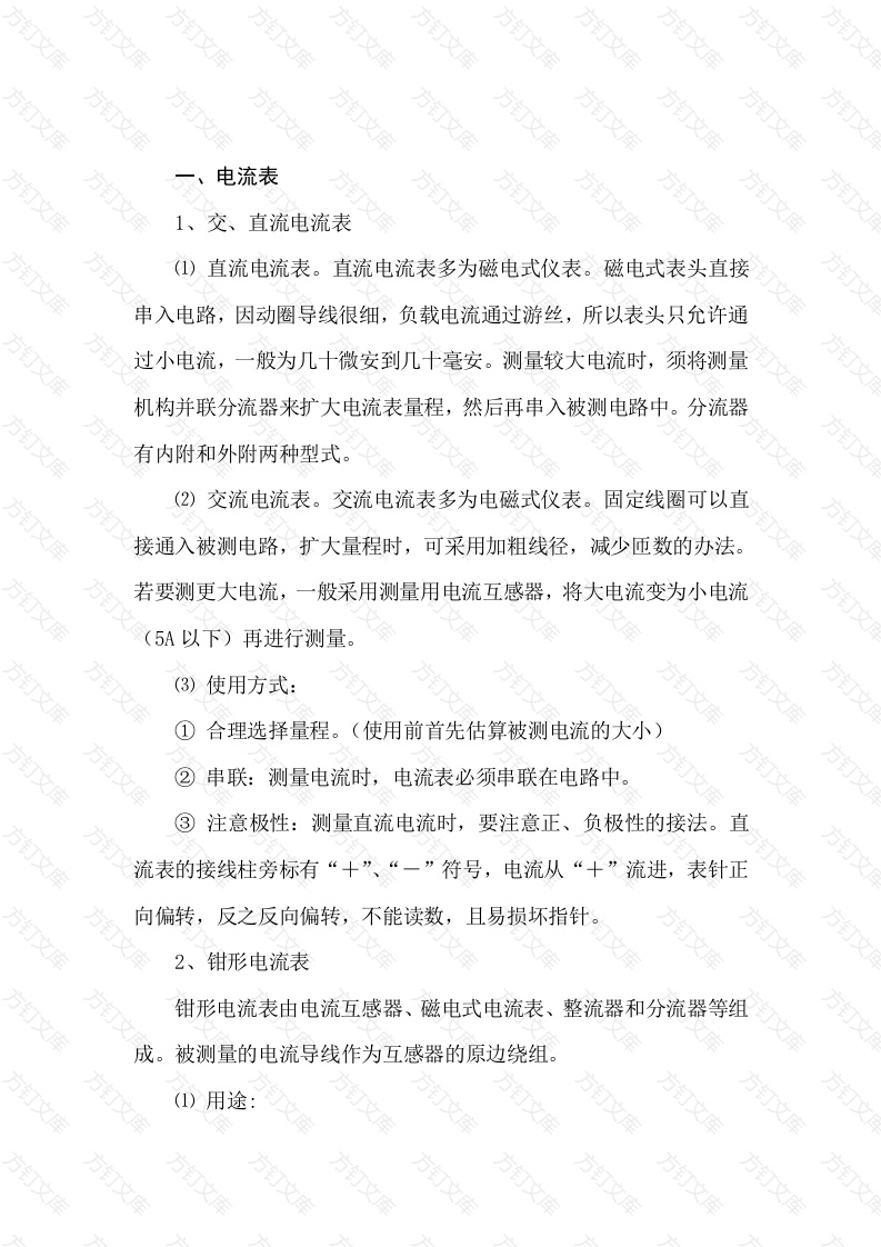 万电流表万文直流电流表(1)直流电流表。直流电流表多为磁电式仪表。磁电式表头直接串入电路,因动圈导线很细,负载电流通过游丝,所以表头只允许通过小电流,一般为几十微安到几十毫安。测量较大电流时,须将测量机构并联分流器来扩大电流表量程,然后再串入被测电路中。分流器有内附和外附两种型式。(2)交流电流表。交流电流表多为电磁式仪表。固定线圈可以直接通入被测电路,扩大量程时,可采用加粗线径,减少匝数的办法。若要测更大电流,一般采用测量用电流互感器,将大电流变为小电流(5A以下)再进行测量。(3)使用方式:①合理选择量程。(使用前首先估算被测电流的大小)②串联:测量电流时,电流表必须串联在电路中③注意极性:测量直流电流时,要注意正、负极性的接法。流表的接线柱旁标有“+”、”符号,电流从“十”流进,表针正向偏转,反之反向偏转,不能读数,且易损坏指针。2、钳形电流表钳形电流表由电流互感器、磁电式电流表、整流器和分流器等组成。被测量的电流导线作为互感器的原边绕组。(1)用途:万文用于在不切断电路而进行测量电流的场合,实现在线测量(2)使用注意事项:①正确选择类别。(根据被测对象的不同选择不同型号的表)②正确选择表的量程。③测量时,应使被测导线放在钳口的中央,以免发生误差④每次测量后,要把调节电流量程的转换开关放在最高档位,防止下次使用时,因未经选择量程就进行测量而损坏仪表。⑤测量5A以下电流时,为了测量的准确性,在条件允许的情况下,可将被测量导线多绕几匝放进钳口进行测量,将读取的电流值除以匝数,即得实际电流值。⑥不能测量无绝缘的导线⑦测量中操作人员应注意与带电部位的安全距离,以防触电或发生短路。对高压设备不能直接使用,必须使用相应绝缘等级的绝缘杆辅助才能进行测量。⑧钳形表的钳口必须保持清洁、干燥。方电压表见的交流电压表为例1、测量三相交流电压的接线常用的两种方法:(1)测三相大电流,用电压互感器和三只电压表测量。(2)电流相对较小,用一只电压表与电压转换开关配合进行测量。万2使用方法:(1)注意极性:测量直流电压时,正、负极必须正确。接线时电压表的“+”极接被测电压的高电位,“-”极接低电位。(2)选择适当量程:以被测量处于仪表最大量程的2/3左右为准确(3)高压交流测量:需采用电压互感器,电压表的量程应与互感器二次额定电压相符合,一般电压为100V。三、兆欧表兆欧表又称摇表,般用来测量电机、电缆及其它电器和线路的绝缘电阻,它主要由直流高压电源、磁电式流比计和附加电阻组成。兆欧表的使用:1、测试前的准备:(1)正确选用兆欧表。选用额定电压和测量范围与被测电气设备相适应的兆欧表。(不能用500V表测1140V或6KV线路)。(2)测试地点应选取远离外界磁场的地方,并水平放置兆欧表。(3)测量前必须先将所测设备的电源及负荷切断,并进行放电。特别是大电机、变压器和电容器等要放电3分钟,以确保设备及人身安全。(4)应使用仪表专用测量线或绝缘强度较高的单根导线,不能用双股线,两根连接线切勿交缠在一起,同时要保持被测物表面清洁,以免引起测量误差