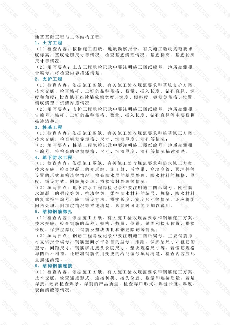 地基基础工程与主体结构工程1、土方工程(1)检查内容:依据施工图纸、地质勘察报告、有关施工验收规范要求底标高,基底轮廓尺寸等情况:检查基底清理情况,基底标高,基底轮廓尺寸等情况:(2)填写要点:土方工程隐检记录中要注明施工图纸编号,地质勘测报告编号,将检查内容描述清楚。2、支护工程(1)检查内容:依据施工图纸、有关施工验收规范要求和基坑支护方案技术交底、检查锚杆、土钉的品种规格、数量、插入长度、钻孔直径、深度和角度:检查地下连续墙成槽宽度、深度、倾斜度、钢筋笼规格、位置槽底清理、沉渣厚度情况:(2)填写要点:支护工程隐检记录中要注明施工图纸编号,地质勘测报告编号,锚杆、土钉的品种规格、数量、插入长度、钻孔直径等主要数据描述清楚。3、桩基工程(1)检查内容:依据施工图纸、有关施工验收规范要求和桩基施工方案技术交底,检查钢筋笼规格、尺寸、沉渣厚度、清孔等情况:(2)填写要点:桩基工程隐检记录中要注明施工图纸编号,地质勘测报告编号,将检查的钢筋规格、尺寸、沉渣厚度、清孔等情况描述清楚。4、地下防水工程(1)检查内容:依据施工图纸、有关施工验收规范要求和防水施工方案技术交底、检查混凝土的变形缝、施工缝、后浇带、穿墙套管、预埋件等设置的形式和构造等情况:检查防水层的基层处理,防水材料的规格、厚度、铺设方式、阴阳角处理、搭接密封处理等情况:(2)填写要点:地下防水工程隐检记录中要注明施工图纸编号、刚性防水混凝土的强度等级、抗渗等级,柔性防水材料的编号、规格、防水材料的复试报告编号、施工铺设方法、搭接长度、宽度尺寸等情况,还应将阴阳角处理、附加层情况等描述清楚,必要时可附简图加以说明。5、结构钢筋绑扎(1)检查内容:依据施工图纸、有关施工验收规范要求和钢筋施工方案、技术交底、检查钢筋的品种、规格、数量、位置、锚固和接头位置、搭接长度、保护层厚度,钢筋及垫块绑扎和钢筋除锈等情况;(2)填写要点:钢筋工程隐检记录中要注明施工图纸编号,主要钢筋原材复试报告编号,钢筋竖向水平各自的型号、排距、保护层尺寸,箍筋的型号,间距尺寸,钢筋绑扎接头长度尺寸,垫块规格尺寸等,若钢筋规格与图纸不相符,还应将钢筋代用变更的洽商编号填写清楚,检查内容应尽量描述清楚6、结构钢筋连接(1)检查内容:依据施工图纸、有关施工验收规范要求和钢筋施工方案技术交底,检查连接形式、连接种类、接头位置、数量和连接质量,若是焊接,还要检查焊条、焊剂的产品质量,检查焊口形式、焊缝长度、厚度表面清渣等情况:(2)填写要点:钢筋连接隐检记录中要注明施工图纸编号,钢筋连接试验报告编号,钢筋连接的种类(焊接、机械连接),连接形式(锥螺纹连接、滚压直螺纹连接、钢套筒连接、剥肋直螺纹连接、电渣压力焊、闪光对焊等),焊(连)接的具体规格尺寸、数量、接头位置应描述清楚,对不同连接形式分别填写隐检记录。7、预应力工程(1)检查内容:依据施工图纸、有关施工验收规范要求和预应力施工方案、技术交底,检查预应力筋的品种、规格、数量、位置,预留孔道的规格、数量、位置、形状及灌浆孔、排气兼泌水管的情况等,预应力筋的下料长度、切断方法、竖向位置偏差、固定、护套的完整性,错具、夹具和连接器的组装等情况,错固区中加强构造情况。(2)填写要点:预应力工程隐检记录中要注明施工图纸编号,预应力的种类(有粘结或无粘接),预应力的方法(先张法、后张法),锚具的规格型号,预应力筋的长度尺寸,预埋垫板的尺寸等,将检查内容描述清楚。8、钢结构(网架)工程(1)检查内容:依据施工图纸、有关施工验收规范要求和施工方案、技术交底,检查地脚螺栓规格、位置、埋设方法、紧固情况等;防火涂料涂装基层的涂料遍数及涂层厚度:网架焊接球节点的连接方式、质量情况:网架支座错栓的位置、支撑垫块的种类及错栓的紧固情况等:(2)填写要点:钢结构(网架)工程隐检记录中要注明施工图纸编号,主要材料的型号规格,主要原材料的复试报告编号,将检查内容描述楚。9、外墙内(外)保温构造节点做法(1)检查内容:依据施工图纸、有关施工验收规范要求和施工方案、技术交底,检查构造节点的连接方法等情况:(2)填写要点:隐检记录中要注明施工图纸编号、保温材料的种类规格、厚度,可附与外墙板连接的节点简图等。将检查内容描述清楚。2建筑装饰装修工程1、地面工程(1)检查内容:依据施工图纸、有关施工验收规范要求和施工方案、技术交底,检查各基层(垫层、找平层、隔离层、填充层)的材料品种、规格、铺设厚度、铺设方式、坡度、标高、表面情况、节点密封处理等情况:(2)填写要点:地面工程隐检记录中要注明施工图纸编号,地面铺设的类型(石材地面、木材地面、水泥地面、板材地面),材料的品种规格等将检查内容描述清楚。2、厕浴防水(1)检查内容:依据施工图纸、有关施工验收规范要求和施工方案、技术交底,检查基层表面含水率、地漏、套管、卫生器具根部、阴阳角等部位的处理情况,防水层墙面的涂刷情况。(2)填写要点:厕浴防水隐检记录中要注明施工图纸编号,防水材料的复试报告编号,防水材料的品种、涂刷厚度,玻钎布的搭接宽度,地漏、套管、卫生器具根部附加层的情况,防水层从地面延伸到墙面的高度