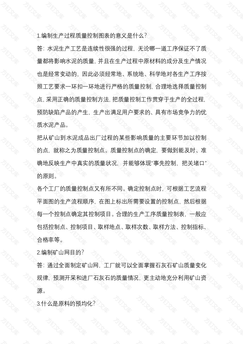 1编制生产过程质量控制图表的意义是什么?答:水泥生产工艺是连续性很强的过程,无论哪一道工序保证不了质量都将影响水泥的质量,并且在生产过程中原材料的成分及生产情况也是经常变动的,因此必须经常地、系统地、科学地对各生产工序按照工艺要求一环扣一环地进行严格的质量控制,合理地选择质量控制点,采用正确的质量控制方法,把质量控制工作贯穿于生产的全过程,预防缺陷产品的产生,生产出满足用户要求的、具有市场竞争力的优质水泥产品。把从矿山到水泥成品出厂过程的某些影响质量的主要环节加以控制的点,就称之为质量控制点。质量控制点的确定,要做到能及时、准确地反映生产中真实的质量状况,并能够体现“事先控制,把关堵口”的原则。各个工厂的质量控制点又有所不同。确定控制点时,可根据工艺流程平面图的生产流程顺序,在图上标出所需要设置的控制点,然后根据每一个控制点确定其控制项目。合理的生产工序质量控制表,一般应包括控制点、控制项目、取样地点、取样次数、取样方法、控制指标、合格率等。2编制矿山网目的?答:通过全面制定矿山网,工厂就可以全面掌握石灰石矿山质量变化规律,预测开采和进厂石灰石的质量情况,更主动地充分利用矿山资源。3.什么是原料的预均化?文万万答预均化技术的基本原理,可简单地概括为“平铺直取”。即破碎后的原料在储存和取用的过程中,尽可能以最多的相互平行的上下重叠的同厚度料层进行堆料,取用时要垂直于料层方向同时切取不同料层直到整个料层的物料取尽为止。4进厂燃料主要的控制项目有哪些?为何要控这些项目?答:燃煤最好能定点供应。进厂燃煤应按产地分批分堆存放,按批进行煤的工业分析和煤灰化学全分析。按质量控制要求,分批搭配使用以稳定烧成煤的灰分、挥发分和热值。煤的来源比较复杂或采用劣质煤的企业,应采取平铺直取,用铲车混合或多仓搭配等预均化措施。烟煤存放还要防止自燃,可将煤堆压实防止氧化,减少自燃。签订燃煤合同时,应明确品质要求,加强进厂时质量验收,坚持不合格的燃煤不用于生产。为保证连续生产,相对稳定煤质,应控制煤的储存量在10天以上做到先进先用,防止热值损失。5进厂石灰石主要的控制项目有哪些?为何要控制这些项目?答:①外购大块石灰石时,石灰石进厂后,要按指定地点分批分堆存放,检验后搭配使用,最好进行预均化。②有矿山的企业,石灰石在矿山破碎后进厂或进厂后直接进破碎机破碎并储入碎石堆场,进行预均化进厂石灰石的质量要求如下燧石或石英≤4.0%;碱(Na20文20)≤06%~1.0%;S03≤1.0%。6.生料细度及均齐性对熟料煅烧及质量有何影响?答:生料细度超过一定限度(比表面积>500m2/kg)对熟料质量提高并不明显。所以在实际生产中应结合熟料质量、磨机产量、电耗等多方面考虑,确定合理的生料细度控制指标。合理的生料细度是指生料的平均细度和生料细度的均齐性,即尽量避免粗颗粒。有关资料表明当生料中0.2mm筛筛余大于1.4%时,熟料中的f-Ca0含量明显增加。生料均匀程度的高低在很大程度上决定着生料质量。小型水泥企业的熟料质量差的主要原因之一就是生料均匀程度差,没有进行原燃材料的预均化和生料均化,影响熟料的煅烧质量。新型干法窑的优势之就是生料均匀程度高,从设计就注重原燃材料的预均化处理和生料均化效果,为熟料的煅烧提供了强有力的质量保证。7.生产中可采取哪些措施保证生料成分的稳定性?答:主要是采用原料的预均化和生料的均化来保证生料成分的稳定性。8.为什么要控制熟料的化学成分?答:对熟料化学成分的控制目的在于检验其矿物组成是否符合配料设计的要求,从而判断前道工序的工艺状况和熟料质量,并作为调整前道工序的依据。9.造成熟料f-C0含量高的原因有哪些?可采用什么措施解决?答:造成熟料中f-CaO含量高的主要原因有万a、配料不当,KH值过高万万