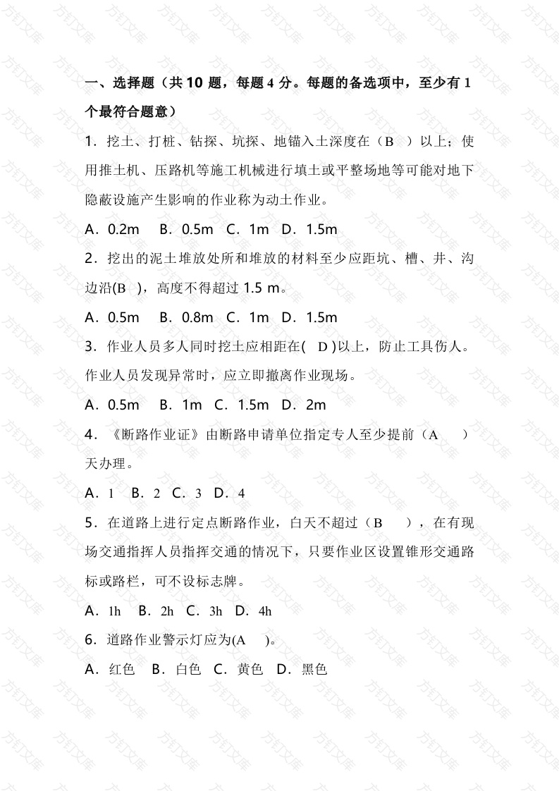 选择题(共10题,每题4分。每题的备选项中,至少有1个最符合题意)挖土、打桩、钻探、坑探、地锚入土深度在(B)用推土机、压路机等施工机械进行填土或平整场地等可能对地下隐蔽设施产生影响的作业称为动土作业。A.0.2mB.0.5mC.1mD.1.5m2.挖出的泥土堆放处所和堆放的材料至少应距坑、槽、井、沟边沿(B),高度不得超过1.5m。A.0.5mB.0.8mC.1mD.1.5m3.作业人员多人同时挖土应相距在(D)以上,防止工具伤人作业人员发现异常时,应立即撤离作业现场。A.0.5mB.1mc.1.5mD.2m4《断路作业证》由断路申请单位指定专人至少提前(A天办理。A.B.2C.3D5.在道路上进行定点断路作业,白天不超过(B在有现场交通指挥人员指挥交通的情况下,只要作业区设置锥形交通路标或路栏,可不设标志牌。A.1h B.2hc.3h D.6.道路作业警示灯应为(A红色B.白色C.黄色D黑色万万7.道路作业警示灯设置高度应符合GA182的规定,离地面1.5cm,不低于(AA.B.2m C.3m D.4m8.道路作业警示灯遇雨、雪、雾天时应开启,在其他气候条件下应自傍晚前开启,并能发出至少自(B)以外清晰可见的连续、闪烁或旋转的红光。A.100mB.150m200m250m9《作业证》应至少保留(A)年A.1B.2C.3D.410.断路作业用警示灯可以使用(AB电压。A.36VB.42VC.110VD.220V二、判断题(每题2分)1、挖掘时应自下而上进行,禁止采用挖空底角的方法挖掘。2、在挖较深的坑、槽、井、沟时,严禁在土壁上挖洞攀登。(√3、动土作业中在拆除固壁支撑时,应从上而下进行。(X一个施工点、一个施工周期内可以办理多张作业许可证。5、动土作业现场应保持通风良好,并对可能存在有毒有害物质的区域进行监测。(√6、动土作业所有人员不准在坑、槽、井、沟内休息。(7、断路作业单位应在作业区附近设置路栏、锥形交通路标、道路作业警示灯、导向标等交通警示设施。(√8、在坑、槽、井、沟的边缘安放机械、铺设轨道及通行车辆时,应保持适当距离,采取有效的固壁措施,确保安全。9、在《作业证》规定的时间内未完成断路作业时,由断路申请单位重新办理《作业证》。(√10、作业活动过程中严禁涂改、转借《作业证》三、问答题(本题40分)文1、厂区动土作业有哪些安全要求?答:1.动土作业应办理《动土安全作业证》,没有《作业证》严禁动土作业。2《作业证》经单位有关水、电、汽、工艺、设备、消防、安全工程等部门会签,由动土作业主管部门审批。3作业前,项目负责人应对作业人员进行安全教育。作业人员应按规定着装并佩戴合适的个体防护用品。施工单位应进行施工现场危害辨识,并逐条落实安全措施。4作业前,应检查工具、现场支撑是否牢固、完好,发现问题应及时处理。5动土作业施工现场应根据需要设置护栏、盖板和警告标志,夜间应悬挂红灯示警。6严禁涂改、转借《作业证》不得擅自变更动土作业内容、扩大作业范围或转移作业地点。文