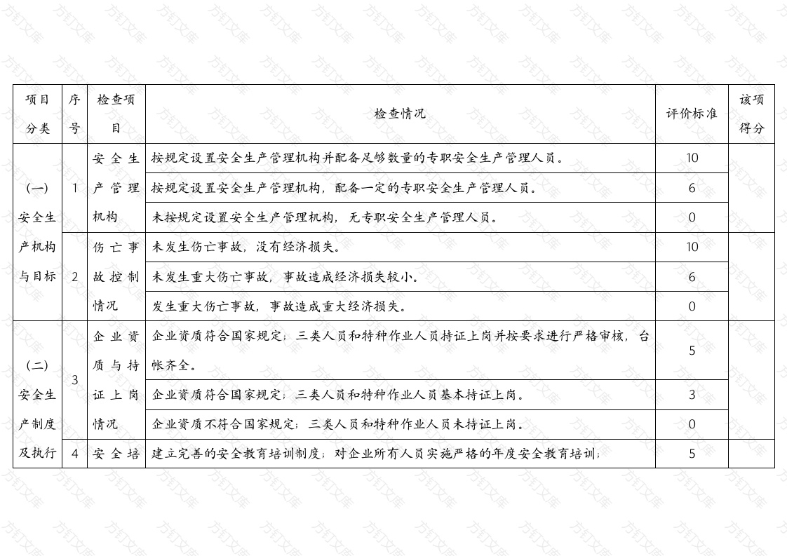 万方万万项目序检查项检查情况号万分类目方文评价标准得分安全生按规定设置安全生产管理机构并配备足够数量的专职安全生产管理人员。101产管理按规定设置安全生产管理机构,配备一定的专职安全生产管理人员。6安全生机构未按规定设置安全生产管理机构,无专职安全生产管理人员。0产机构伤亡事未发生伤亡事故,没有经济损失。10与目标2故控制未发生重大伤亡事故,事故造成经济损失较小。情况发生重大伤亡事故,事故造成重大经济损失。企业资企业资质符合国家规定;三类人员和特种作业人员持证上岗并按要求进行严格审核,台5(二)质与持帐齐全。3安全生证上岗企业资质符合国家规定;三类人员和特种作业人员基本持证上岗。3产制度情况企业资质不符合国家规定;三类人员和特种作业人员未持证上岗。0及执行4安全培建立完善的安全教育培训制度;对企业所有人员实施严格的年度安全教育培训;5万训教育建立安全教育培训制度;对企业部分人员实施年度安全教育培训;3制度没有按规定建立安全教育培训制度;未对特种作业人员进行培训;安全生建立严格的安全生产责任制和安全生产奖惩制,责任明确落实到人,奖惩分明,安全生5产责任产资金投入到位。制、奖惩建立安全生产责任制,安全生产资金投入基本到位35制度及资金投未建立安全生产责任制,安全生产资金投入严重不足。方文安全检定期开展严格的安全检查,对施工重大隐患和危险源严格监控,对发现的隐患及时整改5查与危开展安全检查,对施工重大隐患和危险源进行监控,对发现的隐患进行整改。36险源监未对施工重大隐患和危险源进行有效监控或发现重大隐患未进行整玫控制度7安全技建立安全技术措施、技术交底制度,落实到位。5方方万术措施、有安全技术措施、技术交底制度,并基本落实。3技术交未建立安全技术措施、技术交底制度。0底制度制定了各类安全操作规程,内容全面,措施到位。5安全操制定了基本的安全操作规程。作规程未制定安全操作规程。建立安全会议制度并严格执行,会议记录齐全,安全作为工地例会重要内容。5安全会9建立安全会议制度,会议记录较全。3议制度未建立安全会议制度,无会议记录。(三)施工组编制完善的施工组织设计,针对项目特点,确定质量控制点,并严格控制施工过程,制5施工现10织设计定有针对性的安全措施。场安全与质量编制施工组织设计中有质量控制点和安全措施。3管理控制编制施工组织设计中无质量控制点和安全措施。
