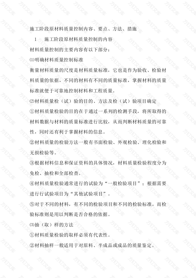 施工阶段原材料质量控制内容、要点、方法、措施施工阶段原材料质量控制的内容材料质量控制的主要内容有以下部分:万(1)明确材料质量控制标准衡量材料质量的尺度是材料质量标准,它也是作为验收、检验材料质量的依据,不同的材料有不同的质量标准,掌握材料的质量标准就便于可靠地控制材料和工程质量。(2)材料质量检(试)验的目的、方法及检(试)验项目确定①材料质量检验的目的在于通过一系列的检测手段,将所取得的材料数据与材料的质量标准进行比较,从而判断材料质量的可靠性,同时还有利于掌握材料的信息。②材料质量的检验方法一般有书面检验、外观检验、理化检验和无损检验等。③根据材料信息和保证资料的具体情况,材料质量检验程度分为免检、抽检和全部检查。④材料质量检验通常进行的试验为“一般检验项目”;根据需要进行行试验项目为“其他试验项目”⑤对于不同的材料,有不同的检验项目和不同的检验标准,而检验标准则是用以判断是否合格的依据。(3)抽(取)样的方法①材料质量检验的取样必须有代表性。②材料抽样一般适用于对原料、半成品或成品的质量鉴定。〔4)材料的选择和使用要求材料的选择和使用不当,均会严重影响工程质量或造成质量事故故必须针对工程特点,根据材料的性能、质量标准、适用范围和对施工要求等方面进行综合考虑,慎重地来选择和使用材料。施工阶段对原材料质量进行控制的要点(1)主要材料、设备及构配件在定货前,承包单位必须向监理工程师申报同意后,方可定货;(2)监理工程师协助承包单位合理地、科学地组织材料采购、加工、储备、运输,建立严密的计划、调度、管理体系,加快材料的周转。减少材料占用量,按质、按量、如期地满足建设需要。(3)合理地组织材料使用,按定额计量使用材料。(4)健全现场材料管理制度,严格材料入库验收3施工阶段对原材料质量进行控制的方法在整个工程建设过程中,工程所需要的原材料、半成品、构配件和永久生设备、器材等都将成为永性性工程的组成部份,所以它们的质量好坏直接影响到未来工程产品的质量,因此需要事先对其质量进行严格控制。即从采购、加工制造、运输、装卸、进场、存放、使用等方面进行系统的监督与控制。(1)材料采购的控制①凡由承包单位负责采购的的原材料、半成吕或构配件、设备等,在采购定货前应向监理工程师申报;对重要的材料,还应提交样品,供试验或鉴定,有些材料则要求供货单位提交理化试验单,经监理工程师审查认可并发出书面认可证明后,方可进行定货采购②供货厂家是制造材料、半成品、构配件和永久性设备和器材等的主体,所以选择信誉好的供货厂家,是保证采购、定货质量的前提。③某些材料(诸如一些装饰材料),定货时最好一次定齐和备足货源,以免由于分批而出现花色差异不④供货厂房应向需方(定货方)提供质量保证文件,。用以表明其提供的货物能完成达到设计要求。⑤协助承包单位合理地、科学地组织材料采购、加工、储备、运输,建立严密的计划、调度、管理体系、加快材料的周转,减少材料的占用量,按质、按量、如期地满足建设需要(2)进场材料的质量控制①凡运到施工现场的原材料、半成品或构配件,应有产品出厂合格证及技术说明书,并由施工承包单位按规定要求进行检验并向监理工程师提出检验或试验报告,经监理工程师审查并对其外观检查合格后,方准进场。②凡是无产品合格证明及检验不合格者,不得进场。如果监理工程师认为供货方所提交的有关产品合格证明文件以及施工承包单位提交的检验和试验报告,仍不足以说明到场产品的质量符合要求时,监理工程师可以再行组织复检或抽样试验,确认其质量合格后方允许进场