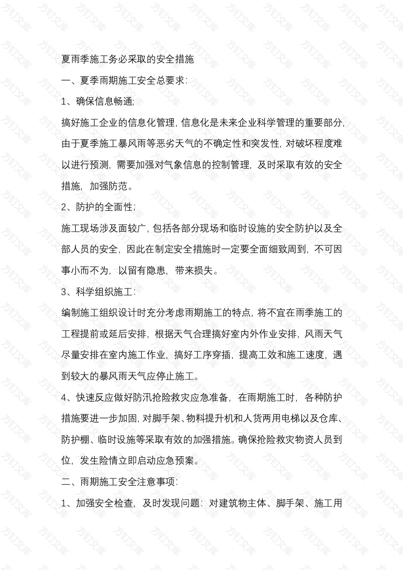 夏雨季施工务必采取的安全措施夏季雨期施工安全总要求万1、确保信息畅通:搞好施工企业的信息化管理,信息化是未来企业科学管理的重要部分由于夏季施工暴风雨等恶劣天气的不确定性和突发性,对破坏程度难以进行预测,需要加强对气象信息的控制管理,及时采取有效的安全措施,加强防范。2、防护的全面性;施工现场涉及面较广,包括各部分现场和临时设施的安全防护以及全部人员的安全,因此在制定安全措施时一定要全面细致周到,不可因事小而不为,以留有隐患,带来损失。3、科学组织施工编制施工组织设计时充分考虑雨期施工的特点,将不宜在雨季施工的工程提前或延后安排,根据天气合理搞好室内外作业安排,风雨天气尽量安排在室内施工作业,搞好工序穿插,:提高工效和施工速度,遇到较大的暴风雨天气应停止施工。4、快速反应做好防汛抢险救灾应急准备,在雨期施工时,各种防护措施要进一步加固,对脚手架、物料提升机和人货两用电梯以及仓库、防护棚、临时设施等采取有效的加强措施。确保抢险救灾物资人员到位,发生险情立即启动应急预案。雨期施工安全注意事项,加强安全检查,及时发现问题:对建筑物主体、脚手架、施工用塔式起重机、物料提升机、模板支撑体系、各小型机械的防雨棚以及临时设施、安全标志牌进行经常性检查,及时发现问题及时排除,对破损处及时修复。2、注意经雨冲淋材料的使用,要采取处理措施后才能使用,大雨冲刷严重的墙体要拆除重建。3、暴风雨时应立即停止室外施工作业,人员迅速撤到安全地方,37℃以上天气停止室外作业。同时全工地应果断拉断电源。4、加强对各类人员的培训教育,加强夏季安全施工常识的学习,提高自我防范能力和应急反应能力三、雨季施工安全准备措施:1、合理安排作息时间:夏季施工作业时间尽量向两端压缩,避开中午的高温,气温超过37℃时,停止室外作业,在室内作业时应有通风降温措施。遇较大的暴风雨天气应停止所有的作业,人员撤到安全地方。2、做好现场排水:(1)根据施工平面图、排水总平面图,利用自然地形确定排水方向,按规定坡度挖好排水沟,确保排水畅通无阻。(2)雨季施工现场临近高地,应在高地边挖好排水沟,处理好危石防止发生滑坡、塌方等灾害。3)保证道路畅通,路面根据实际情况分别硬化或加铺沙砾、炉渣或其它材料,并按要求加高起拱。(4)原材料、成品、半成品的防护。对材料库全面定期检查,及时维修四周排水良好,墙基坚固,不漏雨渗水,钢材等材料存放采取相应的防雨措施,确保材料的质量安全(⑤)严格按防汗汛要求设置连续、畅通的排水设施和应急物资,如水泵及相关的器材、塑料布、油毡等材料。四、各重点施工分项雨季安全措施1、土方工程和基础工程。2、砌体工程3、混凝土工程方方4、吊装工程:5、屋面工程万(1)卷材屋面应尽量在雨季前施工,并同时安装屋面的落水管:(2)雨天严禁油毡屋面施工,油毡、保温材料不准淋雨:(3)雨期屋面工程宜采用“湿铺法”施工工艺。“湿铺法"就是在“潮湿”的基层上铺贴卷材,先喷刷1一~2道冷底子油喷刷工作宜在水泥砂浆凝结初期进行操作,以防基层浸水。如基层浸水,应在基层表面干燥后方可铺贴油毡。如基层潮湿且干燥有困难时,可采用排汽屋面。6、抹灰工程:(1)雨天不准进行室外抹灰,至少应预测1-2天的天气变化情况。对已施工的墙面,应注意防止雨水污染(2)室内抹灰尽量在做完屋面后进行,至少做完屋面找平层,并铺一层油毡(3)雨天不宜做罩面油漆万文万