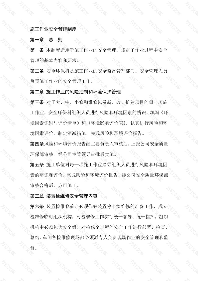施工作业安全管理制度第一章总则第一条本制度适用于施工作业的安全管理。规定了作业过程中安全管理的基本内容和要求。第二条安全环保科是施工作业的安全监督管理部门。安全管理人员负责施工作业的安全管理工作。第二章施工作业的风险控制和环境保护管理第三条对于大、中、小修和维修以及新、改、扩建项目的每一项施工作业,安全环保科组织人员进行风险和环境因素的辨识,填写《环境因素识别与评价清单》和《环境影响评价表》。认真进行风险和环境因素评价,制定消减措施,完成风险和环境评价报告。第四条风险和环境评价报告经主要负责人审核后,上报公司安全质量环保部审核。经公司主管领导审批后实施。第五条施工单位对每一项施工作业必须组织人员进行风险和环境因素的辨识和评价,完成风险和环境评价报告,经公司安全质量环保部审核合格后,方可施工。第三章装置检维修安全管理内容第六条装置检维修前,必须作好装置停工检维修的准备工作,成立检维修临时组织机构,对检维修工作实行统一领导、统一指挥,组织机构中必须包含安全组,对检修全过程的安全工作进行部署、检查、总结,车间各检维修现场都必须派专人负责现场作业的安全管理和监第七条停工检维修项目应作到“五定”,即定检修方案、定维修人员、定安全措施、定检修质量、定检修制度第八条负责检维修的人员应对所用的机具材料、设备零件及各种安全用具和防护用具进行认真的检查与配备,根据检维修任务布置检维修现场,保证各通道畅通,对于检查不合格的各种设备、安全用具和防护用具等要进行修复或更换。第九条装置停工检维修必须制定停工、检维修、开工方案及相应的安全措施,并经过生产、技术和安全人员讨论后,生产主管领导批准后执行。第十条装置停工前,要按照工艺要求绘制出盲板图和盲板拆装表,盲板加装完毕后,由生产办确认后,方可进行检修。第十一条参加检维修的人员(包括外委项目的检修人员)在进入现场之前,检维修组织机构要召开动员会,对参加检维修的所有人员进行风险和环境保护以及预防措施、安全管理制度、安全操作规程的教育,并落实停工检维修的安全措施。第十二条外委项目在签订检维修合同时,必须签订安全合同,明确施工单位对所承包检修项目的安全工作负全责,要求施工单位加强自身安全管理,严格执行国家和上级部门的安全规定和本厂的各项安全管理制度,并接受生产办的统一监督检查。第十三条对于检修的外委施工项目,指定专人负责向施工单位作好检修项目的技术交底,并掌握其施工进度、质量、安全情况,及时作好协调工作。第十四条装置停工由安全环保科检查后按停工方案停工,确保安全停车第十五条对于进入设备内部检维修的项目,在打开设备人孔前,其内部温度、压力应降到常温、常压,并从上而下依次打开,在打开底部人孔时,应先打开最底部的放料阀、排空阀,待确认内部没有堵塞或残留物料时,方可进行,在打开人孔盖之前,切忌把螺丝全部松开,严防烫伤人员。第十六条对于含油污水系统的检查,包括下水井、地漏要确实封死、盖严,装置区内的地坑、平台及设备、管道外表面的油污、物料要吹扫干净,避免动火时发生爆炸着火。凡是检修项目,公司安全负责人必须同检修施工单位负责人进行现场交接,交接内容包括:检修部位的名称及检修作业的内容;检修部位处理情况,包括处理时间、分析结果和分析时间,装拆盲板的部位和采取的措施,检修作业的环境及注意事项等,未经厂安全负责人交待和未经生产岗位班组长同意,检修人员不得进行检修工作。第十七条所有检修人员进入施工现场,必须穿戴好个人防护用品,并严格执行检修规程和本工种的安全技术规程。第十八条检修中的用火管理,严格执行轻化工厂《工业动火安全管理制度》。第十九条在检维修期间要加强保卫工作,巡逻队24小时派专人值班巡逻,关键设备和要害部位的检修,要控制无关人员进入。第二十条在检维修期间要保证厂区内的消防通道畅通无阻,消防水