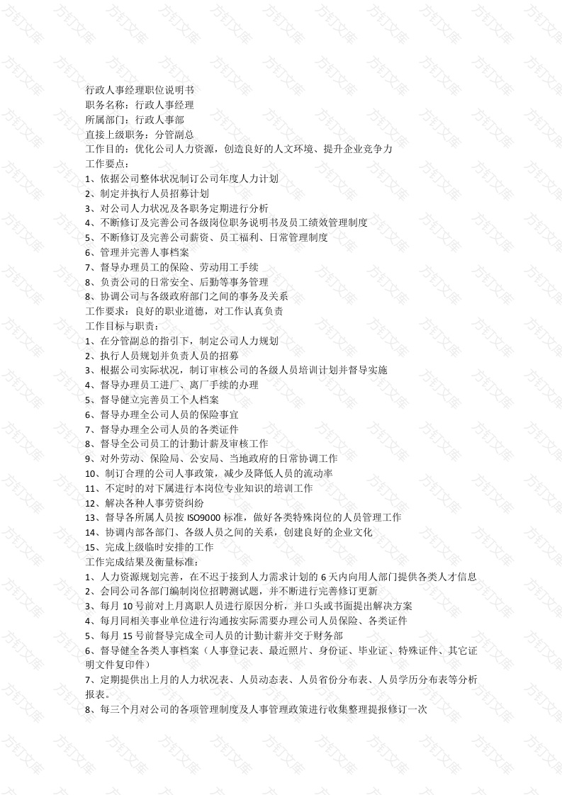 行政人事经理职位说明书文职务名称:行政人事经理所属部门:行政人事部直接上级职务:分管副总工作目的:优化公司人力资源,创造良好的人文环境、提升企业竞争力工作要点:1、依据公司整体状况制订公司年度人力计划2、制定并执行人员招募计划3、对公司人力状况及各职务定期进行分析4、不断修订及完善公司各级岗位职务说明书及员工绩效管理制度5、不断修订及完善公司薪资、员工福利、日常管理制度6、管理并完善人事档案7、督导办理员工的保险、劳动用工手续8、负责公司的日常安全、后勤等事务管理8、协调公司与各级政府部门之间的事务及关系方工作要求:良好的职业道德,对工作认真负责工作目标与职责:1、在分管副总的指引下,制定公司人力规划万2、执行人员规划并负责人员的招募3、根据公司实际状况,制订审核公司的各级人员培训计划并督导实施4、督导办理员工进厂、离厂手续的办理5、督导健立完善员工个人档案6、督导办理全公司人员的保险事宜7、督导办理全公司人员的各类证件8、督导全公司员工的计勤计薪及审核工作万9、对外劳动、保险局、公安局、当地政府的日常协调工作10、制订合理的公司人事政策,减少及降低人员的流动率11、不定时的对下属进行本岗位专业知识的培训工作12、解决各种人事劳资纠纷13、督导各所属人员按S09000标准,做好各类特殊岗位的人员管理工作14、协调内部各部门、各级人员之间的关系,创建良好的企业文化15、完成上级临时安排的工作工作完成结果及衡量标准:1、人力资源规划完善,在不迟于接到人力需求计划的6天内向用人部门提供各类人才信息2、会同公司各部门编制岗位招聘测试题,并不断进行完善修订更新3、每月10号前对上月离职人员进行原因分析,并口头或书面提出解决方案4、每月同相关事业单位进行沟通按实际需要办理公司人员保险、各类证件5、每月15号前督导完成全司人员的计勤计薪并交于财务部6、督导健全各类人事档案(人事登记表、最近照片、身份证、毕业证、特殊证件、其它证明文件复印件)7、定期提供出上月的人力状况表、人员动态表、人员省份分布表、人员学历分布表等分析报表。8、每三个月对公司的各项管理制度及人事管理政策进行收集整理提报修订一次9、每半年提请公司并与各部门配合对公司人力编制状况进行检讨确定次11、如遇劳资纠纷,须在第一时间进行处理12、必须严格依S09000标准做好员工各类档案管理工作,审查时不得有缺陷13、按1s09000标准做好各级人员的培训工作任职要求:生理:年龄:25岁至35岁性别:男、女不限身高:女160CM以上,男168CM以上方方方体重:与身高成正比,在正常范围内均可外貌:端庄、五宫良好健康状况:健康、无残疾,无传染文其他:为人热情大方知识技能及经历要求:大专以上相关学历在外资企业二年以上相同职位的工作经验具现代企业人力资源管理概念,有实际操作经验熟悉工厂后勤事务管理方订熟悉国家政策和劳动法规熟练操作OFFICE等办公自动化软件技能:良好的文字表达能力,功底较强,会英文者更佳思维敏捷,能清楚的了解即将发生的事情,并能找出解决办法能根据事情的主次,合理、有序的安排工作有组织大型文化娱乐活动的经验良好的内、外部沟通协调能力综合素质:文1、具良好的职业道德,保守企业秘密3、能独立开展工作其它要求:社会背景良好万方人事主任职务说明书职务名称:人事主任所属部门:行政人事部直接上级职务:行政人事经理工作目的:为企业招聘优秀、适合的人才,减少人事纠纷工作要点:制定并执行人员招聘计划万文万2、办理员工的保险事宜3、各类证件的办理工作要求:良好的职业道德,对工作认真负责工作责任:1、在行政人事经理的指示下,制定人员规划2、执行人员规划并负责人员的招募3、办理员工进厂、离厂手续的办理4、健立员工个人档案5、办理全司人员的保险事宜6、办理全司人员的各类证件1、全司员工的计勤计薪8、对外联络工作9、对人事事务的日常管理10、解决各种人事纠纷11、完成上级临时安排的工作衡量标准:方1、人力资源规划完善,及时提供各种人才信息2、分析人员的离厂原因,并找出解决办法全司人员保险、各类证件办理及时方4、及时完成全司人员每月的计勤计薪5、各类档案健全职务要求:生理要求:年龄:25岁至35岁性别:男、女不限身高:女160CM以上,男170CM以体重:与身高成经例,在正常范围内均可健康状况:无残疾,无传染知识和技能要求:大专以上学历(行政管理专业、人力资源管理专业)有在大型企业二年以上相同职位的工作经验熟悉国家政策和劳动法规熟练操作OFFICE等办公软件特殊技能:语言能力:能清楚、准确的向提问者解答每个问题文字能力:能用准确的文字表达出每件事情观察能力:能清楚的了解即将发生的事情,并能找出解决办法方逻辑处理能力:根据事情的主次合理,有序的安排工作综合素质:1、有良好的职业道德,保守企业秘密2、有良好的沟通协调能力3、能独立开展工作其它要求:社会背景良好文万文万万文