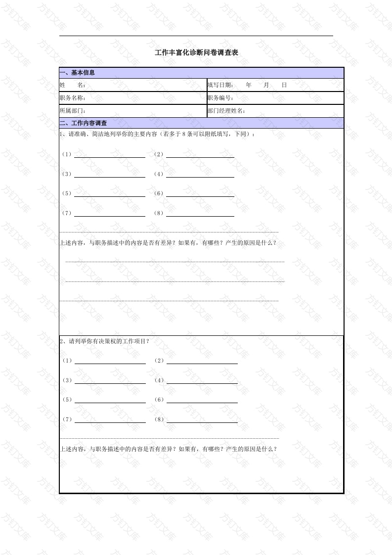 文工作丰富化诊断问卷调查表基本信息姓名:填写日期:年月日职务名称:职务编号:所属部门:部门经理姓名:工作内容调查请准确、简洁地列举你的主要内容〔若多于8条可以附纸填写,下同):1)2)方(3)(4)方(7)(8)上述内容,与职务描述中的内容是否有差异?如果有,有哪些?产生的原因是什么?2、请列举你有决策权的工作项目?(1)(2)(6)(7)8)上述内容,与职务描述中的内容是否有差异?如果有,有哪些?产生的原因是什么?库请列举你没有决策权的工作项目?库(4)方(6)(8)万上述内容,与职务描述中的内容是否有差异?如果有,有哪些?产生的原因是什么?方三、职业发展调查请描述你为自己设定的职业发展目标?你认为这个目标和企业为你制定的发展目标如果不一差别在什么地方?钉为了达成你个人的职业发展目标,你认为企业应该为你做此什么?在当前的职务情况下,你是如何向你的职业发展目标迈进的?四、适应性调查你是否还具有工作的热情?如果没有,则原因是什么?钉万你是事对现在的状态感到满意?如果不满意,你希望什么样的状态?方你是否能在没有工作热情时,同样做好自己的工作?你是否认为工作和举相结合很重要?五、相关问题调查方你自己在工作中最大的困难和苦恼是什么?方2、你是否喜欢为自己的工作做计划?方3、你认为直接上级应该在经你那方面的权力?文文你对目前的职务描述和职务资格要求有什么看法?你希望对职务描述和职务资格做哪些内容如何进行修改?方文你对职务资格要求有哪些建议和意见?库库库库方方订方万文