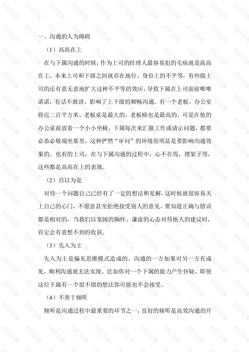 沟通的人为障碍1)高高在上在与下属沟通的时候,作为上司的经理人最容易犯的毛病就是高高在上。本来上司和下级之间就存在地位、身份上的不平等,有些做上司的还有意无意地扩大这种不平等的效应,导致下属在上司面前唯唯诺诺,有话不敢讲,影响了上下级的顺畅沟通。有一个老板,办公室将近二百平方米,老板桌是最大的,老板椅也是最高的,可是在他的办公桌前放着一个小小坐椅,下属每次来汇报工作或请示问题,都要必恭必敬端坐那里,这种俨然“审问”的环境很明显是要影响沟通效果的。也有的上司,在与下属沟通的过程中,心不在焉,摆架子等这些都是高高在上的表现。(2)自以为是对待一个问题自己已经有了一定的想法和见解,这时候就很容易关上自己的心门,不愿意甚至拒绝接受别人的意见。要知道正确与错误都是相对的,当我们以宽阔的胸怀、谦虚的心态对待他人的建议时,肯定会有意想不到的收获。(3)先入为主先入为主是偏见思维模式造成的。沟通的一方如果对另一方有成见,顺利沟通就无法实现。比如你对一个下属的能力产生怀疑,即使这位下属有一个很不错的想法你可能也不会接受(4)不善于倾听倾听是沟通过程中最重要的环节之一,良好的倾听是高效沟通的开始。倾听不仅需要具有真诚的同理心的心态,还应该具备一定的倾听技巧。居高临下,好为人师:自以为是,推己及人:抓耳挠腮,急不左顾右盼,虚应故事;环境干扰,无心倾听:打断对方,变听为说:刨根问底,打探隐私;虚情假意,施舍恩赐等都是影响倾听的不良习惯,应该注意避免。(5)缺乏反馈反馈是沟通的过程中或沟通结束时的一个关键环节,不少人在沟通过程中不注意、不重视或者忽略了反馈,结果沟通效果打了折扣。不少人在沟通中都以为对方听懂了自己的意思,可是实际操作过程中却与自己原来的意思大相径庭。其实,在双方沟通时,多问一句“您说的是不是这个意思…”、“请您再说一下,好吗?”,问题自然就解决了。(6)沟通的位差损耗效应美国加利福尼亚洲立大学研究发现:来自领导层的信息只有20%30%被下级知道并正确理解:从下到上反馈的信息不超过10%被知道和正确理解:而平行交流的效率则可达到90%以上。高效沟通的技巧之清晰、简洁地发送信息在信息发送过程中,信息包括三个方面内容:信息、思想和情感。在沟通中,发送的不仅仅是信息,还有思想和情感。因此,在发送信息的时候,要注意以下几个问题1.选择有效的信息发送方式(HOW有效的信息发送方式在沟通中十分重要,这就要求我们要针对沟通对象和目的的不同选择不同的发送方式。信息发送方式很多,比如会议、电话、亲笔信件、电子邮件、面谈等。如果是一般的说明情况的信息沟通,通过信件、电话、邮件就可以解决;如果是为了交流感情和增加信任,则应该在合适的时间、地点面谈为好2.何时发送信息(WHEN)例如何时约见客户,何时发出致谢函,何时向老板汇报,何时与下属谈心,要讲究“天时、地利、人和”,这一点非常重要。3.确定信息内容(WHAT)信息的内容是沟通的实质,不存在没有任何内容的沟通。因此,在沟通开始前,应该对信息的内容做些适当准备,哪些该说,说到什么程度,哪些不该说。信息的内容应该清晰简洁,用词准确,避免模糊不清或容易引起误解的表述。专业术语在基本确认对方能够理解的情况下方可使用。同时还应该注意的是信息的载体,比如语音、语调、肢体语言的不同运用,就会给对方形成不同的感受,进而影响沟通质4.谁该接受信息(WHO方万万