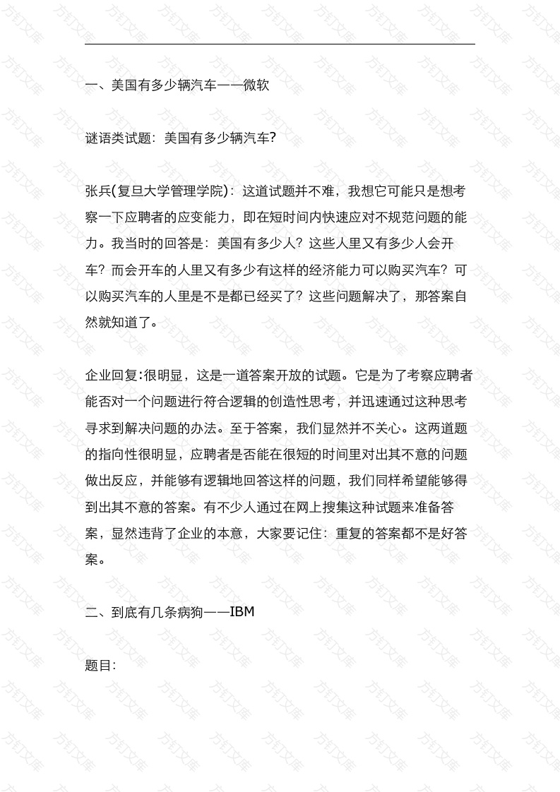 美国有多少辆汽车微软谜语类试题:美国有多少辆汽车?文万张兵(复旦大学管理学院):这道试题并不难,我想它可能只是想考察一下应聘者的应变能力,即在短时间内快速应对不规范问题的能力。我当时的回答是:美国有多少人?这些人里又有多少人会开车?而会开车的人里又有多少有这样的经济能力可以购买汽车?可以购买汽车的人里是不是都已经买了?这些问题解决了,那答案自然就知道了。企业回复:很明显,这是一道答案开放的试题。它是为了考察应聘者能否对一个问题进行符合逻辑的创造性思考,并迅速通过这种思考寻求到解决问题的办法。至于答案,我们显然并不关心。这两道题的指向性很明显,应聘者是否能在很短的时间里对出其不意的问题做出反应,并能够有逻辑地回答这样的问题,我们同样希望能够得到出其不意的答案。有不少人通过在网上搜集这种试题来准备答案,显然违背了企业的本意,大家要记住:重复的答案都不是好答到底有几条病狗IBM方题目:方方万万万村子里有50个人,每人有一条狗。在这50条狗中有病狗(这种病不会传染)。于是人们就要找出病狗。每个人可以观察其他的49条狗,以判断它们是否生病,只有自己的狗不能看。观察后得到的结果不得交流,也不能通知病狗的主人。主人一旦推算出自己家的是病狗就要枪毙自己的狗,而且每个人只有权利枪毙自己的狗,没有权利打死其他人的狗。第一天,第二天都没有枪响。到了第三天传来一阵枪声,问有几条病狗,如何推算得出?小朱(华南理工大学生物系):我用自己随身携带的笔在纸上划了下,把各种关系用图和箭头进行了标注。第一种推论1.假设有1条病狗,病狗的主人会看到其他狗都没有病,那么就知道自己的狗有病,所以第一天晚上就会有枪响。因为没有枪响,说明病狗数大于1。2.假设有2条病狗,病狗的主人会看到有1条病狗,因为第一天没有听到枪响,说明病狗数大于1,所以病狗的主人会知道自己的狗是病狗,因而第二天会有枪响。既然第二天也没有枪响,说明病狗数大于2。由此推理,如果第三天枪响,则有3条病狗。种推论万万万1.如果为1条病狗,第一天那条狗必死,因为狗主人没看到病狗,但病狗存在。2.若为2条病狗,狗主人为a、b。a看到一条病狗,b也看到一条病狗,但a看到b的病狗没死故知狗数不为1,而其他人没病狗,所以自己的狗必为病狗,故开枪;而b的想法与a一样,故也开枪。由此,为2时,第一天后2条狗必死。3.若为3条病狗,狗主人为a、b、c。a第一天看到2条病狗,若a设自己的不是病狗,由推理2,第二天看时,那2条狗没死,故狗数肯定不是2,而其他人没病狗,所以自己的狗必为病狗,故开枪;而b和c的想法与一样,故也开枪。由此,为3时,第二天后3条狗必4.余下即为递推了,由n-1推出n。答案:n为4。第四天看时,狗已死了,但是在第三天死的,故答案是3条。企业回复:这样的问题考察人的思维严密性和思维活跃性。小朱同学的回答当时很让我们感到吃惊,他能在这样的环境下保持冷静的头脑,确实很难得。三、如果你进入迷宫GOOGLE问题一方方万万