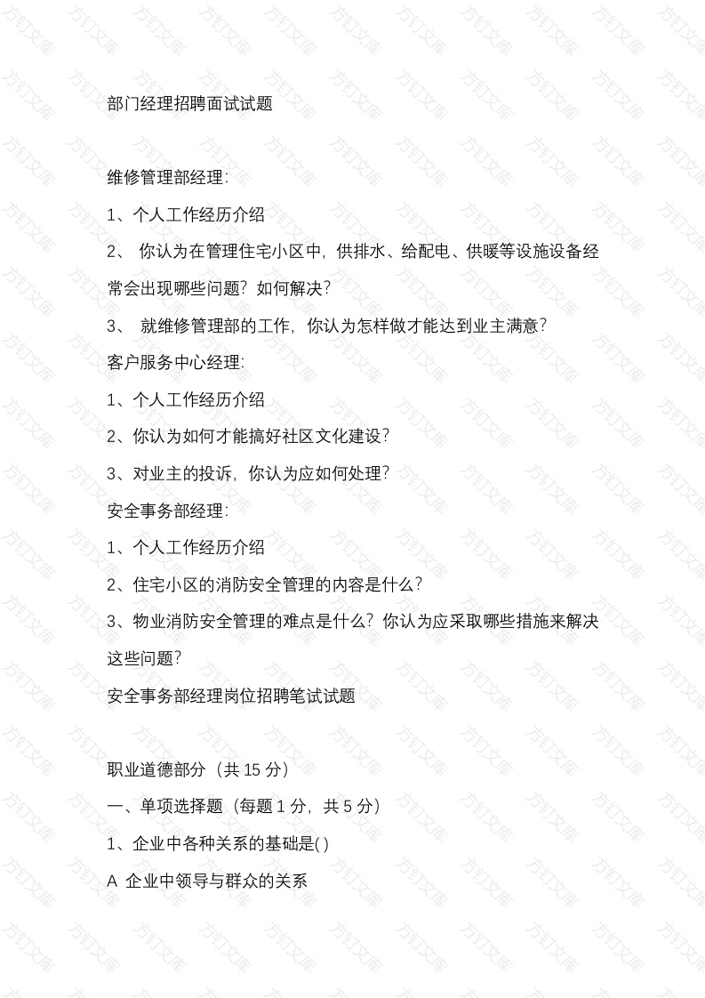 部门经理招聘面试试题方维修管理部经理1、个人工作经历介绍2、你认为在管理住宅小区中,供排水、给配电、供暖等设施设备经常会出现哪些问题?如何解决?3、就维修管理部的工作,你认为怎样做才能达到业主满意?客户服务中心经理1、个人工作经历介绍2、你认为如何才能搞好社区文化建设?3、对业主的投诉,你认为应如何处理?安全事务部经理1、个人工作经历介绍万文2、住宅小区的消防安全管理的内容是什么?3、物业消防安全管理的难点是什么?你认为应采取哪些措施来解决这些问题?安全事务部经理岗位招聘笔试试题职业道德部分(共15分)单项选择题每题1分,共5分)企业中各种关系的基础是()企业中领导与群众的关系万万万B企业中职工之间的关系方企业中领导之间的关系D职工与企业的关系方2、企业形象的本质是()A企业环境B企业产品职工风貌D企业信誉3、职业责任与职业道德责任的关系是()两个因素无关系B两者为同一命题职业道德责任中引申出职业责任D职业责任中引申出职业责任4、无论你从事的工作多特殊,它总是离不开一定的()约束A岗位责任B家庭美德C规章制度D职业道德5、节俭是()法宝方A修身B持家C治国D修身,持家,治国二多选题(每题1分,共5分1、文明礼貌的具体要求是()A仪表端装B语言规范C举止得体D待人热情爱岗敬业具体要求主要是()万万A树立职业理想万B强化职业责任C提高职业技能方D施展个人才干文3、企业信誉主要依赖三个要素()A产品质量B服务质量C价格低廉D信守诚信E售后维修4、团结互助的基本要求是()方A平等尊重B顾全大局C互相学习D加强协作万5、下列说法中,符合“语言规范”具体要求的是A多说俏皮话B用尊称,不用忌语C语速要快,节省客人时间D不乱幽默,以免客人误解三、主观题(每题1分,共5分)方1、以下说法中,你认同哪一种观点()按领导的意思办事就是忠诚企业的表B敢于对领导提出批评地是忠诚企业的表现万C严格遵守企业的规章制度是忠诚企业的表现0忠诚企业就要大胆的批评领导万文万