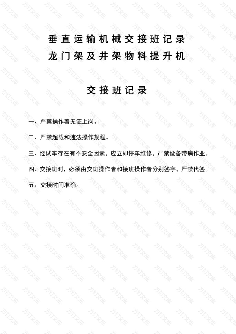 垂直运输机械交接班记录龙门架及井架物料提升机交接班记录严禁操作着无证上岗。方严禁超载和违法操作规程。经试车存在有不安全因素,应立即停车维修,严禁设备带病作业。四、交接班时,必须由交班操作者和接班操作者分别签字,严禁代签。交接时间准确。方方方方方方万文文方方万方试车检查记录检查项目及要求结果架体稳定,螺栓牢固,焊缝无裂纹和开焊缆风绳受力均衡,张紧适度,地锚无松动连墙杆牢固,无变形文吊篮(笼)完好无变形、开焊,笼门开关灵活,各部防护齐全提升钢丝绳完好,固定端牢固各限位器灵敏可靠,保险装置、保护设施齐全有效料台及防护门符合要求,地面进料口防护棚、防护门、卷扬机操方作棚符合要求联络信号清晰准确按钮开关灵敏可靠文空车升降试验,机构无异常本班司机:年月日方万万交接班记录本设备运行情况:方方本班设备作业项目及内容:方文班应注意的事项:方方方交班司机:接班司机:交接时间:库方方方年月日时分库方方万