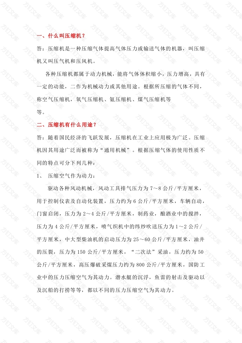 什么叫压缩机?压缩机是一种压缩气体提高气体压力或输送气体的机器,叫压缩机又叫压气机和压风机。各种压缩机都属于动力机械,能将气体体积缩小,压力增高,具有定的动能,二作为机械动力或其他用途。根据所压缩的气体不同,称空气压缩机,氧气压缩机、氨压缩机、煤气压缩机等等。二、压缩机有什么用途?答:随着国民经济的飞跃发展,压缩机在工业上应用极为广泛。压缩机因其用途广泛而被称为“通用机械”。根据压缩气体的使用性质不同的特点可分下列几种:压缩空气作为动力:驱动各种风动机械,风动工具排气压力为7~8公斤/平方厘米,用于控制仪表及自动化装置,压力约为6公斤/平方厘米,车辆自动,门窗启闭,压力为2~4公斤/平方厘米,制药业,酿酒业中的搅拌,压力为4公斤/平方厘米,喷气织机中的纬纱吹送压力为1~2公斤平方厘米,中大型柴油机的启动压力为25~60公斤/平方厘米,油井的压裂,压力为150公斤/平方厘米,“二次法”采油,压力约为50公斤/平方厘米,高压爆破采煤压力约为800公斤/平方厘米,国防工业中的压力压缩空气为其动力。潜水艇的沉浮,鱼雷的射击及驱动以及沉船的打捞等等,都以不同的压力压缩空气为其动力。压缩气体用于制冷和气体分离:气体经压缩、冷却、膨胀而液化,用于人工制冷(冷冻冷藏及空气调节等)如氨或氟利昂压缩机。其压缩压力多为8~12公斤/平方厘米,这一类压缩机通常成为“制冷机”或“冰机”。另外在液化的气体若为混合气时,可在分离装置中,将各组份分别地分离出来,得到合格唇读地各种气体。如空气液化分离后能得到的纯氧、纯氮、和纯的氙、氪、氩、氦等稀有气体。3、压缩气体用于合成及聚合:在化学工业中,气体压缩至高压,常有利合成及聚合。例如氮氢合成氨,氢与二氧化碳合成甲醇、二氧化碳与氨合成尿素等。化学工业中,例如高压聚乙烯的压力达1500~3200公斤/平方厘压缩气体有难关于油的加氢精制:石油工业中,用人工方法把氢加热,加压后与油反应,能使碳氢化合物的重组份裂化成碳氢化合物的轻组分,如重油的轻化,润滑油加氢精制等。气体输送:用于管道输送气体的压缩机,视管道长短而决定其压力。送远程煤气时,压力可达30公斤/平方厘米。氯气装瓶压力为10~15公斤/平方厘米,氧化碳装瓶压力为50~60公斤/平方厘米文万万万压缩机是怎样分类的?压缩机按结构形式的不同分类如下:万按其原理可分为:往复式(活塞式)压缩机、回转式(旋转式)压缩机(涡轮式、水环式、透平)压缩机,轴流式压缩机,喷射式压缩机及螺杆压缩机等各种型式,其中应用最为广泛的是往复式(活塞式)压缩机。四、活塞式压缩机怎样分类?答:活塞式压缩机分类的方法很多,名称也各不相同,通常有如下几种分类方法:(一)按压缩机的气缸位置(气缸中心线)可分为:(1)卧式压缩机,气缸均为横卧的(气缸中心线成水平方向)(2)立式压缩机气缸均为竖立布置的(直立压缩机)。(3)角式压缩机,气缸布置成L型、V型、W型和星型等不同角度的。(二)按压缩机气缸段数(级数)可分为:(1)单段压缩机(单级):气体在气缸内进行一次压缩。(2)双段压缩机(两级):气体在气缸内进行两次压缩。《3)多段压缩机(多级):气体在气缸内进行多次压缩。(三)按气缸的排列方法可分为:1)串联式压缩机:几个气缸依次排列于同一根轴上的多段压缩机,又称单列压缩机文万