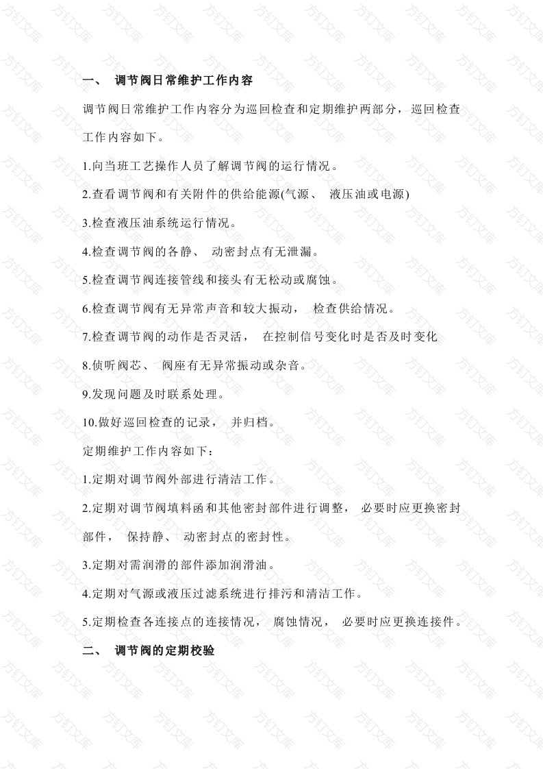 调节阀日常维护工作内容调节阀日常维护工作内容分为巡回检查和定期维护两部分,巡回检查工作内容如下。1.向当班工艺操作人员了解调节阀的运行情况。方2.查看调节阀和有关附件的供给能源(气源、液压油或电源)3.检查液压油系统运行情况。4.检查调节阀的各静、动密封点有无泄漏。5.检查调节阀连接管线和接头有无松动或腐蚀万6.检查调节阀有无异常声音和较大振动,检查供给情况。7检查调节阀的动作是否灵活,在控制信号变化时是否及时变化8.侦听阀芯、阀座有无异常振动或杂音9.发现问题及时联系处理。10.做好巡回检查的记录,并归档。文万文定期维护工作内容如下:1.定期对调节阀外部进行清洁工作2.定期对调节阀填料函和其他密封部件进行调整,必要时应更换密封部件,保持静、动密封点的密封性。3.定期对需润滑的部件添加润滑油4.定期对气源或液压过滤系统进行排污和清洁工作5.定期检查各连接点的连接情况,腐蚀情况,必要时应更换连接件。调节阀的定期校验万万调节阀预见性维护工作尚未开展的单位,应对调节阀进行定期校验定期校验工作是预防性维护工作根据不同工艺生产过程,调节阀的定期校验应有不同的校验周期。结合制造商提供的资料确定各调节阀定期校验的周期。通常可在工艺生产过程进行大修的同时进行。些调节阀应用在高压、高压降或腐蚀性较强的场合时,检验周期要缩短。检验的内容主要是调节阀静态性能测试,必要时可增加相应的测试项目,例如调节阀流量特性的测试等。定期校验需要有关测试设备和仪器,还需要有更换的部件,因此,通常可委托制造商完成。调节阀的维修调节阀维修分应急维修定期维修和预见性维修。应急维修是调节阀出现故障,不能满足工艺操作要求时的维修。定期维修通常包括日常维修和与工艺停车大修同时进行的维修。预见性维修是根据预见性维护的分析结果,有针对性地对有关调节阀部件的维修。应急维修是调节阀发生故障后的维修,◇定期维修和预见性维修是调节阀发生故障前的维修。通常,调节阀的日常维修由仪表维修人员进行与大修同时进行的定期维修由制造技术人员进行。调节阀日常检查和保养工作包括下列内容:.消除应力。由于安装或组合不当造成各种应力。例如,高温介质产生热应力,安装时紧固力不平衡造成应力等。应力的不平衡作用在调节阀上,使调节阀阀杆、导向件变形,不能正确与阀座对中造成泄漏,变差增大等。因此,在日常维修中应进行消除应力的维修万2.清除铁锈和污物。经常检查调节阀连接管道内有无铁锈、焊渣、污发现后应及时清除。因为这些污物会造成调节阀阀芯和阀座的磨损,影响调节阀的正常运行。通常,可在调节阀前加装过滤网等过滤装置,并定期清洗。3检查调节阀支撑。调节阀支撑使调节阀的各部件处于不受重力等影响的位置。如果支撑不当会造成调节阀阀杆与阀座不能对中,使变密封性能下降。因此,应检查调节阀支撑是否合适4清除气源、液压油等供应能源的污物。气源、液压源是调节阀运行的能量来源。仪用压缩空气、液压油中所含的杂质会堵塞节流孔和管道,造成故障。因此,定期检查气源、液压油,定期对过滤装置进行排污十分重要。5.齿轮传动装置的检查。对手轮机构、电动执行器和液动执行器的齿轮传动装置应定期检查,添加润滑剂,防止咬卡现象发生。应检查制动和限位装置是否灵活好用。6.填料函检查。应检查填料的磨损情况和压紧力,定期更换填料函,保证填料能够在起到密封的同时,减少其摩擦力的影口向。对无油润滑的填料函不应添加润滑油。7.安全运行的检查。对在爆炸性危险场所使用的调节阀和有关附件应检查其安全运行情况。例如,密封盖是否拧紧,安全栅的运行情况,电源供应情况等,保证调节阀及有关附件能够安全运行。运输和保管。调节阀在运输和保管期间,应用专用支架固定,防止松动:安装在调节阀上的有关附件,如阀门定位器、手轮机构等