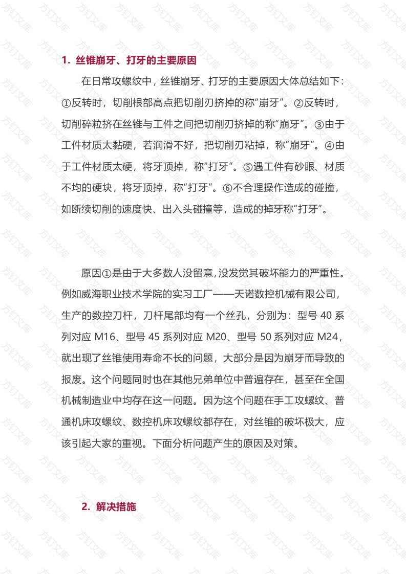 丝锥崩牙、打牙的主要原因在日常攻螺纹中,丝锥崩牙、打牙的主要原因大体总结如下①反转时,切削根部高点把切削刃挤掉的称“崩牙“。②反转时切削碎粒挤在丝锥与工件之间把切削刃挤掉的称“崩牙”。③由于工件材质太黏硬,若润滑不好,把切削刃粘掉,称“崩牙”。④由于工件材质太硬,将牙顶掉,称“打牙”。⑤遇工件有砂眼、材质不均的硬块,将牙顶掉,称“打牙”。⑥不合理操作造成的碰撞,如断续切削的速度快、出入头碰撞等,造成的掉牙称“打牙”。原因①是由于大多数人没留意,没发觉其破坏能力的严重性。例如威海职业技术学院的实习工厂天诺数控机械有限公司,生产的数控刀杆,刀杆尾部均有一个丝孔,分别为:型号40系列对应M16、型号45系列对应M20、型号50系列对应M24就出现了丝锥使用寿命不长的问题,大部分是因为崩牙而导致的报废。这个问题同时也在其他兄弟单位中普遍存在,甚至在全国机械制造业中均存在这一问题。因为这个问题在手工攻螺纹、普通机床攻螺纹、数控机床攻螺纹都存在,对丝锥的破坏极大,应该引起大家的重视。下面分析问题产生的原因及对策。2解决措施万万首先通过图1所示进行说明:图1中工件固定,丝锥旋转主切削刃标记为E,背去屑刃标记为F。图1a是丝锥切削,丝锥倒转,把切削碎断,以便于排出;图1c是丝锥背去屑刃F,把切削切断,留下高点G,高度为丝锥后角差值(EF弧长的后角差高度)图1d是因高点G而导致的丝锥崩齿。方主切削刃F主切削刃F方高点G万图大部分材质的工件,当背去屑刃F后退至切削根部附近,就能把切削顶断(见图1b),但会留有高点,如果继续后退,用背去屑刃F把高点铲矮或把切削切断(见图1c),再继续后退,就是过盈的强制性后退,因为丝锥后面是带有6°~8°后角的斜面,到主切削刃E附近过盈最大,最容易过盈挤压,使主切削刃崩齿见图1d)。现在的机用丝锥切削刃较短,主要以二扣半丝左右进行切削,特别是大一点直径丝锥,单刃切削余量大,遇到的工件材质稍微黏硬,高点G的抗力就增大,此时丝锥最容易崩齿,因为这个高点的顶抗作用力与切削时的作用力,对切削刃是双向疲劳交替破坏,大大降低了丝锥刃部的持久极限,图2所示是剖开的M12丝锥(没攻通),反转后主切削刃过高点的照片。凸起处即为高点G,主切削刃过高点后,高点处有明显摩擦发亮痕迹,但凸起仍然很明显,极易造成丝锥崩齿。方方订转的高点G图2万通过大量实践操作,发现当丝锥反转少于切削刃数分之一时方即三刃丝锥反转少于三分之一、四刃丝锥反转少于四分之一时,丝锥崩齿的概率降为最低,只要丝锥反转,把切削碎断,容易排屑即可,就能达到后退的目的,不必让主切削刀过高点G,这样万万