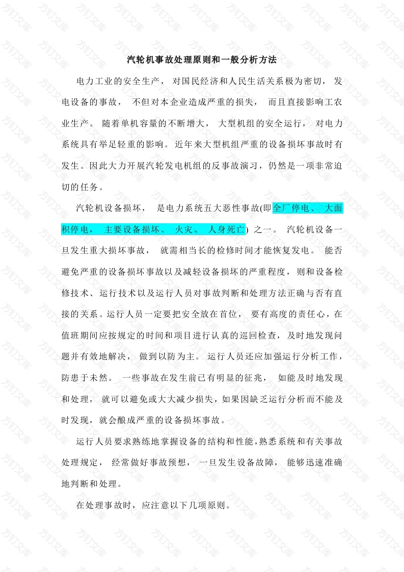汽轮机事故处理原则和一般分析方法电力工业的安全生产,对国民经济和人民生活关系极为密切,发电设备的事故,不但对本企业造成严重的损失,而且直接影响工农业生产。随着单机容量的不断增大,大型机组的安全运行,对电力系统具有举足轻重的影响。近年来大型机组严重的设备损坏事故时有发生。因此大力开展汽轮发电机组的反事故演习,仍然是一项非常迫切的任务。汽轮机设备损坏,是电力系统五大恶性事故(即全厂停电、主要设备损坏、火灾、人身死亡)之一。汽轮机设备旦发生重大损坏事故,就需相当长的检修时间才能恢复发电。能否避免严重的设备损坏事故以及减轻设备损坏的严重程度,则和设备检修技术、运行技术以及运行人员对事故判断和处理方法正确与否有直接的关系。运行人员一定要把安全放在首位,要有高度的责任心,在值班期间应按规定的时间和项目进行认真的巡回检查,及时地发现问题并有效地解决,做到以防为主。运行人员还应加强运行分析工作,防患于未然。一些事故在发生前已有明显的征兆,如能及时地发现和处理,就可以避免或大大减少损失,如果因缺乏运行分析而不能及时发现,就会酿成严重的设备损坏事故。运行人员要求熟练地掌握设备的结构和性能,熟悉系统和有关事故处理规定,经常做好事故预想,一旦发生设备故障,能够迅速准确地判断和处理。在处理事故时,应注意以下几项原则。文文1)在事故发生时切忌主观、片面,应根据有关表计指示、信号以及机组对外部征兆进行综合分析,并尽可能及时地向班长、值长汇报,以便统一指挥。如果班长、值长不在事故现场,会应根据运行规程有关规定,及时进行处理。○如已达到紧急故障停机条件,可不请示领导,立即破坏真空紧急停机。在紧急情况下,如不能果断地处理而逐级请示,就会廷误时间,造成事故扩大。般地说,在电网容量较大的情况下,个别机组停运不会对电网造成很大的危害。相反,若主设备特别是高压大容量汽轮发电机组严重损坏,长期不能修复,对整个电力系统稳定运和的影响是严重的,所以要力求设备的安全,在紧急情况下要果断地按照规程规定打闸停机,切不可存在侥幸心理,拖延处理时间,造成事故扩大。(2)在事故处理中要坚守岗位,沉着冷静,抓住重点进行操作处理,不要急躁慌乱,顾此失彼,以致误操作而扩大事故。(3)机组发生故障时,值班人员必须首先解除对人身和设备安全有威胁的系统,同时应注意保持维护非事故设备的安全运行,并加强对公用系统的监视和调整,根据电网频率,是当地增加非事故机组的出力,尽量保持系统运行稳定。在事故处理结束后,应抓紧时间立即进行深入细致的调查,以便正确确定事故发生的原因,制定有关防范技术措施,防止再次发生类似事故,并确定事故责任。在电厂中,事故调查工作的特点是时间紧迫,在事故发生后,为满足工农业用电的急需,减少事故所造成的损失,往往要组织抢修,尽早地恢复事故设备的工作能力。这样就在求在很短的时间内完成大量的调查研究工作,进行细致的客观的分析,避免得出可能错误的结论。然而事故的真正原因往往不能轻而易举地作出准确的判断,这是因为一方面造成某本个设备或零部件的损坏可能由多种原因造成,如汽轮机的异常振动,往往需要进行大量的试验研究工作才能最后确定事故的原因:另一方面由于发生事故引起的二次性设备损坏,使因果关系混淆,例如叶片组的围带拉金断落会引起叶片的断裂,叶片的断裂也会引起围带的飞脱。尤其是在事故发生后判断错误,延误了时间,造成事故扩大以致造成设备的严重损坏时,要确定引起事故的真正原因,就更加困难。而对于制定有效的防范类似事故发生措施来说,正确地确定事故的原因是非常重要的。面仅从技术角度,讨论一下汽轮机事故的一般分析方法和程序,供事故分析时参考。(1)在事故发生后,根据运行班长、值长的报告的现场记录以及现场可以看到的事故范围,判断确定事故的性质、需要进一步检查的项目和调查组织范围,并由现场条件作出初步的结论。(2)抓紧时间向有关人员了解情况,主要向当事人以及能够提供有价值情况的其他人员了解、收集有关事故的各种资料。在消除了事故后,立即向有关人员了解有关事故发生、发展经过的感性材料,而不急于了解事故发生的原因、后果以及各种推测和见解。重点地调查确定如下各项内容:1)事故象征最早发生的时间:文万万