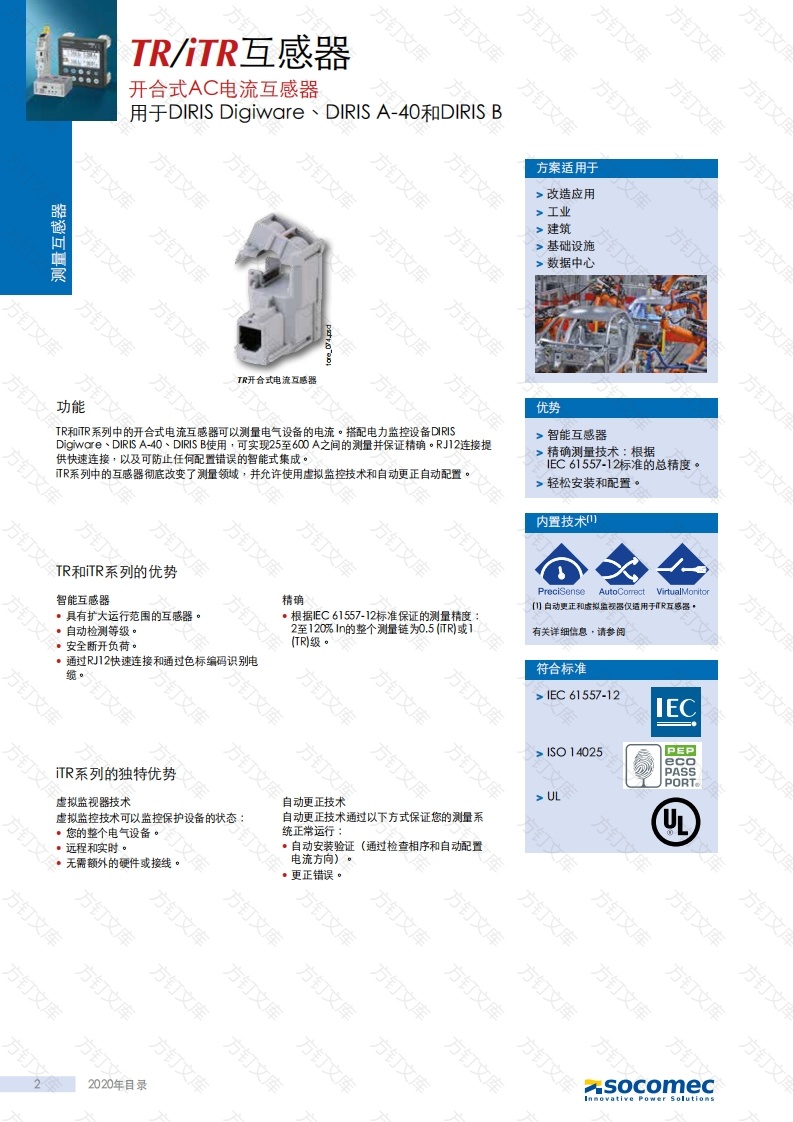 TR/iTR互感器万开合式AC电流互感器用于DIRIS Digiware、DIRIS A-40和DIRIS B万方方案适用于>改造应用>工业>基础设施>数据中心方订TR开合式电流互感器功能优势TR和TR系列中的开合式电流互感器可以测量电气设备的电流·搭配电力监控设备DRIS>智能互感器Digiware、DIRIS A-40、DRSB使用,可实现25至600A之间的测量并保证精确。RJ12连接提供快速连接,以及可防止任何配置错误的智能式集成。精确测量技术:根据1EC61557-12标准的总精度。TR系列中的互感器彻底改变了测量领域,并允许使用虚拟监控技术和自动更正自动配置。内置技术TR和iTR系列的优势万智能互感器PreciSenseVirtualMorit精确·具有扩大运行范围的互感器。·根据1EC61557-12标准保证的测量精度:·自动检测等级。2至120%1n的整个测量链为0.5(TR或1有关详细信息·请参阅·安全断开负荷。·通过RJ12快速连接和通过色标编码识别电缆。符合标准>1EC61557-12IECTR系列的独特优势PEPPASSPORT虚拟监视器技术自动更正技术>UL虚拟监控技术可以监控保护设备的状态:自动更正技术通过以下方式保证您的测量系·您的整个电气设备。统正常运行:·远程和实时。·自动安装验证(通过检查相序和自动配置·无需额外的硬件或接线。电流方向)。。更正错误。22020年目录方socomecTR/iTR.互感器开合式AC电流互感器用于DIRIS Digiware~DIRIS A4O和DIRIS B安装尺寸电缆安装TR-10/TR-14/TR21/TR-32A型号(mm](mm](mm](mm](mm](mm]TR /TR-1025.63442%28万文TR /TR-1440.16008.1926728141514TR /TR-2163.25037TR /ITR-3232.…720533232技术特性型号TR-10 iTR-10TR-32 iTR-32额定电流范围h(시25.634016063.250160.600081921.26.300最大电流시75619230072074117211311最大电压(相/中线)额定耐压时过载测量类别CAT1级0.5级1级0.5级1级0.5级1级0.5级保护等级工作温度范围-10至+70°C储存温度范围25至+85°C相对湿度海拔高度连接产品编号型号产品编号型号产品编号25…63057548290555TR-10104016008.1921448290556TR-1440…1600.8…1921463-250126m30021TR-2163…2501.26-3002148290558TR-32160…6003.2-7203250米RJ45电10005210个水品头产品编号产品编号产品编号产品编号产品编号产品编号产品编号产品编号产品编号14829060348290601482905804829058248290584482g059948290590482059148290592482☒059748290594socomec2020年目录