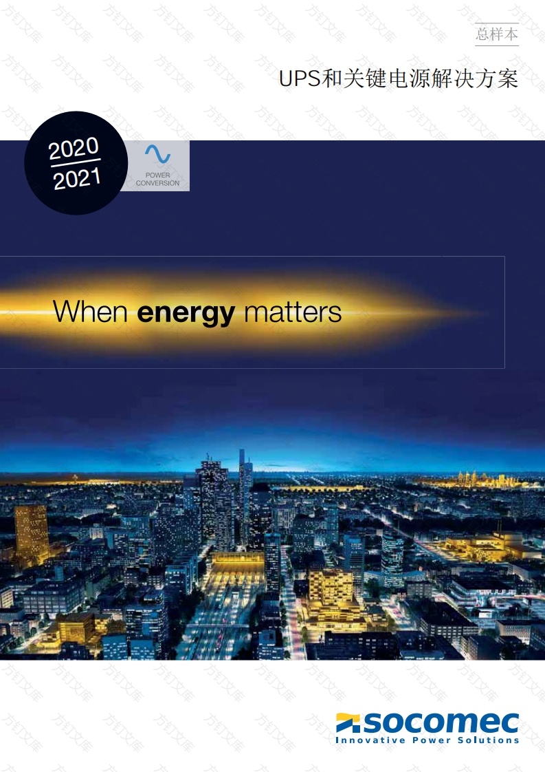 总样本万UPS和关键电源解决方案文20202021POWERCONVERSIONWhen energy matters方钉钉socomecInnovative Power solutions文方方方方方方方方订方方方万目录方万文万选型指南旗舰版、卓越版44选型指南经典版第页6无论何时何地,确保电气设备能绩效都至关重要。第89专业服务第页10电源转换专家第页12关联服务,第页14方文旗舰版第页17完全容错的电源模块化和冗余解决方案经过精心设计,可以预测事件并预测故障,以确保最大的有效性。卓越版第页39无与伦比的电气性能具有经认证性能的一流解快方案,旨在优化利用率以实现最佳总拥有成本(TCO)。经典版值得信赖的电源UPS和AC/DC解决方案能提供可靠且高性价比的保护,以确保电源系统运行的连续性。互补解决方案第页75,后备电源存储通讯和接口socomec万2020-2021年目录