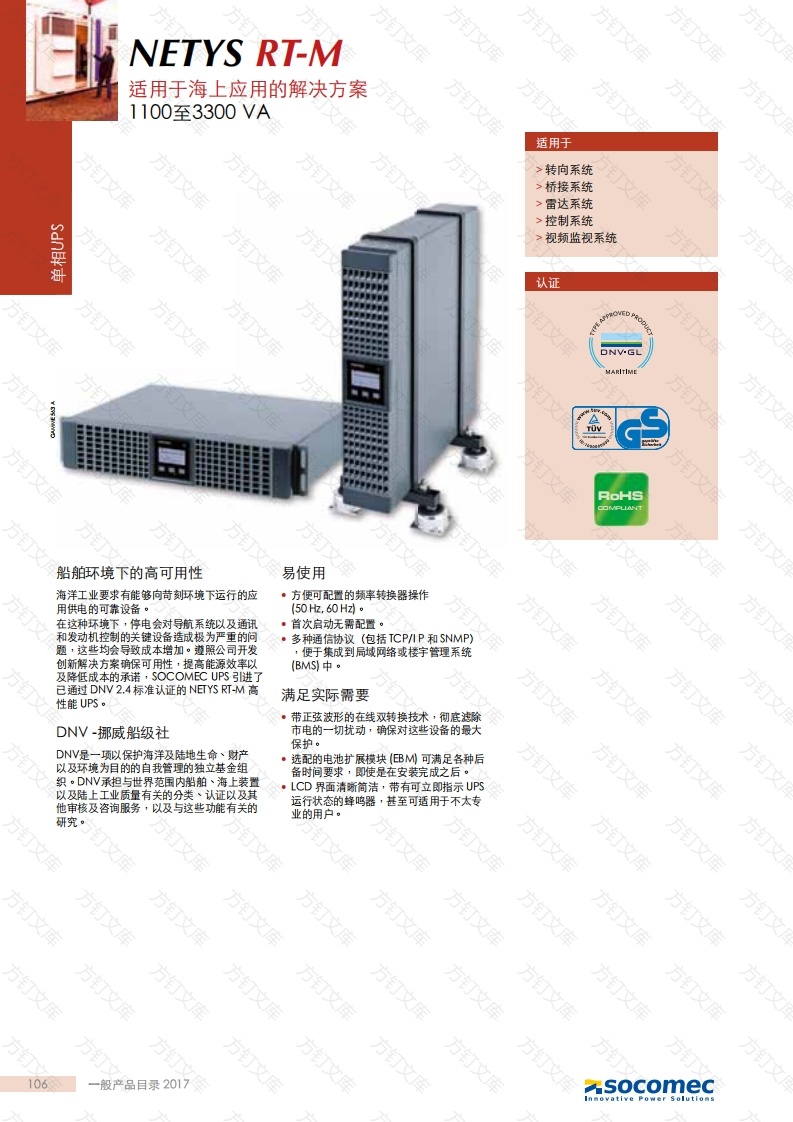 NETYS RT-M万订适用于海上应用的解决方案1100至3300VA适用于方转向系统>桥接系统>雷达系统>控制系统视频监视系统认证ONV.GLARITIM船舶环境下的高可用性易使用海洋工业要求有能够向苛刻环境下运行的应·方使可配置的频率转换器操作用供电的可靠设备。在这种环境下,停电会对导航系统以及通讯·首次启动无需配置。和发动机控制的关键设备造成极为严重的问·多种通信协议(包括TCP/IP和SNMP)题,这些均会导致成本增加。遵照公司开发,便于集成到局域网络或楼宇管理系统创新解决方案确保可用性·提高能源效率以(BMS)中。及降低成本的承诺,SOCOMEC UPS进了已通过DNV2.4标准认证的NETYS RT--M高满足实际需要性能UPS。·带正弦波形的在线双转换技术,彻底滤除DNV-挪威船级社市电的一切扰动,确保对这些设备的最大保护。DNV是一项以保护海洋及陆地生命、财产·选配的电池扩展模块(BM可满足各种后以及环境为目的的自我管理的独立基金组备时间要求,即使是在安装完成之后。织。DNV承担与世界范国内船舶、海上装置以及陆上工业质量有关的分类、认证以及其令·LCD界面清断简洁,带有可立即指示UPS他审核及咨询服务·以及与这些功能有关的运行状态的蜂鸣器·甚至可适用于不太专业的用户。研究。方订万106一般产品目录2017socomecNETYS RT-M单相UPS1100至3300VA技术数据控制面板序列号1700VA2200VA3300VA1350w2700W架构具有输入PC和自动旁路的在线双转换V州输入额定电压电压范围175+280伏;70%负载时,最高为120伏额定频率频率范围功率因数/THD输出额定电压230 V (1ph]电压范围可迹择200/208/220/240V频率范围功率因数总在线模式最高93祝过载能力最高105%连续:125%持续3分钟:150%持续30秒连接,存在负载(10A시6个IEC320-C13(10A]+1个EC320-C19(16시2关闭蜂鸣器电池3,负载级别(5级)后备时问心8分钟12分钟8分钟10分钟4,电池状态5,负荷状态电压24VDC48 VDC充电时问不到6小时恢复0容量7输入值通讯8正常模式/电池模式(闪烁)接口R5232(DB9端口)MOD BU5协议,USB HID协议9配置以太网10,可编程输出标配1个干接点卡迹项12,开机/测试和蜂鸣器覆盖按钮EPO输入13,电池故障/更换电池环境4常规警报0C至高达+40°C(15C至25·C可获得最长电池使用命)15,导航按钮DNV24·温度级别为A相对湿度595%,不冷凝标准电气特性最大海拔高度1000米不降容(绿高3000米)噪声水平5037461·内置回馈电路保护。UPS机柜·电话/AD以L调制解调器的大气现象防护89×430×440mm89x608440mm尺寸RACK U2U13kg18kg19kg30kgP20·用于电池扩展模块的连接。89333X440mm89×430X440mm电气选件尺寸RACK U2U重量16kg29 kg43kg标准标准通讯特性EMC·本地视图:适用于Windows,Linux and性能EC/EN620403(效率经由独立机构检验】产品声明Mac OS Xe操作系统的UPS监控和关闭点到点解决方案。HlD:UPS管理基于Windows和·MODBUS RTU。通讯选件·RT-VISION:专业WB/SNMP接口,可用于为多种操作系统提供UPS监视和关机管理功能。万万socomec般产品目录2017107