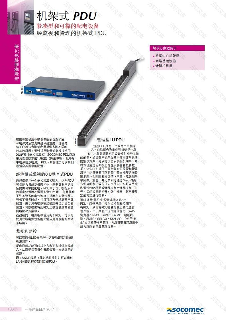 机架式PDU紧凑型和可靠的配电设备万经监视和管理的机架式PDU解决方案适用于>数据中心机架柜>网络基础设施库方订在服务器机房中确保有效的负载扩展管理型1UPDU和电源灵活性变得越来越重要,这就是SOCOMEC为机架应用提供多种不同的这些PDU具有一个或两个单相输PDU的原因。通过采用测量或监视技术的入·非常适合为集成到机架柜中具OU配置(单相或三相)SO0 OMEC PDU以及有中小型能源要求的设备提供业务关键采用管理技术的1U配置(仍是单相,但具有的配电。通过在单机架设备中使用非常紧凑方单电源或双电源)PDU,T管理员可以找到的解决方案,可以将设备安装在机架中·同最适合其要求的配置。时保证通过前面板上的显示屏查看概要数据。这些PDU提供了非常复杂的监视和管理经测量或监视的0U垂直式PDU级别,这意味着可以将每个输出插座的服务器消耗作为瞬时和累计值(电流、能源和功通过仅使用一个单相或三相输入·这些PDU率因数)测量,并记录到可通过eb界面可保证为集成到机架柜中小型电源要求的设方便查阅和下载的日志文件中。也可以手动备提供可靠的配电。PDU由于位于机柜后面和通过Wb界面或远程控制台远程控制(打的垂直位置而不需要安装U空间”,并且简化开、关闭或重新打开)各个插座,甚至按预了许多设备的电气连接,从而在安装过程中定的方式进行控制。节省了很多时间,并且可以方便地调整电源可以采用菊花链配置连接多达5个配置。由于具有很多输出插座并位于适当的PDU,以便从单个接入点控制和监测所位置,可以帮助将此PDU正确安装到高密度有PDU,从而将PDU啭变为真正的电源管网络解决方案中。理系统。由于具有广泛的通信能力(W的通过在同一机架柜中使用两个PDU,可以为使用双路电源设备的关键应用开发的冗余体端、SMTP、SSLV3、SSHV1)并使用安系结构。全协议和多帐户管理,从而使其在T应用中成为理想的电源管理设备。监视和监控可以在两位LD显示屏中方便地读取和监视电流消耗。反向显示功能可以从上方和下方提供电缆输入·从而确保在每个安装位置中提供正确的读数。附加SNMP模块(作为选件提供)可以通过LAN网络远程控制和监视PDU。方订方100一般产品目录2017socomec机架式PDU电源管理解决方案受监视和管理的机架式PDU■零-UPDU接线图1.ON-OFF开关段#12.ON-OFF开关段#253.ON-OFF开关段#3输出连接器段#15.前面板6.输出连接器段27.输出连接器段3通讯选件PDU VISION,用于连接到LAN网络的WEB/SNMP管理器界面。可以将设备4(适用于远程监视)集成到PDU中。5三相型号技术数据零-UPDU项目代码输入■PDU额定电压额定频率5060H额定电流16A连接器EC309-32AE309-16A输出额定电压连接器接口环境传感器环境0至45℃双入口型号的前面板5至9巧%·无冷凝最大海拔高度运行:高达2000米机架式PDU24尺寸(宽度x深度x高度)48x1250x50m4x150x50m354g60gPDU项目代码P01UH116-011输入额定电压额定频率单入口型号的前面板额定电流连接器EC320C201.输入电源状态指示灯输出2输出电源状态指示灯4:山额定电压200-240N3.状态指示灯连接器6+6)1EC320-C134.菊花链模式DP开关(C-链接DIP)通讯5.重置按钮接口RS232-WEBSNMF6.运行模式DIP开关(控制台)端口8.数字输出运行环境度0药0℃9.断路器10至80%·无冷凝最大海拔高度运行:高达2000米机架式PDU尺寸(宽度x深度x高度)20gsocomec般产品目录2017101