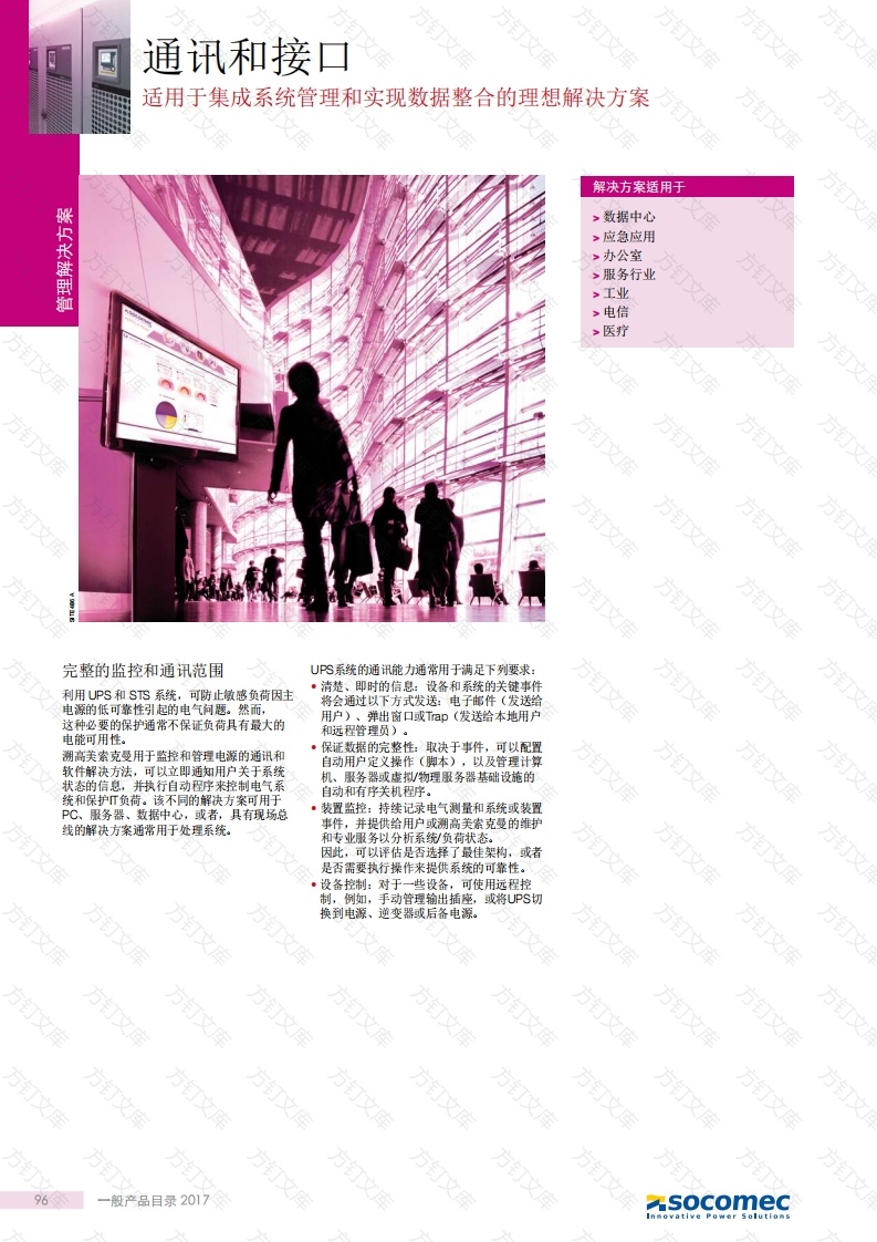 可通讯和接口万适用于集成系统管理和实现数据整合的理想解决方案解决方案适用于>应急应用>服务行业>工业>电信>医疗完整的监控和通讯范围UPS系统的通讯能力通常用于满足下列要求:利用UPS和SS系统,可防止敏感负荷因主·清楚、即时的信息:设备和系统的关键事件将会通过以下方式发送:电子邮件(发送给电源的低可靠性习起的电气问题。然而,方用户)、弹出窗口或Tap(发送给本地用户这种必要的保护通常不保证负荷具有最大的电能可用性。·保证数据的完整性:取决于事件,可以配置溯高美索克曼用于监控和管理电源的通讯和自动用户定义操作(脚本),以及管理计算软件解决方法,可以立即通知用户关于系统机、服务器或虚拟/物理服务器基础设施的状态的信息,并执行自动程序来控制电气系自动和有序关机程序。统和保护T负荷。该不同的解决方案可用于PC、服务器、数据中心,或者,具有现场总·装置监控:持续记录电气测量和系统或装置线的解决方案通常用于处理系统。事件,并提供给用户或溯高美索克曼的维护和专业服务以分析系统/负荷状态。因此,可以评估是否选择了最佳架构,或者是否需要执行操作来提供系统的可靠性。万文·设备控制:对于一些设备,可使用远程控制,例如,手动管理输出插座,或将UPS切换到电源、逆变器或后备电源。万文万文96一般产品目录2017方socomec通讯和接口软件管理解决方案本地监控解决方案本地视图是一款通过USB或RS232串行接更新简单(通过因特网),从而确保了对口进行监视与管理的UPS系统软件,可在PC.工作站和服务器的最高等级保护。本地长时间断电的情况下使系统自动关机。本地视图可避免断电期间因操作员未对P℃、布版和MAC OSx兼容。本地视图软件可从溯作站或服务器进行管理而造成的数据丢失和高美索克曼网站免费下载。系统损坏。它的图形界面设计简洁且便于用户操作,即使对经险很少的用户来说也是如此。本地祝图支持多种语言,可提供清晰、即时及详细的UPS状态信息。网络解决方案(UPS连接到LAN)NET VISION是最常用的以太网接口,适用于主要规范和功能包括:湖高美索克曼产品。它是专为企业网络设计10/100 Mb Etherneti连接RJ45)的通讯接口。UPS的操作和网络外围设备完,通过网络浏览器进行UPS监测,全一样,并可远程管理和允许关闭基于服务·远程关闭独立服务器(与JNC兼容)或虚拟器的工作站。环境(与IRTUAL-JNC兼容),NET VISION允许通过接口直接连接UPS和通过电子邮件将故障通知发送到多达8个以太网网络,从而避免依赖服务器。地址,所以,它兼容于所有的网络和多个OS,因为它可以通过网络浏览器互动。通过SWMP协议进行UPS管理,监控运行环境(可选MD温度和湿度传感器)。可配置报警触发,通过电子邮件通知。万EMD(环境模块设备)NET VISIONEMD是与NET VISION接口结合使用的设备,它提供了以下功能:,温度与湿度测量+干触点输入,,可通过网络浏览器配置报警阀值,通过电子邮件和SNMP陷阱发送环境报警通知。方socomec万般产品目录201797通讯和接口文软件管理解决方案网络解决方案(通过网络关机)受控网络服务器的关机通过关机客户端管它可显示UPS状态和执行UPS以太网接口JNC软件代理(JAVA和.NET客户端)与最新理,该客户端安装在远程服务器上,允许执行其关机功能。JNC(JAA&.NET关机客户高美索克曼在JAA和.net平台上开发。行版以及Mac OS X操作系统兼容。JNC软件端)是一款小型软件程序,安装在要关机的可从溯高美索克曼网站免费下载。计算机上。虚拟系统解决方案最务器虚拟化可以利用T基础设施整合的优在虚拟环境系统上,能够以一个简单、势,并且越来越广泛。因此,在供电系统发有效的方式,管理虚拟机关闭顺序(定生故障时正确管理虚拟机成为一个越来越普义关机类型为有序或间歇),而且,系的需求。RTUAL JNC是湖高美索克受特统具有一个以上的主机(也在群集配置别为虚拟系统设计的解决方案。它完全支持虚拟机关机,即,指示物理服务器正确关闭美索克UPS系统,支持通过LAN关闭管在该服务器上运行的所有虚拟机。中。MIRTUAL-JNC软件可从溯高美索克曼网站免费下载。集中监督解决方案远程视图对于不同UPS系统,网络管理员(或系统除了这些协议,另一个溯高美索克曼解决方如果程序在后台运行,则会显示一则弹出窗管理员)可以从单一控制台看到所有UPS案是远程视图,该集中监挖程序可通过以太口消息。远程视图程序将持续监祝输入和输系统的同步视图。般情况下,使用通过网网路用于UPS系统,它比复杂的NMS平台出电压、电池容量及负荷百分比。工厂管理JBUS/MODBUS协议进行通讯的BMS(建筑简单和使宜。人员和技术人员可以在同一个程序窗口监控管理系统)程序,或通过使用SNMP协议进远程视图是一个可通过以太网,同时监控多所有帆UPS。行数据交换的NMS(网络管理系统)程序来监控设备。用程序。将为用户提供树型祝图(分层结构在工业环境中,通常也使用PROFIBUS或最多可以具有8个级别)和列表视图。当在远程祝图软件可从溯高美索克曼网站免费下PPO巩NET协议与集中控制和自动化系统进行个或另一个监视的UPS中触发警报(推送事载。通讯。湖高美索克曼产品支持这些协议,件)时,该UPS的图标将根据故障严重程度因此可连接到监控程序。改变颜色,并向在程序配置对话框窗口中所设置的多个地址发送电子邮件。文万万98-般产品目录2017万万s