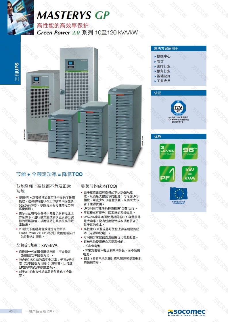 MASTERYS GP高性能的高效率保护Green Power2.0系列10至120kVA/KW万解决方案适用于万>数据中心>电信方订>医疗行业万>服务行业>基础设施>工业应用认证优势节能+全额定功率=降低TCO节能降耗:高效而不危及正常显著节约成本TCO)功能·由于在真正双转换模式下达到96%能效从而最大限度节约能源:与传统UPS能效,这种独特的UPS工作模式确保提供相比,可减少50%能量损耗·从而大大节省了能源费用。完全负荷保护,以防范所有可能的电力网质量问题。·UPS利用节能降耗特性提供“自费运行。·国际认证机构在各种不同的负荷和电压工·节能摸式可提升并联系统的系统效率。作条件下·进行独立测试和认证以得出实·kW-KVA意味着可使用相同的UPS容量获得际的现场数值,从而证明它具有极高的效最大功率:没有过度设计成本从而节省了率输出。每千瓦的成本。万·VF横式下的超高能数通过专为所有高性能1GBT整流器可优化上游基础设施成Green Power2.0UPS系列开发的创新拓扑本(电源和配电)。(3级技术)提供。·可利用非常宽的直流范国优化电池配置。·延长电池使用寿命和提高性能:全额定功率:kW=kVA·向最新一代的服务器供电时,不会降容·非常宽的输入电压和频率接受,而不使用(超前或功率因数为1)。电池。·符合EC62040的真实全功率:千瓦-千伏·EBS(专家电池系统)充电管理可提高电池安(功率因数为1设计)意味着,比传统的使用寿命。UPS的有功功率提高25%。·对于0.9的电容性功率因数负载也不会降容。方46一般产品目录2017万socomecMASTERYS GP三相UPSGreen Power2.0系列10至120 kVA/kW标准电气特性电气选件标准通讯特性·外部维护旁路。·用户友好的多语言界面及彩色图形显示内部维护旁路。·外部电池柜。屏。·回馈保护:检测电路。·附加电池充电器。·调试向导。·用于电池管理的EBS(专家电池系统)·电隔离变压器。·2个插槽用于通讯选件。·电池温度传感器。。并联套件。·ACS同步系统。MODBUS TCP。>技术数据MASTERYS通讯选件100120100输入输出31输入/输出33·BACnet/P接口。并联配置个设备输入用于对许多操作系统进行UPS监视和关机额定电压电压范围额定频率远程监控服务输出·LUNK-UPS,全天侯将您的UPS连接到您的1(符合EC62040-31关键功率专家的远程监控服务。额定电压电压范围静态负荷±1%动态负荷,符合9S好111标准额定频率±2%(可配置与发电机组赚容)<1%总输出电骑变<3%非线性负荷31旁路额定电压额定输出电压电压范围±15%(可配置为10%至20%)额定频率±2%高达96%高达96%在线模式-负荷10%高达96%经济模式环境运行环境温度0%-95%·不冷凝最大海拔高度1000米不降容(最高3000米)1米处噪音S03746)<52加权分贝<55加权分贝<65加权分贝UPS机柜600mm700 mm800mm800mm1000mm1400mm190gP20标准性能符合地震标难根掘统一建筑规范UC,1997区域4按需提供产品声明CE,RCM (E2376))附条件socomec般产品目录201747