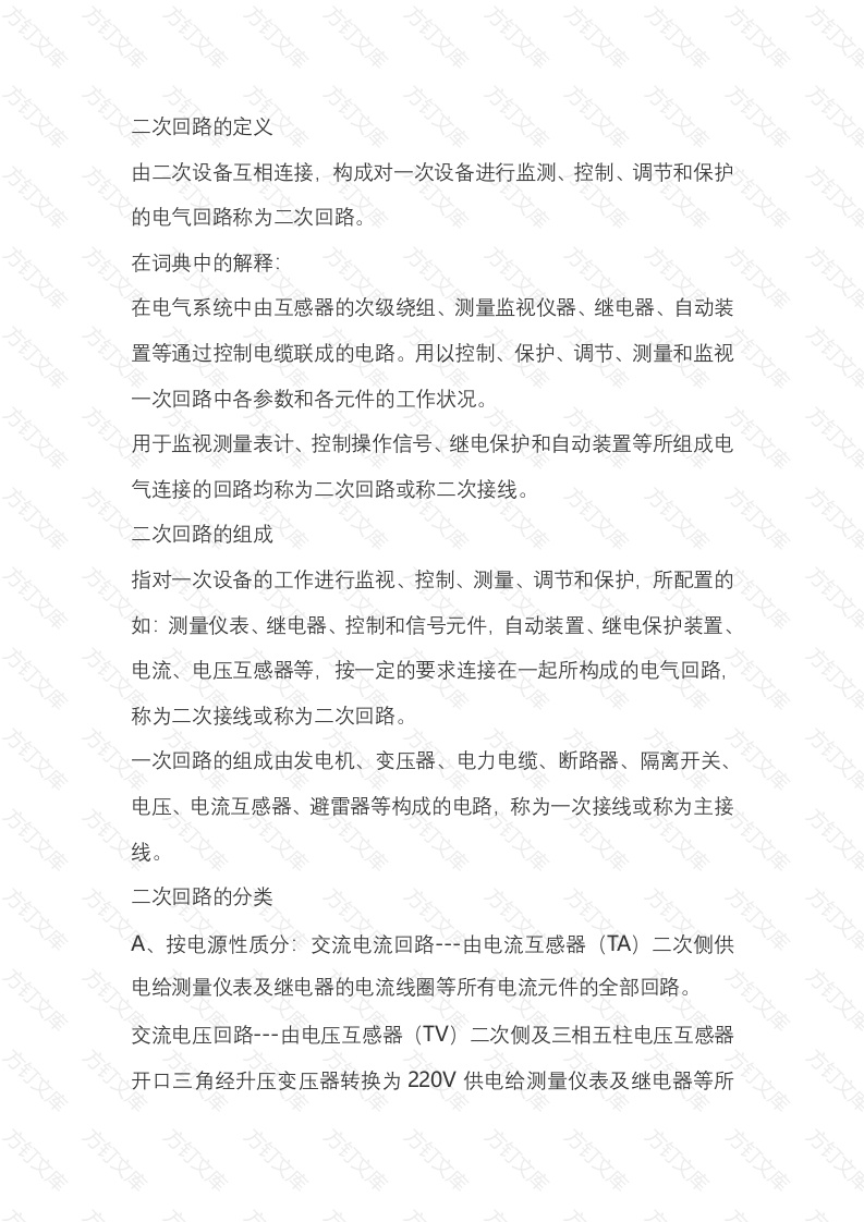次回路的定义由二次设备互相连接构成对一次设备进行监测、控制、调节和保护的电气回路称为二次回路。在词典中的解释在电气系统中由互感器的次级绕组、测量监视仪器、继电器、自动装置等通过控制电缆联成的电路。用以控制、保护、调节、测量和监视次回路中各参数和各元件的工作状况。用于监视测量表计、控制操作信号、继电保护和自动装置等所组成电气连接的回路均称为二次回路或称二次接线。次回路的组成指对一次设备的工作进行监视、控制、测量、调节和保护,所配置的如:测量仪表、继电器、控制和信号元件,自动装置、继电保护装置电流、电压互感器等,按一定的要求连接在一起所构成的电气回路,称为二次接线或称为二次回路。次回路的组成由发电机、变压器、电力电缆、断路器、隔离开关、电压、电流互感器、避雷器等构成的电路,称为一次接线或称为主接线。次回路的分类A、按电源性质分:交流电流回路--由电流互感器(TA二次侧供电给测量仪表及继电器的电流线圈等所有电流元件的全部回路交流电压回路--由电压互感器(TV)二次侧及三相五柱电压互感器开口三角经升压变压器转换为220V供电给测量仪表及继电器等所有电压线圈以及信号电源等直流回路-使用所变输出经变压、整流后的直流电源。蓄电池用于大、中型变、配电所,投资成本高,占地面积大B、按用途区分:测量回路、继电保护回路、开关控制及信号回路断路器和隔离开关的电气闭锁回路、操作电源回路。操动回路-一包括从操动(作)电源到断路器分、合闸线圈之间的所有有关元件,如:熔断器、控制开关、中间继电器的触点和线圈、接线端子等。信号回路-包括光字牌回路、音响回路(警铃、电笛),是由信号继电器及保护元件到中央信号盘或由操动机构到中央信号盘。次回路识图常用的继电保护接线图包括:继电保护的原理接线圈二次回路原理展开图、施工图(又称背面接线图)、盘面布置图1)、看图A、"先看一次后看二次”。次断路器、隔离开关、电流、电压互感器、变压器等。了解这些设备的功能及常用的保护方式,如变压器一般需要装过电流保护、电流速断保护、过负荷保护等,掌握各种保护的基本原理;再查找一、二次设备的转换、传递元件,一次变化对二次变化的影响等B、"看完交流,看直流"。指先看二次接线图的交流回路,以及电气量变化的特点,再由交流量的"因"查找出直流回路的"果”。般交流回路较简单"交流看电源、直流找线圈"。指交流回路一般从电源入手,包含交流电流、交流电压回路两部分;先找出由哪个电流互感器或哪一组电压互感器供电(电流源、电压源),变换的电流、电压量所起的作用,它们与直流回路的关系、相应的电气量由哪些继电器反映出来D、"线圈对应查触头,触头连成一条线”。指找出继电器的线圈后再找出与其相应的触头所在的回路,一般由触头再连成另一回路;此回路中又可能串接有其它的继电器线圈,由其它继电器的线圈又引起它的触头接通另一回路,直至完成二次回路预先设置的逻辑功能。E、"上下左右顺序看,屏外设备接着连"。主要针对展开图、端子排图及屏后设备安装图。原则上由上向下、由左向右看,同时结合屏外的设备一起看。(2)、原理图:对于与二次回路直接相连的一次接线部分绘成三线形式,而其余部分则以单线图表达。原理图多用于对继电保护装置和自动装置的原理学习和分析或作为二次回路设计的原始依据。A、原理图的仪表和继电器都是以整体形式的设备图形符号表示的但不画出其内部的电路图,只画出触点的连接。B、原理图是将二次部分的电流回路、电压回路、直流回路和一次回路图绘制在一起;特点是能使读图人对整个装置的构成有一个整体的概念,并可清楚地了解二次回路各设备间的电气联系和动作原理。C、缺点:对二次接线的某些细节表示不全面,没有元件的内部接线。端子排号码和回路编号、导线的表示仅一部分,并且只标出直流电源