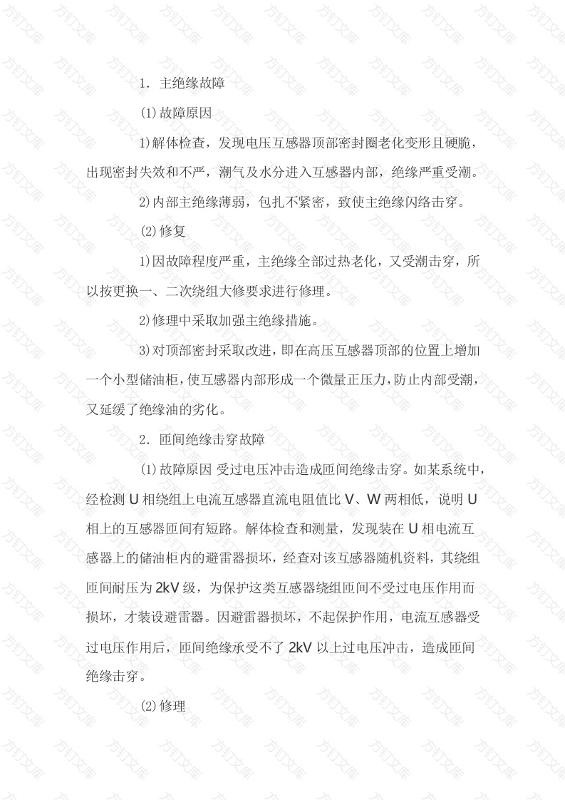 主绝缘故障(1)故障原因1)解体检查,发现电压互感器顶部密封圈老化变形且硬脆出现密封失效和不严,潮气及水分进入互感器内部,绝缘严重受潮。2)内部主绝缘薄弱,包扎不紧密,致使主绝缘闪络击穿。(2)修复1)因故障程度严重,主绝缘全部过热老化,又受潮击穿,所以按更换二次绕组大修要求进行修理。2)修理中采取加强主绝缘措施。3)对顶部密封采取改进,即在高压互感器顶部的位置上增加个小型储油柜,使互感器内部形成一个微量正压力,防止内部受潮,又延缓了绝缘油的劣化。2.匝间绝缘击穿故障(1)故障原因受过电压冲击造成匝间绝缘击穿。如某系统中经检测U相绕组上电流互感器直流电阻值比V、W两相低,说明U相上的互感器匝间有短路。解体检查和测量,发现装在U相电流互感器上的储油柜内的避雷器损坏,经查对该互感器随机资料,其绕组匝间耐压为2kV级,为保护这类互感器绕组匝间不受过电压作用而损坏,才装设避雷器。因避雷器损坏,不起保护作用,电流互感器受过电压作用后,匝间绝缘承受不了2kV以上过电压冲击,造成匝间绝缘击穿(2修理文文万文1)将该互感器先解体吊心,处理次绕组匝间绝缘2)更换合格的避雷器。3)因绝缘油受过电压作用和绕组匝间击穿,绝缘油内有炭化物微粒,油己劣化变质,采取更换新油和真空加热注油措施。修复后的该台互感器接入U相线路后,经测量该台直流电阻,同V、W相阻值一致,投运后一切正常。二次绕组烧坏故障(1)故障原因单匝母线型电流互感器的二次绕组烧损较频繁。单匝母线型电流互感器为高动、热稳定要求严的低安匝数电流互感器,其一次绕组匝数少,为1匝,导线截面积大,流过的电流大:而二次绕组为保护绕组,它的内阻抗很小,在系统短路时,一次绕组流过较大的短路电流,使二次绕组内过电流倍数增加很大,因大电流使绕组过热而烧坏。(2)修理根据这类互感器的结构特点和应用场合要求高动、热稳定,所以不能只采取更换烧坏的绕组(按原有数据绕制线圈)这样运行不久还将烧坏,而应更换改进结构的绕组。改进的方法有两种:一是增大二次绕组导线截面积;是增大铁心截面积。前者做法不合适,因导线截面积越大,二次绕组内阻抗就越小,二次电流也越大。增大铁心截面积属人为的增大绕组内阻抗的办法之一,增大二次绕组阻抗的方法就是增大二次绕组内阻抗,在二次绕组导线截面积不变的情况下,只有增加匝数(导线总长度增加)来实现,更换绕组的同时,增加铁心叠片,使心柱高度增加,这文:二次绕组匝数才能增加。通过设计计算后,确定心柱高度和增加的匝数,方可进行叠片剪切和绕组的绕制等修理油浸式互感器绝缘油老化变质故障(1)故障原因1)互感器过负载运行,油温升高使油老化2)互感器经常发生短路故障,过热使油变质。方3)互感器内浸入含酸等元素的水及潮气。4)互感器内常发生树脂状的局部放电。(2)修理一旦发现互感器气体继电器经常动作,或取油样化验发现油变质老化时,应将互感器从线路上拆下,除进行全面检查外,还应对互感器内的绝缘油采取如下措施。1)变质不严重的油可进行再生利用,即通过真空滤油工序将油过滤到合格为止,再用真空注油工艺将过滤合格的油注入,做好互感器的密封。2)变质严重的油,应全部更换为合格的新绝缘油,且采取真空注油方法进行注油。(3)预防针对绝缘油老化变质的原因,应采用如下的对应措施:1)不要使互感器过载运行2)加强互感器的继电保护管理,防止经常发生短路故障。文3)经常检查互感器的密封状况,更换老化的密封垫圈,防止水分浸入万