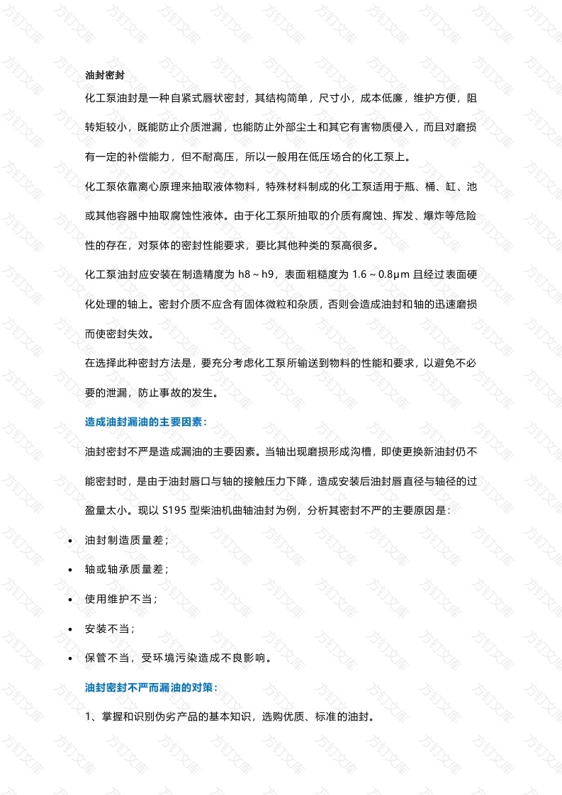 油封密封化工泵油封是一种自紧式唇状密封,其结构简单,)尺寸小,成本低廉,维护方便,阻转矩较小,既能防止介质泄漏,也能防止外部尘土和其它有害物质侵入,而且对磨损有一定的补偿能力,但不耐高压,所以一般用在低压场合的化工泵上。化工泵依靠离心原理来抽取液体物料,特殊材料制成的化工泵适用于瓶、桶、缸、池或其他容器中抽取腐蚀性液体。由于化工泵所抽取的介质有腐蚀、挥发、爆炸等危险性的存在,对泵体的密封性能要求,要比其他种类的泵高很多。化工泵油封应安装在制造精度为h8~h9,表面粗糙度为1.6~0.8μm且经过表面硬化处理的轴上。密封介质不应含有固体微粒和杂质,否则会造成油封和轴的迅速磨损而使密封失效。在选择此种密封方法是,要充分考虑化工泵所输送到物料的性能和要求,以避免不必要的泄漏,防止事故的发生。造成油封漏油的主要因素:油封密封不严是造成漏油的主要因素。当轴出现磨损形成沟槽,即使更换新油封仍不能密封时,是由于油封唇口与轴的接触压力下降,造成安装后油封唇直径与轴径的过盈量太小。现以S195型柴油机曲轴油封为例,分析其密封不严的主要原因是油封制造质量差轴或轴承质量差使用维护不当:方保管不当,受环境污染造成不良影响。油封密封不严而漏油的对策:掌握和识别伪劣产品的基本知识,选购优质、标准的油封。万安装时,若轴径外表面粗糙度低或有锈斑、锈蚀、起毛刺等缺陷要用细砂布或油石打磨光滑;在油封唇口或轴径对应位置涂上清洁机油或润滑油脂。油封外圈涂上密封胶,用硬纸把轴上的键槽部位包起来,避免划伤油封唇口,用专用工具将油封向里旋转压进,干万不能硬砸硬冲,以防油封变形或挤断弹簧而失效;若出现唇口翻边、弹簧脱落和油封歪斜时必须拆下重新装入。应该注意的是:当轴径没有磨损和油封弹簧弹力足够时,不要擅自收紧内弹簧。3、应用在机械上的油封一般工作条件恶劣、环境温差大、尘埃多、机具振动频繁使机件受力状况不断变化时,要勤检查、保养和维护。4、如轴径和轴承磨损严重;油封橡胶老化或弹簧失效等,应及时进行修理和更换相应部件。对不正常发热的部件或总成应及时排除故障;避免机械超速、超负荷运转,以防止油封唇口温度升高、橡胶老化、唇口早期磨损等。6、要经常检查机油油位,若机油杂质过多,存有合金粉末、金属铁屑时要彻底更换新机油。所换机油牌子和质量要符合季节的要求。建议在机油中添加迈特雷超级密封剂&润滑剂,它是一种极好的齿轮箱添加剂,可以在部件上形成一种惰性材料薄膜,它可以减缓油封的渗漏,延长油封齿轮的使用寿命,也可以降低齿轮箱的噪音,这种迈特雷超级密封润滑剂的使用不会对油品造成污染或使油品变质。垫片密封化工泵常用的密封方法,有垫片密封法。垫片是离心泵静密封的基本元件,使用范围非常广泛。垫片的选型主要根据化工泵输送介质、温度、压力和腐蚀性等因素决定。垫片密封机理:万文万泄漏即介质从有限空间内部流到外部,或从外部进入有限空间内部的人们不希望发生的现象,介质流动通过内外空间的交界面即密封面发生泄漏。造成泄漏的根本原因是由于接触面上存在间隙,而接触面两侧的压力差、浓度差则是泄漏的推动力。由于密封面形式及加工精度等因素的影响,密封面上存在间隙在所难免,这就会造成密封面不完全吻合,从而发生泄漏。要减少泄漏,就必须使接触面最大程度地嵌合,即减小泄漏通道的截面积,增加泄漏阻力,并使之大于泄漏推动力。对密封面施加压紧载荷,以产生压紧应力,可提高密封面的接触程度,当应力增大到足以引起表面产生明显的塑性变形时,就可以填补密封面的间隙,堵塞泄漏通道。使用垫片的目的就是利用垫片材料在压紧载荷的作用下较容易产生塑性变形的特性使之填平法兰密封面的微小凹凸不平,从而实现密封垫片的选择:化工泵密封垫片选择化工泵所抽取的介质有腐蚀、挥发、爆炸等危险性的存在,对泵体的密封性能要求,要比其他种类的泵高很多。化工泵常用的密封方法,有垫片密封法。垫片是离心泵静密封的基本元件,使用范围非常广泛。垫片的选型主要根据化工泵输送介质、温度、压力和腐蚀性等因素决定。当化工泵输送介质,对温度和压力不高时,一般选用非金属密封垫片;当化工泵输送介质为中压高温时,选用非金属与金属组合垫片。非金属垫片在泵上应用最为普遍,其材料一般为纸、橡胶和聚四氟乙烯。当温度不超过120℃,压力在1.0Mpa以下时,一般选用青壳纸或模造纸垫片。万万万万万方万万万