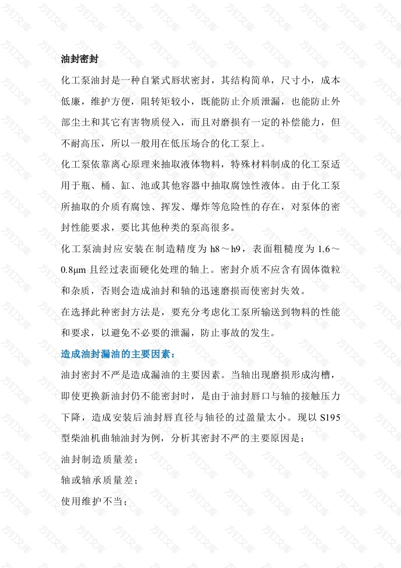 油封密封化工泵油封是一种自紧式唇状密封,其结构简单,尺寸小,成本低廉,维护方便,阻转矩较小,既能防止介质泄漏,也能防止外部尘土和其它有害物质侵入,而且对磨损有一定的补偿能力,不耐高压,所以一般用在低压场合的化工泵上。化工泵依靠离心原理来抽取液体物料,特殊材料制成的化工泵适用于瓶、桶、缸、池或其他容器中抽取腐蚀性液体。由于化工泵所抽取的介质有腐蚀、挥发、爆炸等危险性的存在,对泵体的密封性能要求,要比其他种类的泵高很多。化工泵油封应安装在制造精度为h8~h9,表面粗糙度为1.60.8μm且经过表面硬化处理的轴上。密封介质不应含有固体微粒和杂质,否则会造成油封和轴的迅速磨损而使密封失效。在选择此种密封方法是,要充分考虑化工泵所输送到物料的性能和要求,以避免不必要的泄漏,防止事故的发生。造成油封漏油的主要因素:油封密封不严是造成漏油的主要因素。当轴出现磨损形成沟槽,即使更换新油封仍不能密封时,是由于油封唇口与轴的接触压力下降,造成安装后油封唇直径与轴径的过盈量太小。现以S195型柴油机曲轴油封为例,分析其密封不严的主要原因是:油封制造质量差:轴或轴承质量差:使用维护不当:万万万万万万万保管不当,受环境污染造成不良影响。油封密封不严而漏油的对策:1、掌握和识别伪劣产品的基本知识,选购优质、标准的油封。2、安装时,若轴径外表面粗糙度低或有锈斑、锈蚀、起毛刺等缺陷,要用细砂布或油石打磨光滑:在油封唇口或轴径对应位置涂上清洁机油或润滑油脂。油封外圈涂上密封胶,用硬纸把轴上的键槽部位包起来,避免划伤油封唇口,用专用工具将油封向里旋转压进,千万不能硬砸硬冲,以防油封变形或挤断弹簧而失效:若出现唇口翻边、弹簧脱落和油封歪斜时必须拆下重新装入。应该注意的是:当轴径没有磨损和油封弹簧弹力足够时,不要擅自收紧内弹簧。3、应用在机械上的油封一般工作条件恶劣、环境温差大、尘埃多机具振动频繁使机件受力状况不断变化时,要勤检查、保养和维护4、如轴径和轴承磨损严重:油封橡胶老化或弹簧失效等,应及时进行修理和更换相应部件。5、对不正常发热的部件或总成应及时排除故障;避免机械超速超负荷运转,以防止油封唇口温度升高、橡胶老化、唇口早期磨损等。万万要经常检查机油油位,若机油杂质过多,存有合金粉末、金属铁屑时要彻底更换新机油。所换机油牌子和质量要符合季节的要求建议在机油中添加迈特雷超级密封剂&润滑剂,它是一种极好的齿轮箱添加剂,可以在部件上形成一种惰性材料薄膜,它可以减缓油封的渗漏,延长油封齿轮的使用寿命,也可以降低齿轮箱的噪音,这种迈特雷超级密封润滑剂的使用不会对油品造成污染或使油品变质。垫片密封化工泵常用的密封方法,有垫片密封法。垫片是离心泵静密封的基本元件,使用范围非常广泛。垫片的选型主要根据化工泵输送介质、温度、压力和腐蚀性等因素决定。垫片密封机理:泄漏即介质从有限空间内部流到外部,或从外部进入有限空间内部的人们不希望发生的现象,介质流动通过内外空间的交界面即密封面发生泄漏。造成泄漏的根本原因是由于接触面上存在间隙,而接触面两侧的压力差、浓度差则是泄漏的推动力。由于密封面形式及加工精度等因素的影响,密封面上存在间隙在所难免,这就会造成密封面不完全吻合,从而发生泄漏。要减少泄漏,就必须使接触面最大程度地嵌合,即减小泄漏通道的截面积,增加泄漏阻力,并使之大于泄漏推动力。