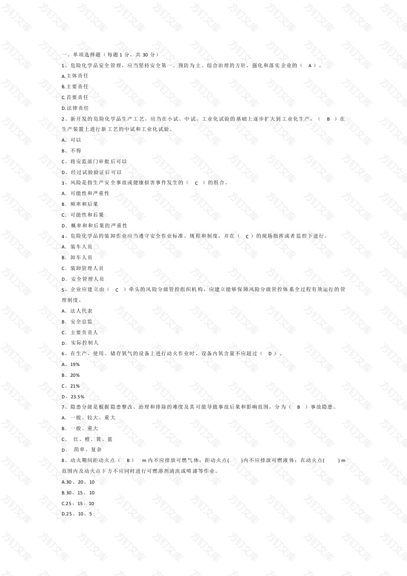 单项选择愿共30分1危险化学品安全管理,应当坚持安全第预防为主综合治理的方针,强化和落实企业的A主体贵任D.法律责任2、新开发的危险化学品生产工艺,应当在小试、中试工业化试验的基础上逐步扩大到工业化生产在生产装置上进行新工艺的中试和工业化试验A.可以B、不得C、将安监部门审批后可以经过试验验证后可以方3、风险是指生产:安全事故或健康损害事件发生的(的组合A.可能性和严重性B.可能性和后果方订D.概幸和和后果的严重性4、危险化学品的装卸作业应当遵守安全作业标准、规程和制度,并在的现场指挥或者监控下进行装车人员装卸管理人员D.安全管理人员5、企业应建立由牵头的风险分级管控组织机构,应建立能够保障风险分级管控体系全过程有效运行的管理制度A.法人代表B。安全总监c.主要负贵人D.实际控制人6、在生产、使用储存氧气的设备上进行动火作业时,设备内氧含量不应超过A、19%B、20%C、21%D、23.5%治理和排除的难度及其可能导致事故后果和影响范围,分为A.一般、较大、重大B一般、重大红、橙、黄、蓝D简单、复杂8、动火期间距动火点(B)m内不应排放可气体:距动火点()内不应排放可燃液体:在动火点范围内及动火点下方不应同时进行可燃溶剂清洗或喷浚等作业A.30、20、10B.30、15、10C.25、15、10D.25.10、5万万文万万文9、危险化学品重大危险源(以下简称重大危险源),是指按照《危险化学品重大危险源辨识》标准辨识确定储存、使用或者搬运危险化学品的数量等于或者超过)的单元〔包括场所和设施B.临界量D.允许值0、不应靠近电线路进行吊装作业。确需在输电线路附近作业时,起重机械的安全距离应大于起重机械的并符合DL409的要求:不能满足时,应停电后再进行作业.A作业半径D.旋转半径、一级动火作业是在易易爆场所进行的除特殊动火作业以外的动火作业。「区管廊上的动火作业按动火作业管理A.一级B.二级方C.特级12、涉及重点监管的危险化学品的生产、储存装置,原则上须由具有(C)的化工行业设计单位进行设计A.乙级方B.甲级或乙级C.甲级D.一级13、使用气焊气割动火作业时,乙块瓶应直立放置,氧气瓶与之间距不应小于(m者与作业地点间距不应小于(并应设置防陌设施A.5、10B.15、10文C.10、20D.15、3014、盛装爆炸品包装的附加要求,以下说法不正确的有(D)A盛装液体爆炸品容器的封闭形式,应具有防止渗漏的单层保护B.除内包装能充分防止爆炸品与金属物接触外,铁钉和其他没有防护涂料的金属部件不应穿透外包装C双重卷边接合的钢桶,金属桶或以金属做衬里的运输包装,应能防止爆炸物进入隙缝。钢桶或铝桶的封闭装置应配有合适的垫圈D包装内的爆炸物质和物品,包括内容器,应衬垫妥实,在运箱中可允许发生危险性移动。15、动火分析合格标准为:当被测气体或蒸气的爆炸下限大于等于4%时,其被测浓度应不大于(%(体积百分数):当被测气体或蕊气的爆炸下限小于4%时,其被测浓度应不大于)%(体积百分数)。A.0.5、0.2B.0.5、0.5C.4、2D.0.4、0.216、临时用电架空线应采用绝缘铜芯线,并应架设在专用电杆或支架其最大孤与地面距离,在作业现场不低穿越机动车道不低于〔A3、5B.2文万C2.5、D.2、417、对受限空间内的气体浓度进行严格监测,监测点应有代表性,容积较大的受限空间,应对(各部位进行监测分析。B.上、中、下D.入口、出口万文18、言板抽堵作业,以下说法错误的是(A。生产车间应预先绘制板位置图,对板进行统并设专人统指挥作业。B。应根据管道内介质的性质、温度、压力和管道法兰密封面的口径等选择相应材料、强度、口径和符合设计造要求的盲板及垫片C.在易燃易爆场所进行官板抽堵作业时,作业人员应穿防静电工作服、工作鞋,并应使用防爆灯具和防爆工具:距板抽堵作业地点30m内不应有动火作业,D。在同一管道上最多同时进行两处首板抽堵作业,不得超过两处19、高处作业时在距)2m及2m以上有可能坠落的高处进行的作业C.平台万D.作业面20、关于吊装作业,以下说法正确的是(A.吊装场所如有含危险物料的设备、管道等时,应制定详细吊装方案,并对设备、管道采取有效防护措施,时停车,放空物料,置换后进行吊装作业B。大雪、暴雨、大雾及五级以上风时,不应露天作业经过评估和专业核算后,可以利用管道、管架等作吊装锚点。D.下放吊物时,不应自由下落(溜),应利用极限位置限制器停车:21、动土作业时,深度大于(C)m时应设置人员上下的梯子等,保证人员快速进出设施:两个以上作业人员A.2.52.5B.33C.22D.2422、涉及毒性气体、液化气体、剧毒液体的一级或者二级重大危险源,配备独立的(系统A.SISB.ESDC.DCSD.PLC23、在同一房间或同区域内不同的物料之间分开定的距离,非禁忌物料间用通道保持空间的贮存方式,AA隔离贮存B.隔开贮存C分离贮存D.分开贮存各类危险品不得与混合贮存万万万万万文