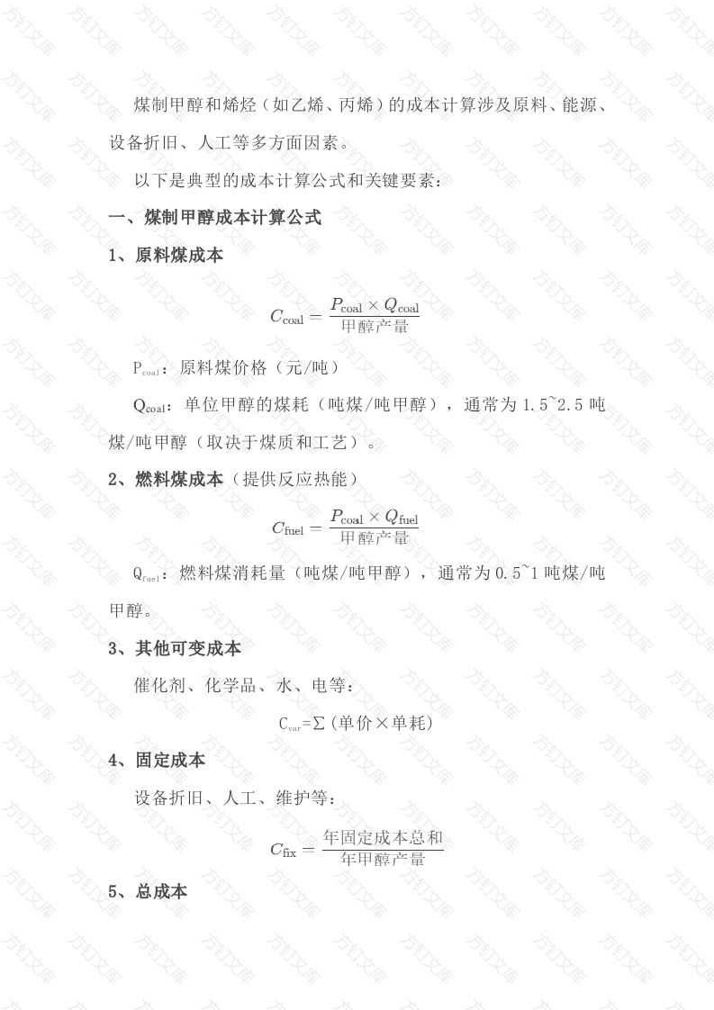 煤制甲醇和烯烃(如乙烯、丙烯)的成本计算涉及原料、能源、设备折旧、人工等多方面因素。以下是典型的成本计算公式和关键要素:煤制甲醇成本计算公式1、原料煤成本CcoalPcoal×coal甲醇产量原料煤价格(元/吨)方Qcoal:单位甲醇的煤耗(吨煤/吨甲醇),通常为1.52.5吨煤/吨甲醇(取决于煤质和工艺)2、燃料煤成本(提供反应热能)CfuelPcoal X Qfuel甲醇产量燃料煤消耗量(吨煤/吨甲醇)通常为0.51吨煤/吨甲醇。3、其他可变成本文催化剂、化学品、水、电等:4、固定成本设备折旧、人工、维护等:年固定成本总和年甲醇产量5、总成本方万万万万万甲醇成本C1煤制烯烃(MT0)成本计算公式万煤制烯烃需先制甲醇,再通过甲醇制烯烃(MTO/MTP工艺)成本分为两部分:1.甲醇成本同上文煤制甲醇成本计算方文2.甲醇制烯烃成本甲醇单耗:约2.83.2吨甲醇/吨烯烃(因工艺而异)。(2)其他成本(催化剂、能耗等):CMTOvar甲醇单耗(吨/吨烯烃)Cvar:MTO环节的可变成本(电、蒸汽等)MTO环节的固定成本3.总烯烃成本烯烃成本=CMTO+甲醇成本三、关键参数参考值项目典型值煤制甲醇煤耗1.52.5吨煤/吨甲醇甲醇制烯烃甲醇单耗2.83.2吨甲醇/吨烯烃万万项目典型值电耗800ˇ1200kWh/吨甲醇水耗510吨/吨甲醇四、注意事项1、煤价波动:原料煤占比高达60%70%,需实时更新价格2、工艺差异:如Shel1气化炉与Texaco气化炉的能效不同。3、副产品收益:部分工艺副产LPG、汽油等,可抵扣成本。4、碳税/环保成本:需考虑碳排放成本(如中国碳市场约50~100元/吨C02)五、简化案例文假设:●煤价:800元/吨•甲醇煤耗:2吨煤/吨甲醇方MT0甲醇单耗:3吨甲醇/吨烯烃•其他成本:2000元/吨烯烃则烯烃成本=800×2×3+2000=6800元/吨如需精确计算,需结合具体项目参数和工艺流程图。万