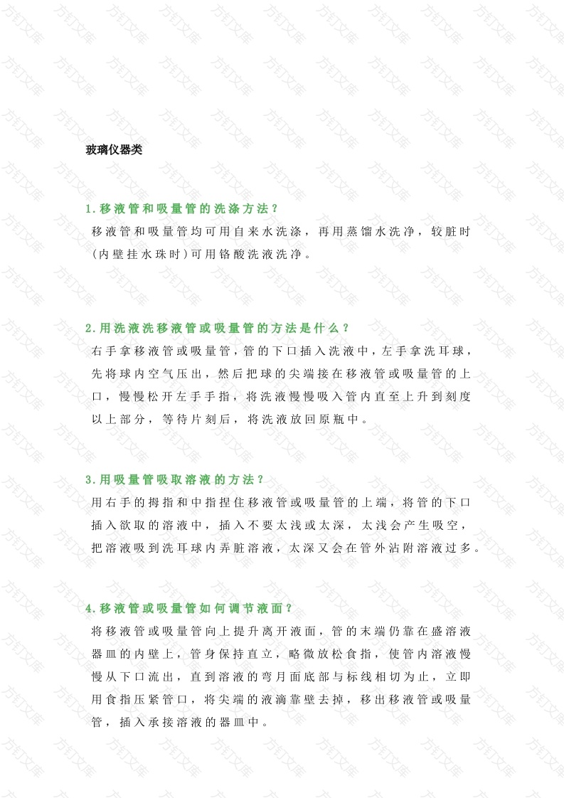 方玻璃仪器类1.移液管和吸量管的洗涤方法?移液管和吸量管均可用自来水洗涤,再用蒸馏水洗净,较脏时(内壁挂水珠时)可用铬酸洗液洗净。2.用洗液洗移液管或吸量管的方法是什么?右手拿移液管或吸量管,管的下口插入洗液中,左手拿洗耳球,先将球内空气压出,然后把球的尖端接在移液管或吸量管的上口,慢慢松开左手手指,将洗液慢慢吸入管内直至上升到刻度文以上部分,等待片刻后,将洗液放回原瓶中。3.用吸量管吸取溶液的方法?用右手的拇指和中指捏住移液管或吸量管的上端,将管的下口插入欲取的溶液中,插入不要太浅或太深,太浅会产生吸空,把溶液吸到洗耳球内弄脏溶液,太深又会在管外沾附溶液过多。4.移液管或吸量管如何调节液面?文将移液管或吸量管向上提升离开液面,管的末端仍靠在盛溶液器皿的内壁上,管身保持直立,略微放松食指,使管内溶液慢慢从下口流出,直到溶液的弯月面底部与标线相切为止,立即用食指压紧管口,将尖端的液滴靠壁去掉,移出移液管或吸量管,插入承接溶液的器皿中。万文文5.如何放出移液管或吸量管中溶液?承接溶液的器皿若是锥形瓶,应使锥形瓶倾斜,移液管或吸量管直立,管下端紧靠锥形瓶内壁,放开食指,让溶液沿瓶壁流下。流完后管尖端接触瓶内壁约15s后,再将移液管或吸量管移去。残留在管末端的少量溶液,不可用外力强使其流出,因校准移液管或吸量管时已考虑了末端保留溶液的体积。6.使用吸量管和滴定管的注意事项:(1)在精密分析中使用的移液管和吸量管都不允许在烘箱中烘(2)移液管与容量瓶常配合使用,因此,使用前常作两者的相对体积的校准;(3)为了减少测量误差,吸量管每次都应从最上面刻度为起始点,往下放出所需体积,而不是放出多少体积就吸取多少体积。文7.容量瓶试漏的方法?使用前,应先检查容量瓶瓶塞是否密合,为此,可在瓶内装入自来水到标线附近,盖上塞子,用手按住塞子,倒立容量瓶,观察瓶口是否有水渗出,如果不漏,把瓶直立后,转动瓶塞约180°后再倒立试一次,为使塞子不丢失不搞乱,常用塑料线绳将其拴在瓶颈上。文8.如何将溶液转移到容量瓶中?方万万在转移过程中,用一根玻璃棒插入容量瓶内,烧杯嘴紧靠玻璃使溶液沿玻璃棒慢慢流入,玻璃棒下端要靠近瓶颈内壁,但不要太接近瓶口,以免有溶液溢出。待溶液流完后,将烧杯沿玻璃棒稍向上提,同时直立,使附着在烧杯嘴上的一滴溶液流回烧杯中,可用少量蒸馏水洗3一4次,洗涤液按上述方法转移合并到容量瓶中。9.如何用容量瓶稀释溶液?溶液转入容量瓶后,加蒸馏水,稀释到约3/4体积时,将容量瓶平摇几次,做初步混匀,这样又可避免混合后体积的改变。然后继续加蒸馏水,近标线时应小心地逐滴加入,直至溶液的弯月面与标线相切为止,盖紧塞子。10.容量瓶如何摇匀?左手食指按住塞子,右手指尖顶住瓶底边缘,将容量瓶倒转并振荡,再倒转过来,仍使气泡上升到顶,如此反复15一20次,即可混匀。方11.容量瓶的校正方法称量一定容积的水,然后根据该温度时水的密度,将水的质量换算为容积。文12.使用容量瓶注意事项有哪些?(1)在精密要求高的分析工作中,容量瓶不允许放在烘箱中烘万文