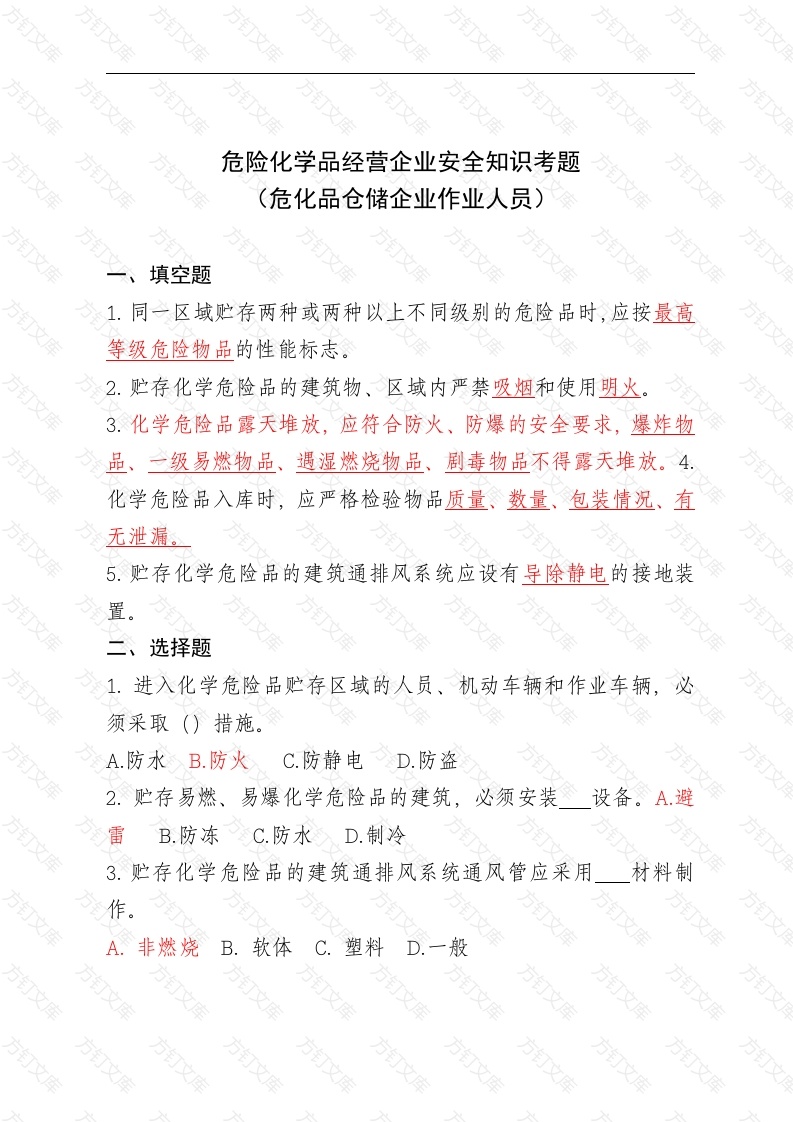 危险化学品经营企业安全知识考题(危化品仓储企业作业人员)填空题1.同一区域贮存两种或两种以上不同级别的危险品时,应按最高等级危险物品的性能标志。2.贮存化学危险品的建筑物、区域内严禁吸烟和使用明火。3.化学危险品露天堆放,应符合防火、防爆的安全要求,爆炸物品、一级易燃物品、遇湿燃烧物品、剧毒物品不得露天堆放。4化学危险品入库时,应严格检验物品质量、数量、包装情况、有无泄漏。5,贮存化学危险品的建筑通排风系统应设有导除静电的接地装置。二、选择题1.进入化学危险品贮存区域的人员、机动车辆和作业车辆,必须采取()措施。A.防水B.防火D.防盗2.贮存易燃、易爆化学危险品的建筑,必须安装设备。A避雷B.防冻C.防水3.贮存化学危险品的建筑通排风系统通风管应采用材料制作A.非燃烧B.软体C.塑料D.一般万万万万万贮存化学危险品建筑采暖的热媒温度不应过高,热水采暖不应超过℃,不得使用蒸汽采暖和机械采暖A.20B.37C.80D.605能引起燃烧、爆炸或发生化学反应,生有毒气体的化学危险品不得在露天或在潮湿、积水的建筑物中贮存。A.遇火、遇热、遇潮B.遇火、遇水、与可燃气体与可燃气体、遇火、遇水遇冷、遇潮6.装运易燃、易爆物,易燃液体,可燃性气体等危险品,应采用()运输工具。A.专用B.道路C.水路D.航空7物品,包装必须严密,不允许泄漏,严禁与液化气体和其他物品共存。B.碱性C.腐蚀性D.液体8.仓库的消防人员除了具有一般消防知识之外,还应进行在危险品库工作的专门培训,使其熟悉各区域贮存的化学危险品种类、特性、贮存地点、方法。A.使用B.运输C.销毁D.事故的处理程序9.贮存化学危险品的仓库必须配备有专业知识的技术人员,其库房及场所应设专人管理,管理人员必须配备可靠的A.防护眼镜B.防毒面罩C.防护服装D.个人安全防护用品万万万万化学危险品贮存的基本要求有哪些A.贮存化学危险品必须遵照国家法律、法规和其他有关的规定。B.化学危险品必须贮存在经公安部门批准设置的专门的化学危险品仓库中,经销部门自管仓库贮存化学危险品及贮存数量必须经公安部门批准。未经批准不得随意设置化学危险品贮存仓库。C.化学危险品露天堆放,应符合防火、防爆的安全要求,爆炸物品、一级易燃物品、遇湿燃烧物品、剧毒物品不得露天堆放。D.贮存化学危险品的仓库必须配备有专业知识的技术人员,其库房及场所应设专人管理,管理人员必须配备可靠的个人安全防护用品三、判断题1.化学性质相抵触或灭火方法不同的两类危险化学品,不得混合贮存。(V)2.气瓶使用到最后应该留有余气。(√3.危险化学品仓库应该设有避雷设施,并且每5年至少检测一次(×,)4.工人有权了解化学品的特性、危害性、预防措施、培训程序:当有充分理由判断安全与健康受到威胁时,可以脱离危险区,并不受不公正待遇。(√)5.工作场所使用化学品的单位,应按国家有关规定清除化学废料万万文