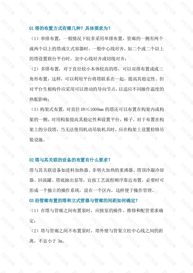 01塔的布置方式有哪几种?具体要求为?(1)单排布置,一般情况下较多采用单排布置,管廊的一侧有两个或两个以上的塔或立式容器时,一般中心线对齐,如二个或二个以上的塔设置联台平台时,宜中心线对齐或切线对齐;(2)多排布置,对于直径较小本体较高的塔,可以双排布置或成三角形布置,这样,可以利用平台将塔联系在一起,提高其稳定性。但对平台生根构件应采用可以滑动的导向节点,以适应不同操作温度的热胀影响;(3)构架式布置,对直径DN≤1000mm的塔还可以布置在构架内或构架的一侧。对用构架提高其稳定性和设置平台、梯子。对于布置在构架上的分段塔,当无法使用机动吊装机具时,应在构架上设置检修吊装设施。02塔与其关联的设备的布置有什么要求?塔与其关联设备如进料加热器、非明火加热的重沸器、塔顶冷凝冷却器、回流罐、塔底抽出泵等,宜按工艺流程顺序靠近布置,必要时可形成一个独立的操作系统,设在一个区内,这样便于操作管理。03沿管廊布置的塔和立式管器与管廊的间距如何确定?(1)在塔与管廊之间布置泵时,应按泵的操作、维修和配管要求确塔与管廊之间不布置泵时,塔外壁与管架立柱中心线之间的距不宜小于3m万文04塔与塔之间或塔与其他相邻设备之间的距离如何确定?塔与塔之间或塔与其他相邻设备之间的距离,除应满足管道、平台、仪表和小型设备等布置和安装的要求外,尚应满足操作、维修通道和基础布置的需耍。两塔之间的净距不宜小于2.5m。05塔和立式容器的安装高度应符合哪些要求?(1)当利用内压或流体重力将物料送往其他设备或管道时,应由其内压和被送往设备或管道的压力和高度确定;(2)当用泵抽吸时,应由泵的汽蚀余量和吸入管道的压力降确定设备的安装高度;(3)带有非明火加热重佛器的塔,其安装高度,应按工艺要求的塔和重沸器之间的相互关系和操作要求确定:(4)应满足塔底管道安装和操作所需要的最小净空,且塔的基础面高出地面不应小于200mm。06换热设备的布置一般要求是什么?(1)与分馏塔关联的管壳式换热设备,如塔底重沸器,塔顶冷凝冷却器等。宜接工艺流程顺序布置在分馏塔的附近:(2)两种物料进行热交换的换热器,宜布置在两种物料进出口相连的管道最近的位置:万万3种物料与几种不同物料进行换热的管壳式换热器,应成组布(4)用水或冷剂冷却几组不同物料的冷却器,宜成组布置:(5)成组布置的换热设备,宜取支座基础中心线对齐,当支座间距不相同时,宜取一端支座基础中心线对齐。为了管道连接方便,地面上布置的换热器也可采用管程进出口管嘴中心线对齐;(6)换热设备应尽可能布置在地面上,但是换热设备数量较多可布置在构架上:1)浮头式换热器在地面上布置时,应满足下列要求:浮头和管箱的两侧应有宽度不小于0.6m的空地,浮头端前方宜有宽度不小于1.2m的空地;管箱前方从管箱端算起应留有比管束长度至少长1.5m的空地。2)浮头式换热器在构架上布置时,应满足下列要求:浮头端前方平台净空不宜小于0.8m;管箱端前方平台净空不宜小于1mm,平台采用可拆卸式栏杆,并应考虑管束抽出区所需的空间:构架高度应能满足换热器的管箱和浮头的头盖吊装需要(7)为了节约占地或工艺操作方便可以将两台换热设备重叠在一起布置。但对于两相流介质或壳体直径大于或等于1.2m的换热器不宜(8)换热器之间、换热器与其他设备之间的净距不宜小于0.7m:9重质油品或污染环境的物料的换热设备不宜布置在构架上: