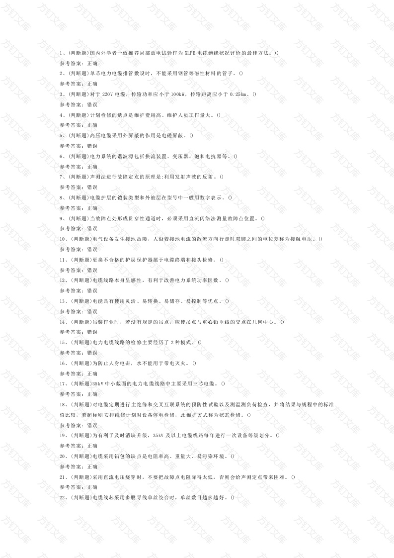 (判断)国内外学者致推荐局部放电试验作为ⅪPE电缆绝缘状况评价的最佳方法。0参考答案:正确方2、(判断)单芯电力电缆排管敷设时,不能采用钢管等德性材料的管子。0参考答案:正确传输距离应小于0.25km0参考答案:错误4、(判断圈)计划检修的缺点是锥护费用高、雏护人员工作量大。0参考答案:正确5、(判断圈)高压电缆采用外屏敲的作用是电德屏蔽。0方方6、(判断圈)电力系统的谐波源包括换流装置、变压器、孢和电抗器等。参考答案:正确7、(判断愿)声测法进行故障定点的原理是:利用发射声波的反射。O参考答案:错误8、(判断愿)电缆护层的铠装类型和外被层在型号中一般用数字表示。0参考答案:正确方9、(判断愿)当故障点处形成贯穿性通道时,必须采用直流闪络法测量故障点位置。参考答案:错误10、(判断)电气设备发生接地故障,人沿着接地电流的散流方向行走时双脚之间的电位差称为接触电压。0方参考答案:错误11、(判断圈)更换不合格的护层保护器属于电缆终踏和接头检修。0参考答案:错误12、(判断圈)电缆线路本身呈感性,有利于政普电力系统功幸因数。0方订参考答案:错误13、(判断圈)电能具有使用灵活、易转换、易储存、易控制等优点。0参考答案:错误14、(判断愿)吊装作业时,若没有规定的吊点,应使吊点与重心铅垂线的交点在几何中心参考答案:错误15、(判断圈)电力电缆线路的检修主要经历了2种模式。0参考答案:错误16、(判断圈)为防止人身电击,水不能用于带电灭火。0参考答案:正确17、(判断愿)35kV中小截面的电力电缆线路中主要采用三芯电缆。参考答案:正确18、(判断圈)对电缆定期进行主绝缘和交叉互联系统的预防性试验以及测温测负荷检查,并将结果与规程中的标准值比较,若超标则安排维修计划对设备停电检修,此雏护方式称为状态检修。0参考答案:错误19、(判断愿)为有利于及时消缺升级,35kW及以上电缆线路每年进行一次设备等级划分。0参考答案:正确0、(判断题)电缆采用铅包的缺点是电阻率高、重量大、易污染环境。0参考答案:正确21、(判断题)采用直流电压烧穿时,不要把故障点电阻降得太低,否则会给声测定点带来因难。参考答案:正确(判断愿)电缆线芯采用多股导线单鉸合时,单数目越多越好。0万文参考答案:错误23、(判断愿)供直流输电的高压充油电缆最大工作场强可允许在30~50kW/mm范围内方参考答案:正确24、(判断愿)电力系统中性点接地方式与供电可靠性、短路电流大小、绝缘水平等有关。参考答案:正确25、(判断愿)中间接头按照用途不同分7类。0参考答案:正确6、(判断圈)交联聚乙稀绝缘电缆最常见也最多的一种树枝现象为水树枝。0参考答案:正确方27、(判断)一般地,取电缆终端最大轴向场强为0.750.85kV/m。参考答案:错误28、(判断圈)工作票是准许在电气设备上工作的书面命令,是执行保证安全技术措施的书面依据,般有三种格式。参考答案:错误9、(判断圈)电气设备制造厂根据所规定的电气设备工作条件而确定的电压,称为电气设备的额定电压0参考答案:正确30、(判断圈)一般缺陷应列入检修计划,并于3个月内组织检修处理。0方参考答案:正确31、(判断愿)110kW交联聚乙烯电缆外护套应能通过直流耐压和交流耐压试验。0参考答案:正确32、(判断题)交流单相电力电缆金属护层的接地必须保证其任一点感应电压在未采取安全措施的情况下不得大参考答案:错误33、(判断圈)电缆线路的试运行阶段是指电缆线路投入运行后6个月以内0参考答案:错误34、(判断圈)电力电缆竖井敷设时,应优先选用交联聚乙烯电缆。0参考答案:正确35、(判断愿)电力电缆隧道敷设适合于电缆线路相对分散的分支线。0参考答案:错误36、(判断题)对人身和设备有严重威胁,暂时尚能坚持运行但需要尽快处理的缺陷,为严重缺陷0参考答案:正确37、(判断圈)用于运输和敷设电缆的多功能工具车,称为元宝车。0参考答案:错误38、(判断题)交联聚乙烯电缆绝缘层内部含有杂质、水分、微孔时,易发生树枝老化现象。0参考答案:正确方39、(判断题)一般纸带沿表面击穿强度为垂直纸带方向的1/2,局部放电最终导致树枝放电。0参考答案:错误40、(判断愿)电力系统中性点经消孤线圈接地的优点是减小接地电流。0参考答案:正确41、(判断圈)普通电桥不适合测量电缆的高阻接地故障点。0参考答案:正确42、(判断题)一般地,含水幸增大时,交联聚乙烯绝缘电缆的介质损耗角正切不变参考答案:错误3、(判断愿)电缆线芯截面在35以下时,线芯可采用单股实心导体。0参考答案:正确万文万(判断)从理论上讲,电缆应力锥接地屏敲段纵切面的轮廓线应是直线0参考答案:错误万45、(判断圈)电缆终蹭接头和中间接头应混合存放。参考答案:错误46、(判断圈)10kV及以下电压等级油浸纸绝缘电缆线芯采用扇形,是因为这有利于绝缘内部电场分布均匀。0参考答案:错误47、(判断圈)铝芯、不滴流纸绝缘、铝包、钢带铠装、聚乙烯外护套电力电缆型号为孔123。0参考答案:错误48、(判断圈)分项工程“绝缘接头”包含于分部工程“电缆中间接头”中。0方49、(判断愿)低于规定温度敷设电缆时应采取加热措施,充油电缆的规定敷设温度是-10℃,参考答案:正确50、(判断题)电缆绝缘老化的主要表现有机械性能下降、击穿场强降低等。0参考答案:正确51、(判断题)油浸纸绝缘统包型电力电缆运行温度低时