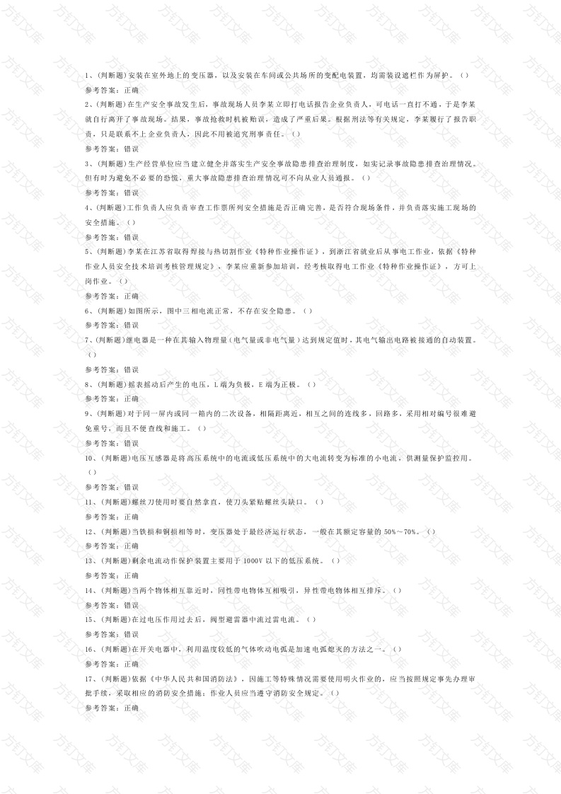 (判断)安装在室外地上的变压器,以及安装在车间或公共场所的变配电装置,均需装设遮栏作为屏护参考答案:正确2、(判断愿)在生产:安全事故发生后,事故现场人员李某立即打电话报告企业负贵人,可电话一直打不通,于是李某就自行离开了事故现场。结果,事故抢数时机被贻误,造成了严重后果。根据刑法等有关规定,李某限行了报告职贵,只是联系不上企业负贵人,因此不用被追究刑事贵任。3、(判断圈)生产经营单位应当建立健全并落实生产安全事故隐患排查治理制度,如实记录事故隐世排查治理情况。但有时为避免不必要的恐慌,重大事故隐悲排查治理情况可不向从业人员通报。参考答案:错误4、(判断愿)工作负责人应负责审查工作票所列安全措施是否正确完善,是否符合现场条件,并负责落实施工现场的安全措施。()参考答案:错误5、(判断题)李某在江苏省取得焊接与热切割作业《特种作业操作证》,到浙江省就业后从事电工作业,依据《特种作业人员安全技术培训考核管理规定》,李某应重新参加培训,经考核取得电工作业《特种作业操作证》,方可上岗作业。()参考答案:正确6、(判断愿)如图所示,图中三相电流正常,不存在安全隐患。()参考答案:错误7、(判断题)继电器是一种在其输入物理量(电气量或电气量)达到规定值时,其电气输出电路被接通的自动装置参考答案:错误8、(判断愿)摇表摇动后产生的电压,L瑞为负极,E端为正极。参考答案:正确9、(判断圈)对于同一屏内或同一箱内的二次设备,相隔距离近,相互之间的连线多,回路多,采用相对编号很难避免重号,而且不便查线和施工。()参考答案:错误10、(判断愿)电压互感器是将高压系统中的电流或低压系统中的大电流转变为标准的小电流,供测量保护监控用参考答案:错误11、(判断题)螺黛刀使用时要自然拿直,使刀头紧贴螺丝头缺口。方参考答案:正确12、(判断愿)当铁损和铜损相等时,般在其额定容量的参考答案:正确13、(判断圈)剩余电流动作保护装置主要用于100V以下的低压系统,参考答案:正确14、(判断愿)当两个物体相互靠近时,同性带电物体互相吸引,异性带电物体相互排斥。参考答案:错误方15、(判断愿)在过电压作用过去后,阀型避雷器中流过雷电流。()参考答案:错误16、(判断题)在开关电器中,利用温度较低的气体吹动电孤是加速电弧熄灭的方法之参考答案:正确17、(判断题)依据《中华人民共和国消防法》,因施工等特殊情况需要使用明火作业的,应当按照规定事先办理审批手续,采取相应的消防安全措施:作业人员应当遵守消防安全规定。考答案:正确万文(判断愿)倒闻操作票操作完毕后,操作人应向发令人报告操作任务的执行时间和执行情况参考答案:错误19、(判断)当变压器的油温变化时,其体积会影胀或收缩参考答案:正确20、(判断圈)触电分为直接触电和间接触电。21、(判断圈)依据《中华人民共和国消防法》,个人占用、安全出口或者有其他妨碍安全疏散行为的,处警告或者五百元以下罚款。()参考答案:正确22、(判断)电流速断保护具有可靠的选择性和速动性,多用作线路或电气设备的主要保护。参考答案:正确23、(判断愿)只要多加小心并保持一定的间距,生产、储存、经营易燃易爆危险品的场所可以与居住场所设置在同一建筑物内。()参考答案:错误24、(判断题)造成高压电容器发热的原因之一是长期过电压。参考答案:正确25、(判断愿)35kV架空线路紧线孤垂正误差最大值不应超过50m.参考答案:错误26、(判断题)一般情况下,分支终端杆的单横担应装在受电侧。参考答案:错误27、(判断愿)电力电缆保护层的作用是保护电缆免受外界杂质和水分的侵入,以防止外力直接损坏电缆,参考答案:正确28、(判断圈)高压电动机不采用低电压保护。参考答案:错误29、(判断圈)张某在生产、作业过程中违反安全生产管理制度,导致发生机械伤害事故,虽然造成3人重伤,但无人死亡:依据刑法及有关规定,张某不会被追究刑事责任。()参考答案:错误30、(判断愿)在室内高压设备上工作,应在工作地点两旁及对面运行设备间隔的遮栏(围栏)上和禁止通行的过道遮栏〔围栏)上悬挂“止步,高压危险!”的标示牌。()参考答案:正确3引、(判断遥)漏电保护器跳闸,应查明原因并消除漏电缺陷,严禁跨越漏电保护器继续工作。参考答案:正确32、(判断题)直流电压表的“+”蹭接电路的高电位点,“一”端接电路的低电位点。()参考答案:正确33、(判断题)变压器的过电流保护,其动作电流整定按躲过变压器负荷侧母线短路电流,般应大于额定电流3-5倍。()参考答案:错误34、(判断愿)杆塔基础是将杆塔固定于地下,以保证杆塔不发生倾斜或倒塌。〔)参考答案:正确35、(判断愿)安全生产设施或者安全生产条件不符合国家规定,因而发生重大伤亡事故或者造成其他严重后果的,对直接负贵的主管人员和其他直接贵任人员,处三年以下有期徒刑或者拘役:情节特别恶劣的,处三年以上七年以下有期徒刑。参考答案:正确(判断)电流互感器的一次线圈并联接入被测电路,二次线圈与测量表连接,二次线圈极性应正确。文参考答案:错误37、(判断愿)正常情况下,当系统电压偏低时,也可投入高压电容器组参考答案:正确38、(判断愿)安装接线图是以屏面布置图为基础,以原理图为依据而绘制成的接线图,种指导屏柜上配线工作的图纸。()参考答案:正确39、(判