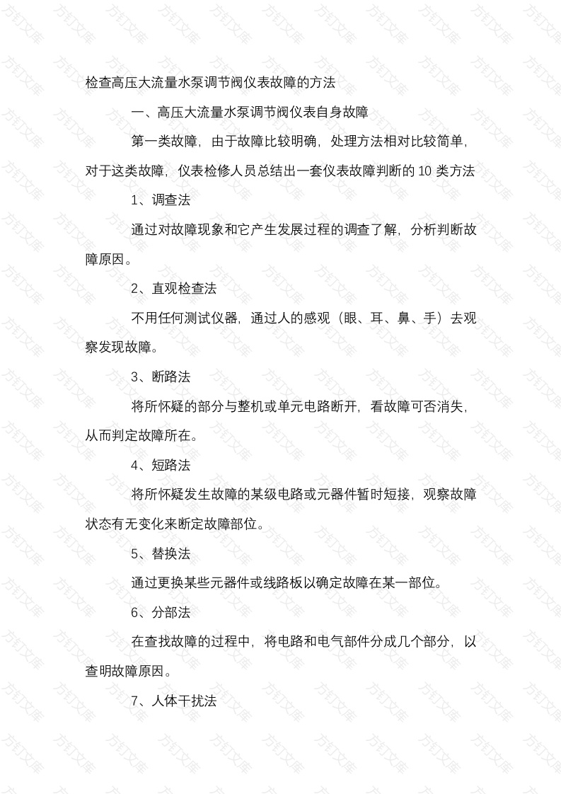 检查高压大流量水泵调节阀仪表故障的方法高压大流量水泵调节阀仪表自身故障第一类故障,由于故障比较明确,处理方法相对比较简单对于这类故障,仪表检修人员总结出一套仪表故障判断的10类方法1、调查法通过对故障现象和它产生发展过程的调查了解,分析判断故障原因。2直观检查法不用任何测试仪器,通过人的感观(眼、耳、鼻、手)去观察发现故障3、断路法将所怀疑的部分与整机或单元电路断开,看故障可否消失从而判定故障所在。4、短路法将所怀疑发生故障的某级电路或元器件暂时短接,观察故障状态有无变化来断定故障部位。5、替换法通过更换某些元器件或线路板以确定故障在某一部位6、分部法在查找故障的过程中,将电路和电气部件分成几个部分,以查明故障原因。人体干扰法文文万人身处在杂乱的电磁场中(包括交流电网产生的电磁场),会感应出微弱的低频电动势(近几十至几百微伏)。当人手接触到仪器仪表某些电路时,电路就会发生反映,利用这一原理可以简单地判断电路某些故障部位。8、电压法电压法就是用万用表(或其他电压表)适当量程测量怀疑部分,分测交流电压和直流电压两种。9、电流法电流法分直接测量和间接测量两种。直接测量是将电路断开后串人电流表,测出电流值与仪表正常状态下数值相比较,从而判断故障。间接测量不断开电路,测出电阻上的压降,根据电阻值计算出近似的电流值,多用于晶体管元件电流的测量。10、电阻法电阻检查法即在不通电的情况下,用万用表电阻挡检查仪器仪表整机电路和部分电路的输入输出电阻是否正常,电容器是否击穿或漏电,电感线圈、变压器有无断线、短路等。二、高压大流量水泵调节阀系统故障对于第二类仪表故障,即生产过程中检测控制系统中出现的仪表故障,比较复杂,从故障处理的重要性、复杂性和故障处理的基础知识三个方面来说明。故障处理的重要性万文万方万石油和化工生产过程中经常出现仪表故障现象,由于检测与控制系统是由若干个仪表(或元件)通过电缆(或管缆)组合而成,是哪一个环节出现故障,一时很难判定。如何正确判断,及时处理仪表故障,直接关系到石油和化工生产的安全与稳定、涉及化工产品的质量和消耗,同时也最能反映出仪表工、仪表技师实际工作能力和业务水平。2、故障处理的复杂性由于石油和化工生产操作管道化、流程化、全封闭等特点,尤其是现代化的化工企业自动化水平很高,工艺操作与检测仪表休戚相关,工艺人员通过检测仪表显示各类工艺参数,诸如反应温度、物料流量、容器的压力和液位、原料的成分等来判断工艺生产是否正常,产品质量是否合格,根据仪表指示进行提量或减产,甚至停车。仪表指示出现异常现象(指示偏高、偏低,不变化、不稳定等),本身包含两种因素1)工艺因素,仪表忠实地反映出工艺异常情况;仪表因素,由于仪表(测量系统)某一环节故障而出现工艺参数误指示。这两种因素总是混淆在一起,很难马上判断出来,这就增加了仪表故障处理的复杂性。3、故障处理的基础知识仪表工、仪表技师要及时、准确判断仪表故障,除多年的实践经验积累外,必须对仪表的工作原理、结构、性能特点相当熟悉另外要熟悉测量控制系统中每一个环节、应对工艺介质的物理化学特