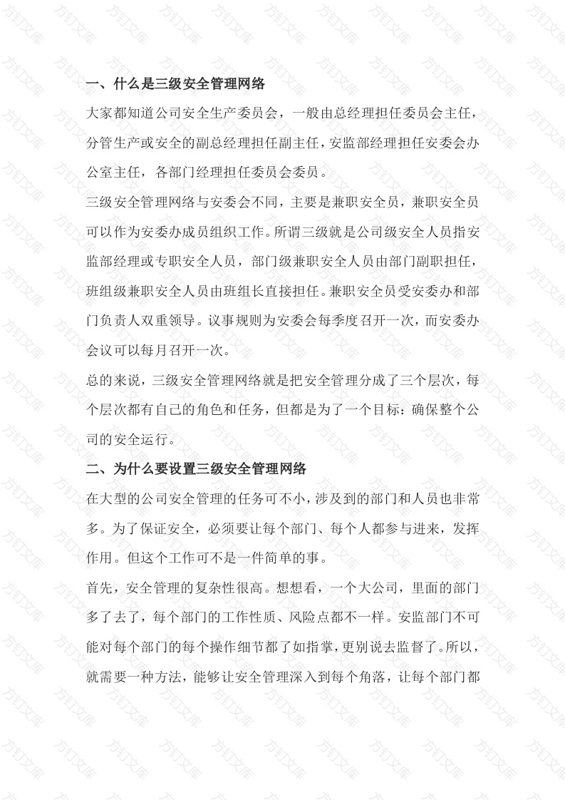 什么是三级安全管理网络大家都知道公司安全生产委员会,般由总经理担任委员会主任,分管生产或安全的副总经理担任副主任,安监部经理担任安委会办公室主任,各部门经理担任委员会委员。三级安全管理网络与安委会不同,主要是兼职安全员,兼职安全员可以作为安委办成员组织工作。所谓三级就是公司级安全人员指安监部经理或专职安全人员,部门级兼职安全人员由部门副职担任,班组级兼职安全人员由班组长直接担任。兼职安全员受安委办和部门负责人双重领导。议事规则为安委会每季度召开一次,而安委办会议可以每月召开一次。总的来说,三级安全管理网络就是把安全管理分成了三个层次,每个层次都有自己的角色和任务,但都是为了一个目标:确保整个公司的安全运行。二、为什么要设置三级安全管理网络在大型的公司安全管理的任务可不小,涉及到的部门和人员也非常多。为了保证安全,必须要让每个部门、每个人都参与进来,发挥作用。但这个工作可不是一件简单的事。首先,安全管理的复杂性很高。想想看,一个大公司,里面的部门多了去了,每个部门的工作性质、风险点都不一样。安监部门不可能对每个部门的每个操作细节都了如指掌,更别说去监督了。所以,就需要一种方法,能够让安全管理深入到每个角落,让每个部门都能按照统一的标准来操作,同时又能针对自己的具体情况做出适当的调整其次,管理上的事包括安全管理都是些大而化之的政策,具体到车间、到工人头上,可能就不知道具体该怎么做了。这个网络就是为了把安全管理细化,让每个层级都知道自己的职责和要做的事。这时候,三级安全管理网络就派上用场了。它其实就是一个分层管理的模式。在这个模式下,公司的安全管理责任被清晰地分配到了不同的层级。每个层级都有自己的职责范围和操作规范,从管理层到车间,再到每一个工作岗位,形成了一个覆盖全公司的安全管理网这样一来,安全管理就不再是安监部门一家的事了,而是变成了每个人的事。这种分层管理的好处就在于,它既保证了管理的全面性,也提高了针对性和时效性。每个部门都能在确保安全的前提下,根据自己的实际情况来调整和优化安全操作。三、三级安全管理落实主要做什么1.传达和落实安全指示与管理规定最重要的,就是这个网络能把公司层面的安全指令和精神,连同管理规定和工作要求,一层一层传递下去。这就像是播种机一样,把种子均匀地播撒到每块土地上。这样一来,从高层到基层,每个人都能清楚地知道公司的最新安全万政策是什么,以及自己应该怎么做。2实施部门级和班组级的安全工作另外,通过这个网络,部门和班组可以有效地开展安全培训、进行安全检查和组织安全活动。这就好比让每个人都能拿到一张地图,清楚地知道自己在安全这条路上该怎么走。因为有了这个网络,并且每个层级的责任人都明确了,安全工作就能更加有条不紊,更责任到人。这样,就能避免出现管理上的空白或者混乱。首先,最上面那层,就是企业层面。这就像是大老板们做的事情。他们不直接操作机器,但得做出大的决策,比如定安全政策,制定规章制度,就像定家规一样。这层的决定,会影响到整个公司的安全管理。然后,中间那层,是部门或者车间层面。这里的人就像是管理者,得把老板的决策变成具体的工作计划。他们得确保车间里的工作符合安全标准,比如培训员工,检查设备,确保一切按规矩来最后,底层是现场操作层面。这儿的人就是实际干活的工人。他们要按照规定操作机器,确保自己和同事的安全。这层最接近实际操作,所以安全意识和行为都特别重要。