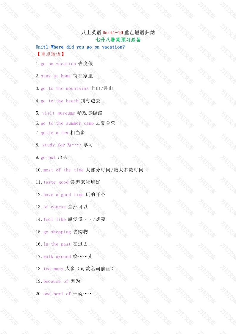 首页公共专业其他八年级上英语Unit1-10重点短语归纳