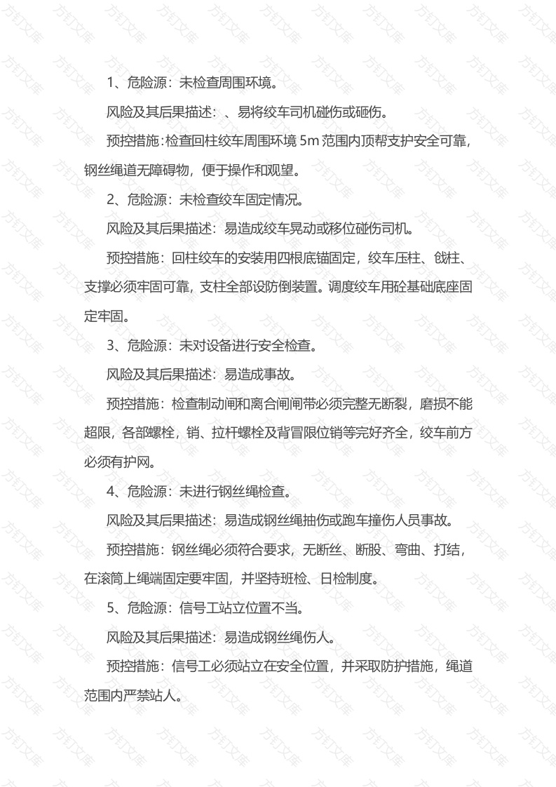 危险源:未检查周围环境。风险及其后果描述:、易将绞车司机碰伤或砸伤。预控措施:检查回柱绞车周围环境5范围内顶帮支护安全可靠,钢丝绳道无障碍物,便于操作和观望。2、危险源:未检查绞车固定情况。风险及其后果描述:易造成绞车晃动或移位碰伤司机。预控措施:回柱绞车的安装用四根底锚固定,绞车压柱、戗柱支撑必须牢固可靠,支柱全部设防倒装置。调度绞车用砼基础底座固定牢固。3、危险源:未对设备进行安全检查风险及其后果描述:易造成事故。预控措施:检查制动闸和离合闸闸带必须完整无断裂,磨损不能超限,各部螺栓,销、拉杆螺栓及背冒限位销等完好齐全,绞车前方必须有护网。4、危险源:未进行钢丝绳检查风险及其后果描述:易造成钢丝绳抽伤或跑车撞伤人员事故预控措施:钢丝绳必须符合要求,无断丝、断股、弯曲、打结在滚筒上绳端固定要牢固,并坚持班检、日检制度。5、危险源:信号工站立位置不当。风险及其后果描述:易造成钢丝绳伤人预控措施:信号工必须站立在安全位置,并采取防护措施,绳道范围内严禁站文危险源:信号工不按照规定信号指令发送风险及其后果描述:①易造成误拉车,酿成事故:②出现事故后不能级时停车,使事故扩大。预控措施:信号工必须准确无误的进行信号传输,以确保车辆的正常运行。7、危险源:导向轮未使用专用连接装置。风险及其后果描述:易造成连接装置断裂导向轮或钢丝绳伤人,预控措施:①回撤支架地点必须使用导向轮配合150大链固定,②人员严禁进入绳道范围。8、危险源:拉架过程中强拉硬拽。风险及其后果描述:易造成钢丝绳断绳伤人预控措施:①回撤支架前必须提前将工作面浮煤清理干净;②拉架过程中发现支架底座前淤煤或钻底现象,必须先处理后再拉架;③严禁强拉硬拽。9、危险源:三角区维护不到位风险及其后果描述:易造成三角区冒顶,支架压住抽架困难。预控措施:三角区维护必须及时到位,支柱不得少于12根且设防倒,最前一排柱子距被抽架间隙不得超过200mm。10、危险源:绞车运行中信号工离开操作台。风险及其后果描述:易造成遇问题不能及时停车预控措施:①绞车运行过程中,操作人员不得离开操作台;②信号工要盯住所拉设备,如遇情况立即打停机信号。11、危险源:绞车未实行远方操作按钮。风险及其后果描述:易造成遇问题不能级时停车预控措施:绞车必须远程控制,严禁在开关上直接操作12、危险源:行人时行车、行车时行人。风险及其后果描述:易出现运行车辆碰伤或挤伤人员事故。预控措施:绞车运行时严禁人员在运输区域行走;运输区域有作业或行走时严禁开绞车;绞车运行期间必须设好警戒。13、危险源:提升速度不平稳。风险及其后果描述:易造成翻架事故。预控措施:拉运支架过程中,要保持匀速运行。万14、危险源:用支柱顶架。风险及其后果描述:易造成柱滑或柱断伤人。预控措施:用单体支柱顶架时,①是选择可靠支点;②是单体柱与支架接触点必须垫木托板或废皮带;③是升支柱时必须实行远方操15、危险源:导向轮与支架区域内有人作业风险及其后果描述:易造成人员伤亡。预控措施:导向轮与支架区域内严禁有人作业。万方万万