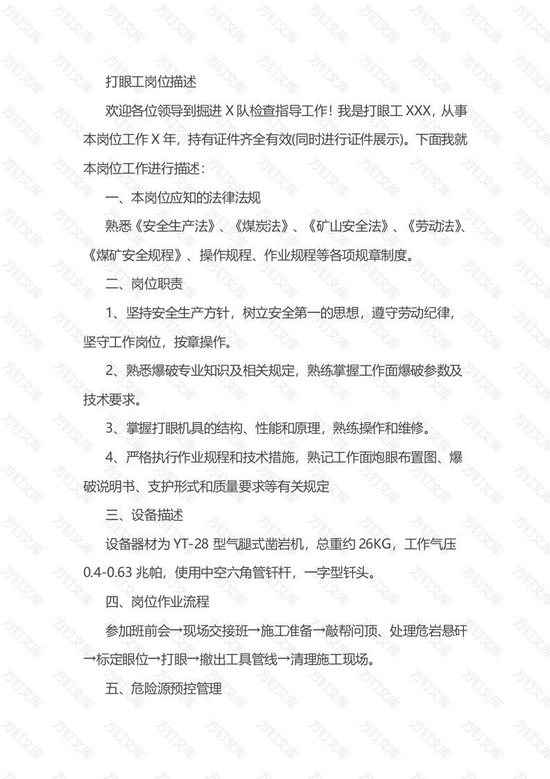打眼工岗位描述欢迎各位领导到掘进X队检查指导工作!我是打眼工XXX,从事本岗位工作X年,持有证件齐全有效(同时进行证件展示)。下面我就本岗位工作进行描述:一、本岗位应知的法律法规熟悉《安全生产法》、《煤炭法》《矿山安全法》《劳动法》《煤矿安全规程》、操作规程、作业规程等各项规章制度二、岗位职责1、坚持安全生产方针,树立安全第一的思想,遵守劳动纪律,坚守工作岗位,按章操作。2、熟悉爆破专业知识及相关规定,熟练掌握工作面爆破参数及技术要求。3、掌握打眼机具的结构、性能和原理,熟练操作和维修4、严格执行作业规程和技术措施,熟记工作面炮眼布置图、爆破说明书、支护形式和质量要求等有关规定三、设备描述设备器材为YT-28型气腿式凿岩机,总重约26KG,工作气压0.4-0.63兆帕,使用中空六角管轩杆,一字型钎头。四、岗位作业流程参班前会一→现场交接班→施工准备一→敲帮问顶、处理危岩悬矸标定眼位→打眼→撤出工具管线一→清理施工现场。五、危险源预控管理危险源存在的主要项目(1)活矸、危岩、煤体松动砸伤(2)永久支护失效砸伤。(3)操作钻杆、钻机不当砸伤或夹伤。(4)留有瞎爆、残爆崩伤。(5)风水管路连接不牢砸伤方(6)瓦斯突出及透水伤人2、消除危险源的方法措施(1)严格执行敲帮问顶。(2)接班验收、处理。(3)扎紧袖口、严禁戴手套扶钻管吹、拉脚线。(4)按规定处理严禁镐匏刨、(5)定时、定期检查,确保管路完好。(6)撤人、制定专项措施处理六、设备常见故障敏处理故障一:凿岩速度降低处理方法:1、缩短输气管路长度。2、按规定注油。方方故障二:水针折断处理方法:1、更换活塞。2修整钎尾万故障三:气水联动失灵处理方法:1、更换弹簧。2更换密封件。3检查并排椰除水管和注水阀气、水路的堵塞物。避灾路线(根据井下实际工作地点,职工自述,合理选择避灾路线)岗位精细管理要求及标准1、打眼时,施工人员必须集中精力,注意观察钻进情况,掌握好打眼的位置、方向、角度、深度等技术要求。钻杆不得摇摆晃动钻杆下方不得站人。打眼机具各有其位,严禁乱丢乱放,达到文明生产标准3、坚持“敲帮问顶”制度,严禁空顶作业。严格按中腰线施工严禁干打眼。严禁打眼与装药平行作业或在残眼内打眼。打眼前,连接好风水管路,保证风水管路畅通,连接可靠。九、岗位创伤应急知识及措施出现紧急情况时,严格遵守“三先三后”的原则1、对室息(呼吸道完全堵塞)或心跳呼吸骤停的伤员,必须先复苏,后搬运。2、对出血伤员,先止血,后搬运文3、对骨折的伤员,先固定,后搬运。4、创伤急救的基本知识。分为:止血、固定心脏复苏。(1)止血:指压止血法劫加压上血法:2)固定:绷带与夹板;3)心脏复苏:工呼吸,心脏按压。文万万方万万万