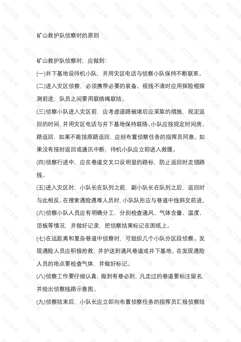 矿山救护队侦察时的原则万万矿山救护队侦察时,应做到:(一)井下基地设待机小队,并用灾区电话与侦察小队保持不断联系(二)进入灾区侦察,必须携带必要的装备。视线不清时应用探险棍探测前进,队员之间要用联络绳联结。(三)侦察小队进入灾区前,应考虑退路被堵后应采取的措施,规定返回的时间,并用灾区电话与井下基地保持联络。小队应按规定时间房路返回,如果不能按原路返回,应经布置侦察任务的指挥员同意。如果没有按时返回或通讯中断,待机小队应立即进入救援。(四)侦察行进中,应在巷道交叉口设明显的路标,防止返回时走错路(五)进入灾区时,小队长在队列之前,副小队长在队列之后,返回时与此相反。在搜索遇险遇难人员时,小队队形应与巷道中线斜交前进。(六)侦察小队人员应有明确分工,分别检查通风、气体含量、温度、顶板等情况,并做好记录,把侦察结果标记在困纸上。(七)在远距离和复杂巷道中侦察时,可组织几个小队分区段侦察。发现遇险人员应积极抢救,并护送到通风巷道或井下基地。在发现遇险人员的地点要检查气体,并做好标记。(八)侦察工作要仔细认真,做到有巷必到,凡走过的巷道要标注留名并绘出侦察线路示意图。(九)侦察结束后,小队长应立即向布置侦察任务的指挥员汇报侦察结救护队在井下前进时,救护队员要检测气体并评估现场条件。救护队要寻找遇险者的线索,确定火源。在救护队前进时,应将所有发现纪录在矿图上并报告新鲜风流基地。在侦察时,应该牢记救护队的安全是第一位的,救护遇险人员是第二位的,恢复矿井正常是第三位的。1·井下基地设待机小队,并用灾区电话与侦察小队保持不断联系。侦察小队进入灾区后发生紧急情况时,待机小队能够作为预备队及时进行救援。2进入灾区侦察,必须携带必要的装备。视线不清时应用探险棍探测前进,队员之间要用联络绳联结救护小队进行侦察应携带的装备在《煤矿救护规程》中作了具体的规定,都是完成侦察任务和保证救护小队自身安全所必需的,当灾区烟雾很大,视线不清时,对灾区内的积水、淤泥、暗井、溜煤眼,较深的水沟、地沟等不能准确避开,这时就需要用棍探测前进,为防止队员不慎坠落及保班队员之间的及时联系,队员之间要用联络绳联结这些规定都很是有必要的。3侦察小队进入灾区前,应考虑退路被堵后应采取的措施,规定返回的时间,并用灾区电话与井下基地保持联络。小队应按规定时间原路返回,如果不能按原路返回,应经布置侦察任务的指挥员同意。如果没有按原路返回或通讯中断,待机小队应立即进入救援。发生事故的灾区巷道支护被不同程度的破坏,虽经加固或临时支护但还是有拥塌的可能,所以小进入前要考虑退路被堵应采取的措施。主要考虑小队被堵后的生存及营救的方法,人力物力的准备。可以利用水管、压风管等给被堵人员输送空气、食物和水,同时侦察小队在侦察过程中也要利用现场的一些便利条件创造一些营救自己的有利条件。以便侦察小队万一被堵后能够迅速地组织营救。进入前与布置侦察任务的指挥员规定返回的时间,并用灾区电话与井下基地保持联络,以便及时得到救助。如果不能按原路返回,应经布置侦察任务的指挥员同意。体现了统一指挥问题,防止多人指挥造成混乱。4侦察行进中,应在巷道交叉口设立明显的路标,防止返回时走错路线。路标就是指引导行进路线的标志。路标可用粉笔画在支架及巷帮也可以用煤块、矸石、木板等放置。但要考虑到由于灾区温度、湿度可能很高,滴水等原因,用粉笔做的标记可能短时间失效。5进入灾区时,小队长在队列之前,副小队长在队列之后,返回时与此相反。在搜索遇险遇难人员时,小队队形应与巷道中线斜交前进。这样既可防止小队人员混乱,造成丢人,又有利于搜索遇险遇难人员保证全断面的搜索。6在救护队前进时,侦察小队人员应有明确的分工,分别检查通风气体含量、温度、顶板等情况,并做好纪录,把侦察结果标记在图纸上。队长还要标记勘察的区域,在以下要点处标记名字的缩写和日期:工作面、入口、联络横巷和有垮落物而不通的路、障碍物、风墙以及其他阻止救护队前进的要点。所有这些要点还应标记在矿图上。这种