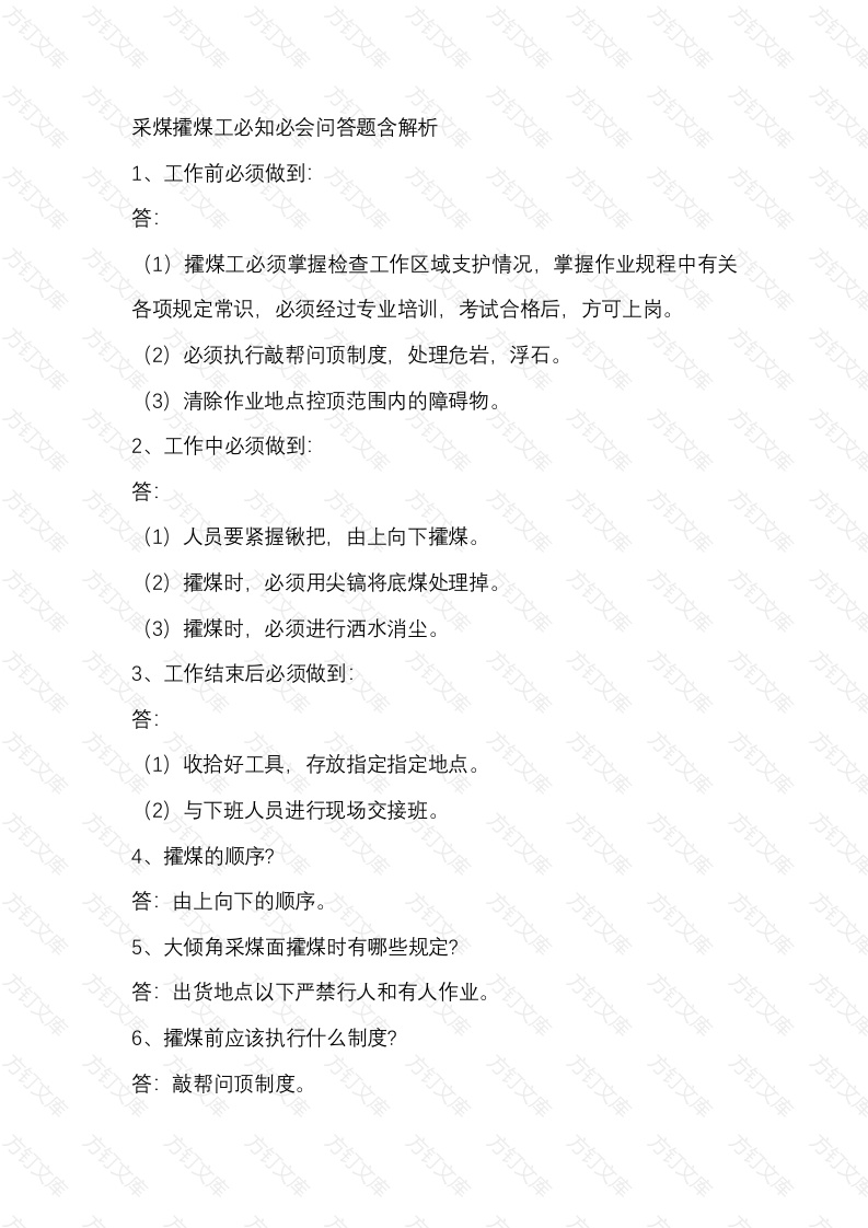 采煤攉煤工必知必会问答题含解析方1、工作前必须做到万文答(1)攉煤工必须掌握检查工作区域支护情况,掌握作业规程中有关各项规定常识,必须经过专业培训,考试合格后,方可上岗。必须执行敲帮问顶制度,处理危岩,浮石。(3)清除作业地点控顶范围内的障碍物。2、工作中必须做到答(1)人员要紧握锹把,由上向下攉煤(2))攉煤时,必须用尖镐将底煤处理掉。攉煤时,必须进行洒水消尘。方订3)3、工作结束后必须做到:方答1收拾好工具,存放指定指定地点。2)与下班人员进行现场交接班4、攉煤的顺序?方答:由上向下的顺序。5、大倾角采煤面攉煤时有哪些规定?答:出货地点以下严禁行人和有人作业。6、攉煤前应该执行什么制度?敲帮问顶制度。文方万万万攉煤时顶板完整时临时支柱间距应多少?答:1.5米。8、在顶板破碎,断层处攉煤临时支护支柱间距应多少?答:0.75米。9、攉煤工必须在什么的掩护下进行工作?答:临时顶子的掩护下,严禁空顶作业。10、攉煤时如遇大块煤时应如何处理?答:大块煤必须砸碎。11、煤壁伞檐超过规定多少,必须进行处理?答:1.0米以下煤层不得超过150毫米1.0米以上煤层不得超过200毫米。12、攉煤时应注意那些事项?答:应注意顶板、煤壁侧残炮及煤壁片帮,不许空顶作业。13、工作面在2平方米内浮煤平均厚度不得超过多少毫米:答:30毫米。14、采空区浮煤应如何处理?答:使用2.5米以上的长工具耙子向硬帮搂货,严禁人员进入采空区扫浮煤。15、什么叫煤尘堆积?答:连续长度大于5米,厚度超过2毫米的煤尘堆积。16、采煤工作面出煤时应该注意那些事项?答万万万1)不准空顶作业万不准进入采空区。(3)煤壁有伞檐及时处理。方订(4)不准跨溜子工作。17、采煤工作面“三防”指的是什么?答:防滑梁、防倒绳、防矸石窜入。18、什么是“三违”?答:违章指挥、违章作业、违反劳动组织纪律。19、“一通三防"中的三防指的是什么?答:防火、防瓦斯、防煤尘。文20、《操作规程》中对攉煤有哪些要求?方答:(1)握紧锹把从上向下攉煤。2)攉煤要见底,要注意支柱是否打在实底上;若打在浮煤上应先打好替柱。(3)在硬帮挖柱窝时,要注意煤壁片帮伤人。(4)大块煤必须砸碎。21、冒顶前有哪些预兆?答(1)(2)掉碴(3)片帮,(4)(5)脱层:(6)漏顶。22、出现冒顶时怎么办?答:不准回柱放顶,必须将所有人员撤离工作面,待压力稳定,经带文
