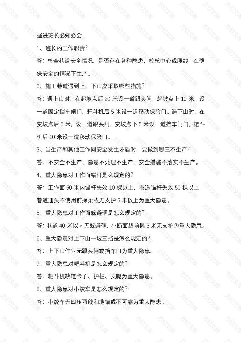 掘进班长必知必会1、班长的工作职责?答:检查巷道安全情况,是否存在各种隐患,校核中心或腰线在确保安全的情况下生产。2、施工巷道遇到上、下山应采取哪些措施?答:遇上山时,在起坡点后20米设一道跟头闸,起坡点上10米,设道固定挡车闸门,耙斗机后5米设一道移动保险门。遇下山时,变坡点后5米,设一道跟头闸,变坡点下5米设一道挡车闸门,耙斗机后10米设一道移动保险门。3、当生产和其他工作同安全发生矛盾时,要做到哪三不生产?答:不安全不生产、隐患不处理不生产、安全措施不落实不生产4、重大隐患对工作面锚杆是么规定的?答:工作面50米内锚杆失效10棵以上,巷道锚杆失效50棵以上巷道迎头不使用前探梁或无支护5米以上为重大隐患。5、重大隐患对工作面躲避硐是怎么规定的?答:巷道40米以内无躲避硐,小断面超前掘3米无支护为重大隐患。6、重大隐患对上下山一坡三挡是怎么规定的?答:上下山作业无跟头闸或挡车门为重大隐患。7、重大隐患对耙斗机是怎么规定的?答:耙斗机缺道卡子、护栏、支腿为重大隐患。8、重大隐患对小绞车是怎么规定的?答:小绞车无四压两戗和地锚或不可靠为重大隐患。万重大隐患对反向拉车是怎么规定的?答上山17以上,反向拉车滑轮无双向固定或不可靠为重大隐患10、重大隐患对工作面轨道的夹板怎么规定的?答:施工巷道使用半截夹板,少上螺丝三副以上为重大隐患。11、重大隐患对工作面特殊支护是怎么规定的?答:过断层、见煤点、破碎带、斜交或走向3米无特殊支护或不可靠为重大隐患。12、重大隐患对工作面干打眼和消尘是怎么规定的?方答:干打眼、不消尘为重大隐患。13、煤尘达到什么程度为重大隐患?答:积尘厚5mm,面积2平方以上为重大隐患14、重大隐患对火工品是怎么规定的?答:放炮线长度不符规定,明火放炮、动力放炮,火工品管理混乱残炮处理不符合规定为重大隐患。15、重大隐患对工作面风筒是怎么规定的?答:不使用防炮崩风筒或放炮掐风筒为重大隐患。16、不带便携是重大隐患吗?答:是,区队长、放炮员、班长及电钳工入井必须佩带便携。17、特大隐患对工作面冒顶是怎么规定的?答:冒顶长度3米以上,冒高是巷道中高一倍以上为特大隐患18、特大隐患对工作面煤尘是怎么规定的?答:严重积尘厚度10mm,连续长度10m以上为特大隐患,19、特大隐患对带烟、带火是怎么规定的?答:井下带烟、带火、吸烟为特大隐患。20、特大隐患对风门是怎么规定的?答:支风门为特大隐患。21、瓦斯爆炸的三个条件?答:氧气浓度大于12%、瓦斯浓度在5%-16%之间、点燃温度在650-750摄氏度且火源存在时间大于瓦斯爆炸感应期。22、煤尘爆炸的条件?答:(1)煤尘本身具有爆炸性;(2)空气中浮游煤尘含量30-50克立方米至2000克/立方米;(3)由点燃煤尘的引爆火源,温度为650-1050摄氏度以上;(4)氧气含量不低于18%。23、掘进工作面临时停风在恢复通风前应做好哪些准备工作?答:必须检查瓦斯,局扇及开关附近10米内风流中瓦斯浓度不超过0.5%,方可开局扇。24、井下发生火灾时的措施有哪些?答:(1)对于电器引起的火灾首先应切断电源,然后迅速采取灭火措(2)如引燃煤炭最好是挖出火源,或用沙子黄土压住火源。25、井下发生水灾时的措施有哪些?答:人员应迅速撤到上巷水平,切不可往死头上山撤退26、瓦斯传感器悬挂位置有什么要求?答:应垂直悬挂,距顶板不得大于300mm,距巷道侧壁不小于200mm。27、井下发生事故时应如何行动?万文文