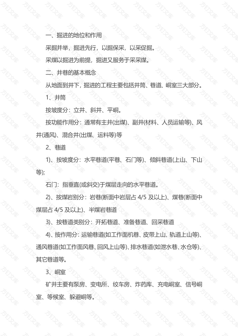 掘进的地位和作用采掘并举,掘进先行,以掘保采,以采促掘。采煤以掘进为前提,掘进又服务于采采煤。万井巷的基本概念从地面到井下,掘进的工程主要包括井筒、巷道、峒室三大部分。1、井筒按坡度分:立井、斜井、平峒。按功能作用分:通常有主井(出煤)副井材料、人员运输等)、风运料等)等2、巷道1)、按坡度分:水平巷道(平巷、石门等)、倾斜巷道(上山、下山等)石门:指垂直(或斜交)于煤层走向的水平巷道2)、按煤岩别分:岩巷(断面中岩层占4/5及以上)、煤巷(断面中煤层占4/5及以上)、半煤岩巷道3)、按巷道类别分:开拓巷道、准备巷道、回采巷道4)、按作用分:运输巷道(如工作面机巷、皮带上山、轨道上山等)通风巷道(如工作面风巷、回风上山等)、排水巷道(如世水巷、水仓等)其它巷道等。3、峒室矿井主要有泵房、变电所、绞车房、炸药库、充电峒室信号峒室、等候室、躲避峒等。文4断面形状主要有折线形(如矩形、梯形、斜梯形等)和曲线形队拱形、圆形马蹄形、椭圆形等)两大类,应用多的主要有拱形、梯形、矩形(斜矩形、圆形,其它还有马蹄形、椭圆形、斜梯形等。我矿采用的主要有拱形、梯形、矩形斜各种断面形状优劣顺序为:巷道稳定性、承压受力方面:圆形一马蹄形、椭圆形一→拱形一梯巷道断面利用率方面:梯形、矩形→拱形一马蹄形一→圆形,施工难易方面:钻爆法掘进:梯形、矩形一→拱形一马蹄形一圆形拱形巷道又主要分直墙半圆拱形、直墙三心拱形、直墙圆弧拱形等,对于底鼓严重的巷道还设底板反拱。它主要用于巷道服务时间长、顶底板压力大的开拓、准备巷道或回采巷道。梯形巷道主要用于顶底板压力不是太大、侧压相对较大、服务时间不是太长的回采巷道或准备巷道,有时也用于压力不大的开拓巷道(特别是小型矿井)。矩形巷道主要用于巷道压力不是太大、沿煤层掘进的准备巷道和回采巷道。圆形巷道主要用于立井、煤仓等井巷、峒室,以及压力和变形都很大的开拓巷道(极软岩巷道等。巷道支护文文万万支护形式单一支护:主要有锚杆支护、喷浆(喷射混凝土)支护、棚式支架支护,联合支护:主要有锚喷支护、架棚喷支护、主动支护:锚杆支护、喷浆(喷射混凝土)支护、锚喷支护被动支护:砌碹支护、棚式支架支护、架棚喷支护,2、支护形式的主要优缺点锚杆支护、喷浆(喷射混凝土)支护、锚喷支护等:能充分发挥围岩自身的作用和承载能力,使围岩和支护体形成一个整体的结构,共同承担围岩的压力和变形,是一种主动的支护方式,它成本较低,便于实现平行交叉作业,有利于组织快速施工。应用范围较广,是值得推广的主要支护形式。彻碹支护、棚式支架支护、架棚喷支护等:是一种被动的支护方式,它主要靠支护体被动的承受围岩的压力和变形,不能有效的发挥围岩自身的作用和承载能力。也不利于组织快速施工,应用条件受到定的限制,不能作为推广的主支护形式,只能拥于一些特定的巷道各种支护的组成和施工1)锚杆支护锚杆分类按锚杆与被支护岩体锚固方式,分为机械式粘结式和摩擦式三类