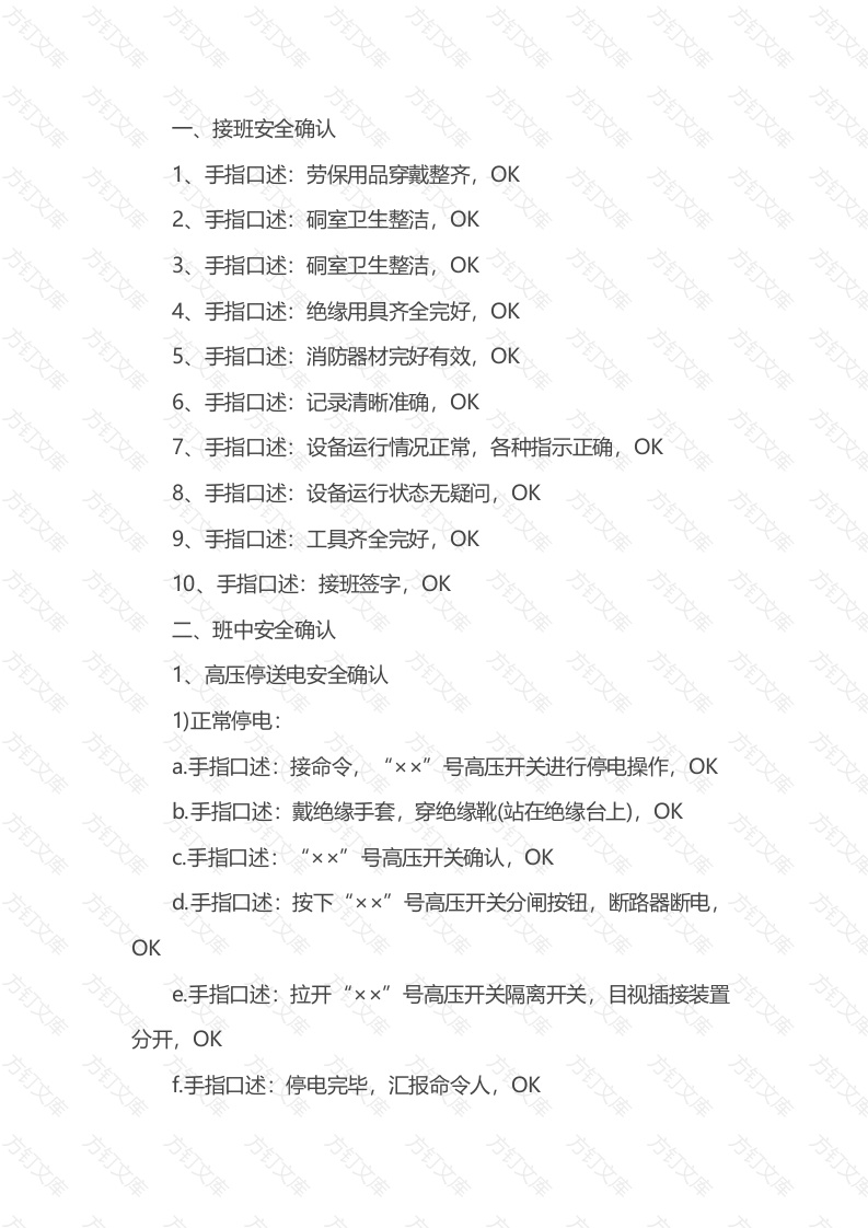 文接班安全确以手指口述:劳保用品穿戴整齐,手指口述:硐室卫生整洁,OK3、手指口述:硐室卫生整洁,OK4手指口述:绝缘用具齐全完好,OK5、手指口述:消防器材完好有效,OK万6、手指口述:记录清晰准确,OK手指口述:设备运行情况正常,各种指示正确,OK手指口述:设备运行状态无疑问,OK9、手指口述:工具齐全完好,OK10手指▣述:接班签字,OK二班中安全确认1、高压停送电安全确认7万文1)正常停电:a手指口述:接命令号高压开关进行停电操作,OKb.手指口述:戴绝缘手套,穿绝缘靴(站在绝缘台上),OKc手指口述:号高压开关确认,OKd手指口述:按下“××”号高压开关分闸按钮,断路器断电Ke手指口述:号高压开关隔离开关目视插接装置分开,OKf手指口述:停电完毕,汇报命令人,OK文万文手指口述:进行记录,OK2)正常送电a手指口述:接命令,号高压开关进行送电操作,OKb.手指口述:戴绝缘手套,穿绝缘靴站在绝缘台上),OKc手指口述:号高压开关确认,OKd手指口述:号高压开关隔离开关,目视插接装置OKe手指口述:按下号高压开关合闸按钮,断路器合上OKf.手指口述:观察仪表正常,OKg手指口述:送电完毕,汇报命令人OKh.手指口述:进行记录,3)故障停送电:a.手指口述号高压开关故障停电,显示故障,b.手指口述:汇报调度室汇报大队值班室,OKC手指口述:接命令,“××”号高压开关故障排除,进行送电操作,OKd.手指口述Xx号高压开关确认,OK文e手指口述:手指口述:按下“×ד号高压开关合闸按钮,断路器合上,OKf手指口述:观察仪表正常,OK万g.手指口述:送电完毕,汇报命令人OK方h.手指口述:进行记录,OK2、低压停送电安全确认1)正常停电a手指口述:接命令XX号低压开关进行停电操作,OKb.手指口述号低压开关确认,OK文c手指口述:按下“××”号低压开关分闸按钮,断电,OKd.手指口述:拉开号低压开关隔离开关,OKe.手指口述:停电完毕,汇报命令人,OKf手指口述:进行记录,OK2)正常送电a.手指口述:接命令,号低压开关进行送电操作OKb.手指口述XX"号低压开关确认,OK号低压开关隔离开关,OKd.手指口述:按下“××”号低压开关合闸按钮,合上,OK方e.手指口述:观察仪表正常,OKf手指口述:送电完毕,汇报命令人OKg手指口述:进行记录,(OK3)故障停送电:a.手指口述号低压开关故障停电,故障,b.手指口述:汇报调度室:汇报大队值班室OK!万