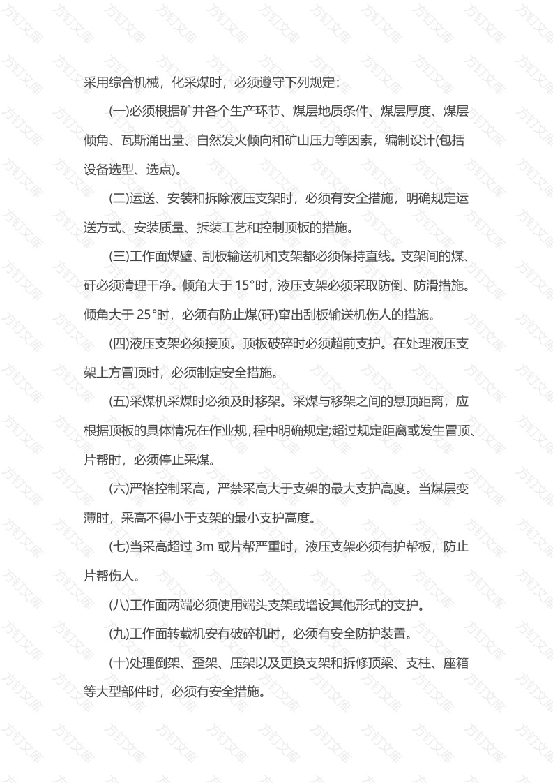 采用综合机械,化采煤时,必须遵守下列规定(一)必须根据矿井各个生产环节、煤层地质条件、煤层厚度、煤层倾角、瓦斯涌出量、自然发火倾向和矿山压力等因素,编制设计(包括设备选型、选点)。(二)运送、安装和拆除液压支架时,必须有安全措施,明确规定运送方式、安装质量、拆装工艺和控制顶板的措施。(三)工作面煤壁、刮板输送机和支架都必须保持直线。支架间的煤矸必须清理干净。倾角大于15°时,液压支架必须采取防倒、防滑措施。倾角大于25时,必须有防止煤(矸)窜出刮板输送机伤人的措施。(四)液压支架必须接顶。顶板破碎时必须超前支护。在处理液压支架上方冒顶时,必须制定安全措施。(五)采煤机采煤时必须及时移架。采煤与移架之间的悬顶距离,应根据顶板的具体情况在作业规,程中明确规定;超过规定距离或发生冒顶、片帮时,必须停止采煤。(六)严格控制采高,严禁采高大于支架的最大支护高度。当煤层变薄时,采高不得小于支架的最小支护高度。(七)当采高超过3或片帮严重时,液压支架必须有护帮板,防止片帮伤人。(八)工作面两端必须使用端头支架或增设其他形式的支护(九)工作面转载机安有破碎机时,必须有安全防护装置。(什)处理倒架、歪架、压架以及更换支架和拆修顶梁、支柱、座箱等大型部件时,必须有安全措施文)工作面爆破时,必须有保护液压支架和其他设备的安全措施。(十二)乳化液的配制、水质、配比等,必须符合有关要求。泵箱应设自动给液装置,防止吸空。【解读】本条是关于采用综合机械化采煤时必须遵守的规定综合机械化回采工艺简称"综采”,即破(爆破、装(装煤)、运(运煤)支(支护)、处(处理采空区)五个主要工序全部实现机械化。综采生产效辛高,劳动强度低,作业环境得到改善有利于实现安全生产。但综采设备多,体积大,技术含量高,要求地质条件、煤层赋存状况及操作者的技能等相关条件必须适应,这样才能发挥综采的优势。(1)综采的适应性较差,安装、拆除困难,在编制设计时,应充分考虑各种因素,以便进行设备选型和工作面布置。另外液压支架的重量一般在十几吨以上体积大加之巷道空间狭窄在运送、安装和拆除时极易发生事故,尤其是在安装、拆除时还容易发生顶板事故,因此必须根据工作面具体情况合理确定安装、拆除顺序制定安全措施。(2)综采工作面的"三直"是指,煤壁直、刮板输送机和支架直。①由于工作面煤壁不直,使支架出现前后交错,局部地段空顶距必然加大,同时也给推移输送机造成困难。②刮板输送机弯曲易造成采煤机掉道和输送机掉链。③液压支架不直,矸石易窜入支架内,处理不及时可能造成死架还可能使支架受力不均。文文万万万万支架间的煤、矸必须清理干净,主要是为移架创造良好条件,保证支架架设质量。当工作面倾角大于15°时,液压支架很容易倾倒,目前生产的液压支架,在设计时一般有防倒功能,但由于回采工作面生产的多变性,加之其他因素,所以,当工作面倾角大于15时,液压支架必须采取相应的防倒、防滑措施。当工作面倾角大于25时,刮板输送机内的煤(矸)很容易窜出伤人般可采取在刮板输送机两侧加防护板的措施加以防治。(3)液压支架必须接顶,若液压支架不接顶,顶板与支架间有空顶,势必造成顶板离层、下沉,顶板出现台阶状,使支架前移困难,极易发生架间冒顶和超前冒顶事故。(4)液压支架的支护方式,根据液压支架的型式、结构、移动方式和支护条件不同,可分为及时支护和滞后支护两种。及时支护是在采煤机割煤后先移支架(承压或降架移步),再移输送机。适用于顶板中等稳定以下或煤壁片帮较严重的工作面。滞后支护是在采煤机割煤后先移输送机,再移支架。适用于顶板中等稳定以上的工作面。无论采用哪种支护方式,采煤机与液压支架的距离,都不得超过作业规程的规定,确因超过规定距离发生冒顶、片帮时,应立即妥善处理,否则禁止采煤。(5)综采工作面的采高必须与液压支架的支撑范围相适应,采高如果大于支架的最大支护高度,支架将无法有效地支撑控制顶板。采高如果小于支架的最小支护高度,支架无法正常工作,甚至被压死。