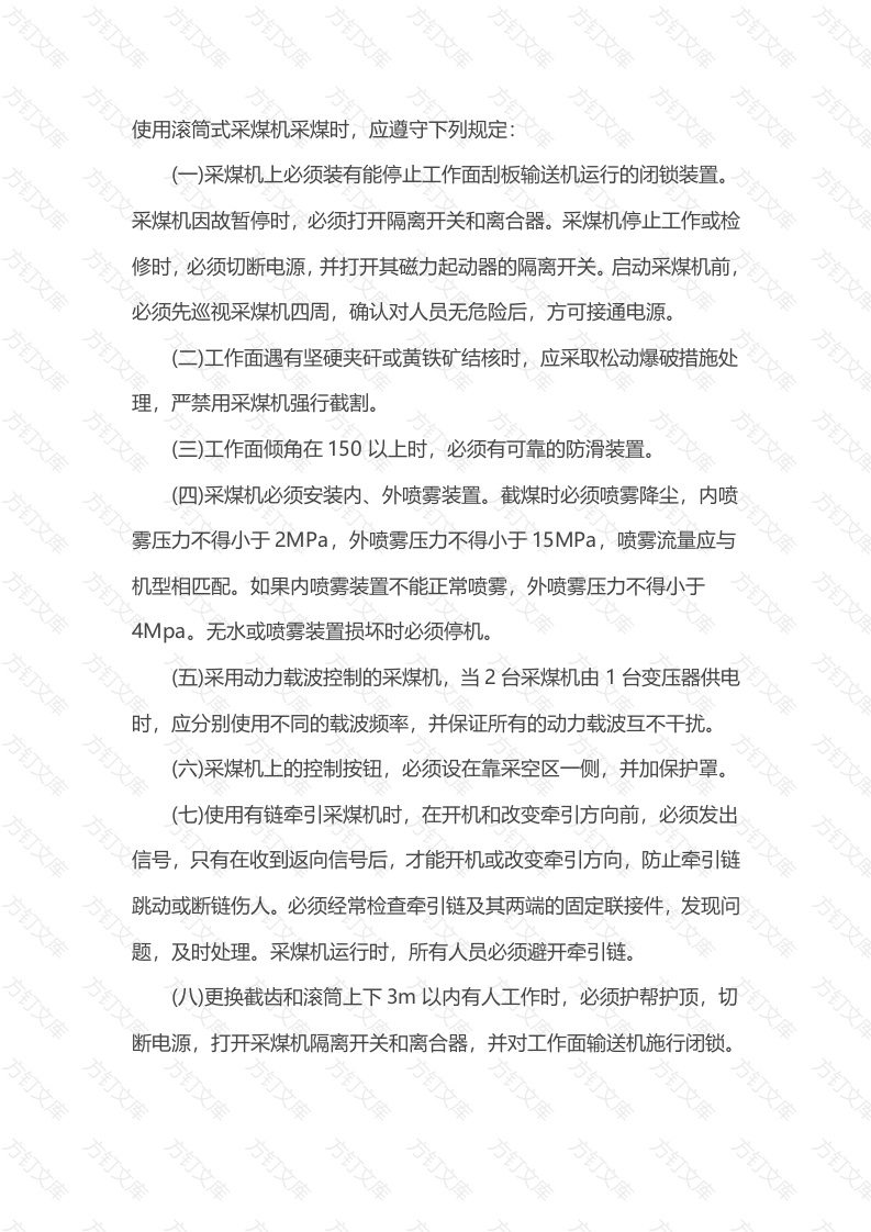 使用滚筒式采煤机采煤时,应遵守下列规定:(一)采煤机上必须装有能停止工作面刮板输送机运行的闭锁装置。采煤机因故暂停时,必须打开隔离开关和离合器。采煤机停止工作或检修时,必须切断电源,并打开其磁力起动器的隔离开关。启动采煤机前,必须先巡视采煤机四周,确认对人员无危险后,方可接通电源。(二)工作面遇有坚硬夹矸或黄铁矿结核时,应采取松动爆破措施处理,严禁用采煤机强行截割。(三)工作面倾角在150以上时,必须有可靠的防滑装置。(四)采煤机必须安装内、外喷雾装置。截煤时必须喷雾降尘,内喷雾压力不得小于2MPa,外喷雾压力不得小于15MPa,喷雾流量应与机型相匹配。如果内喷雾装置不能正常喷雾,外喷雾压力不得小于4Mpa。无水或喷雾装置损坏时必须停机。(五)采用动力载波控制的采煤机,当2台采煤机由1台变压器供电时,应分别使用不同的载波频率,并保证所有的动力载波互不干扰。(六)采煤机上的控制按钮,必须设在靠采空区一侧,并加保护罩。(七)使用有链牵引采煤机时,在开机和改变牵引方向前,必须发出信号,只有在收到返向信号后,才能开机或改变牵引方向,防止牵引链跳动或断链伤人。必须经常检查牵引链及其两端的固定联接件,发现问题,及时处理。采煤机运行时,所有人员必须避开牵引链。(八)更换截齿和滚筒上下3以内有人工作时,必须护帮护顶,切断电源,打开采煤机隔离开关和离合器,并对工作面输送机施行闭锁。(九)采煤机用刮板输送机作轨道时,必须经常检查刮板输送机的溜槽联接、挡煤板导向管的联接,防止采煤机牵引链因过载而断链;采煤机为无链牵引时,齿(销、链)轨的安设必须紧固、完整,并经常检查。必须按作业规程规定和设备技术性能要求操作、推进刮板输送机。【解读】本条是关于使用滚筒采煤机时应遵守的规定。"综采“是采煤方法的改进和提高,其优越性显而易见,安全系数也大大增加。然而由于维护、保养不当,安全装置失灵和误操作等原因,仍可以发生各种事故。例如:采煤机掉道,滚筒绞人事故。刮板输送机断链伤人、飘链伤人、机头翻翘碰人、机尾翻翘碰人、溜槽拱翘碰人以及运料碰人和在溜槽上摔倒等事故。因此,在各工种操作中,应相互协同、配合,严格执行”三大规程“及各项规章制度,确保安全装置的灵活、可靠,做到安全生产。(1)采煤机司机是操纵采煤机运行,滚筒割煤工作的,随时都可能发生意想不到的问题,如采煤机事故,刮板输送机事故,此时若不及时关停刮板输送机,必然发生事故和使事故扩大。刮板输送机的控制是在顺槽操纵的,由于距离远,还要发出信号、作出反应,势必贻误战机,因此,要求在采煤机上必须装有能停止刮板输送机运行的装置,一旦发生事故在工作面能停止刮板输送机运行。当事故和隐患未处理完毕时,顺槽操纵台无法启动刮板输送机,所以要求此装置具有闭锁功能。采煤机司机除了停止采煤机的牵引和摇臂的升降外,还必须打开离合器停止滚筒转动。在回采过程中,由于特殊情况(铺网、补网、更换截齿、处理片帮及刮板输送机故障等),人员有时需到煤壁一侧去作业当距滚筒很近时,必须保证滚简不能转动与电机分开,以防止一旦触动开关,滚筒转动将人绞入。1991年7月19日,抚顺矿务局某矿综采队,带班队长到煤壁侧处理片帮,不慎摔倒在滚筒旁,此时恰巧移架加之控制按钮未加保护罩,一木料触动启动按钮,又未打开离合器,滚筒转动将队长绞入滚筒,当场死亡。据统计,采煤机滚筒割人事故死亡人数占采煤机总死亡人数的40%左右。采煤机停止工作或检修时,必须切断电源,并打开其磁力起动器的隔离开关,以防止人员误操作和违章操作及其他原因引起采煤机未按规定启动,发生事故。启动采煤机前不事先巡视采煤机四周情况,一旦有人停留和通过,也容易发生事故,所以要求必须经巡视后,确认无危险后,方可接通电源。(2)工作面遇有坚硬夹矸或黄铁矿结核时,严禁采煤机强行截割。此项规定主要是考虑到,强行截割易产生火花而引起瓦斯和煤尘爆炸。另外强行截割还可加速截齿的磨损和损坏。当工作面倾角超过15以上时,无论是采煤机还是液压支架等,都容易滑移和倾倒,因此,当工作面倾角超过15以上时,必须有可靠的防滑装置。(3)在机采工作面采煤机割煤时,粉尘的产生量占整个采煤工作面个循环产尘量的70%~85%。为抑制采煤机工作时产生的粉尘,改善采煤工作面的劳动条件,避免滚筒截割夹矸时产生的火花引起煤尘或瓦斯爆炸事故发生,要求采煤机必须安装内外喷雾装置,割煤时必须喷雾降尘