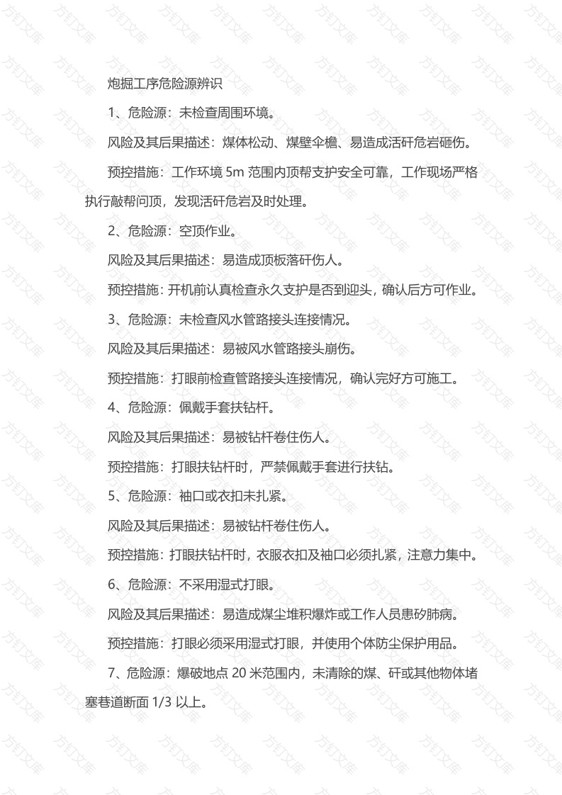 炮掘工序危险源辨识危险源:未检查周围环境。风险及其后果描述:煤体松动、煤壁伞檐、易造成活矸危岩砸伤。预控措施:工作环境5m范围内顶帮支护安全可靠,工作现场严格执行敲帮问顶,发现活矸危岩及时处理。2、危险源:空顶作业。风险及其后果描述:易造成顶板落矸伤人预控措施:开机前认真检查永久支护是否到迎头,确认后方可作业。3、危险源:未检查风水管路接头连接情况。风险及其后果描述:易被风水管路接头崩伤。预控措施:打眼前检查管路接头连接情况,确认完好方可施工方4、危险源:佩戴手套扶钻杆。风险及其后果描述:易被钻杆卷住伤人。预控措施:打眼扶钻杆时,严禁佩戴手套进行扶钻。5、危险源:袖口或衣扣未扎紧。风险及其后果描述:易被钻杆卷住伤人预控措施:打眼扶钻杆时,衣服衣扣及袖口必须扎紧,注意力集中。6、危险源:不采用湿式打眼。风险及其后果描述:易造成煤尘堆积爆炸或工作人员患矽肺病。预控措施:打眼必须采用湿式打眼,并使用个体防尘保护用品。7危险源:爆破地点20米范围内,未清除的煤、矸或其他物体堵塞巷道断面1/3以上风险及其后果描述:易造成瓦斯爆炸事故。预控措施:放炮员必须严格把关,爆破地点20米范围内,巷道断面达到2/3以上,方可装药、爆破。8、危险源:爆破地点附近20m以内风流中瓦斯浓度达到1.0%。风险及其后果描述:易造成瓦斯爆炸事故。预控措施:加强通风,待爆破地点附近20m范围内瓦斯浓度降到1.0%时,方可装药、爆破。9、危险源:装药放炮不规范。风险及其后果描述:易造成放炮伤人预控措施:必须一次装药一次爆破,严禁一次装药分次爆破。10、危险源:警戒距离位置设置不当。风险及其后果描述:易造成放炮伤人。预控措施:警戒距离:岩巷100米,煤巷75米,遇拐弯巷道超过30米时,拐过弯20米后,如未超过30米,必须严格执行岩巷100米,煤巷75米的规定放好警戒。11、危险源:不执行“三牌联锁”风险及其后果描述:易发生放炮伤人预控措施:工作面装药联线后,放炮员把警戒牌交给班组长,由班组长安排联络员在通往放炮地,点的各巷口设置警戒,确认工作面10米范围内支护完好后,班组长把放炮命令牌交给安全员,安全员再次确认后,把放炮牌交给放炮员,放炮员必须最后一个离开工作面,确认放炮地点无人后,到达指定地点后,吹哨三声,大喊三声“放炮了方可放炮。各巷口的警戒员未接到联络员的撤回命令不得撤回12、危险源:放炮地点出现拒爆、残爆。风险及其后果描述:易造成伤人事故。预控措施:处理拒爆、残爆时,必须在班组长指导下进行,并应在当班处理完毕。如果当班未能处理完毕,当班爆破工必须在现场向下班爆破工交接清楚。必须遵守以下规定:①由于连线不良造成的拒爆可重新连线起爆;②在距拒爆炮眼0.3m以外另打与拒爆炮眼平行的新炮眼,重新装药起爆;③严禁用镐刨或从炮眼中取出原放置的起爆药卷或从起爆药卷中拉出电雷管。不论有无残余炸药严禁将炮眼残底继续加深;严禁用打眼的方法往外掏药;严禁用压风吹拒爆(残爆)炮眼;④处理拒爆的炮眼爆炸后,爆破工必须详细检查炸落的煤、矸,收集未爆的电雷管;⑤在拒爆处理完毕以前,严禁在该地点进行与处理拒爆无关的工作。13、危险源:炮眼封泥长度不足或装药操作不当风险及其后果描述:易伤人或着火。预控措施:①炮眼深度小于0.6时,不得装药、在特殊条件下,如挖底、刷帮、挑顶确需浅眼爆破时,必须制定安全措施,炮眼深度可以小于0.6m,但必须封满炮泥;②炮眼深度为0.6-1m时,封泥长度不得小于炮眼深度的1/2;③炮眼深度超过1m时,封泥长度不得小于0.5m;④炮眼深度超过2.5m时,封泥长度不得小于1m;⑤光面爆破时,周边光爆炮眼应用炮泥封实,且封泥长度不得小于0.3m;